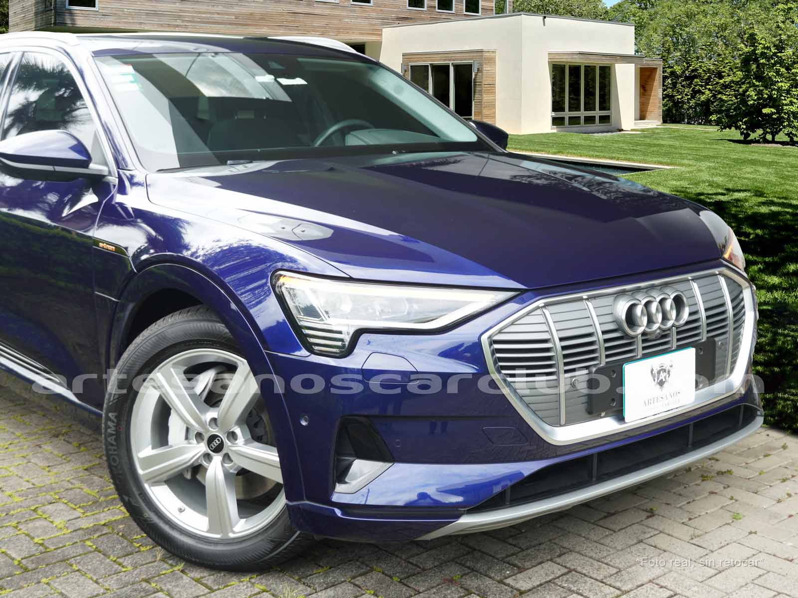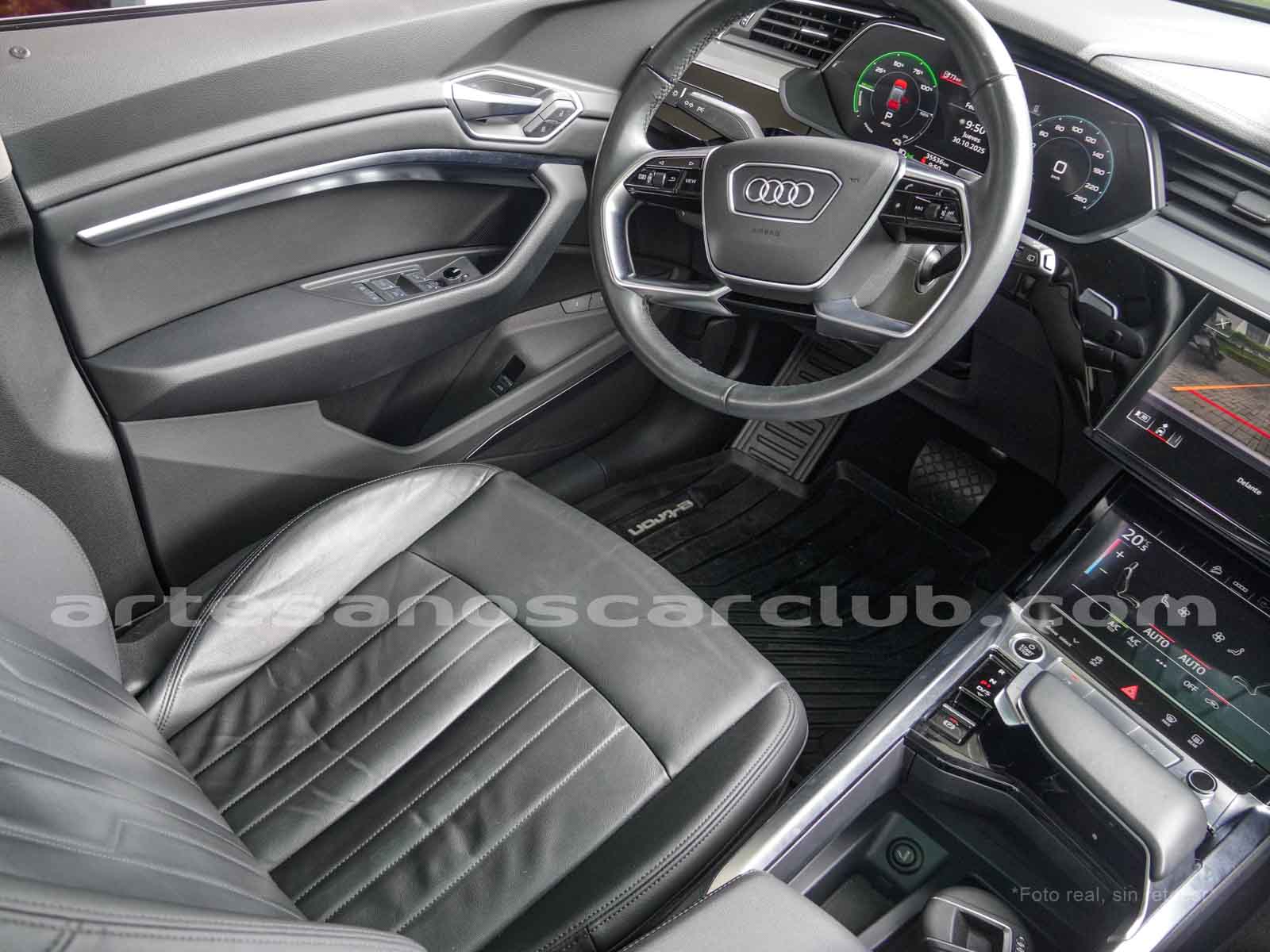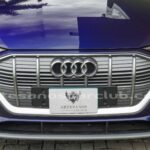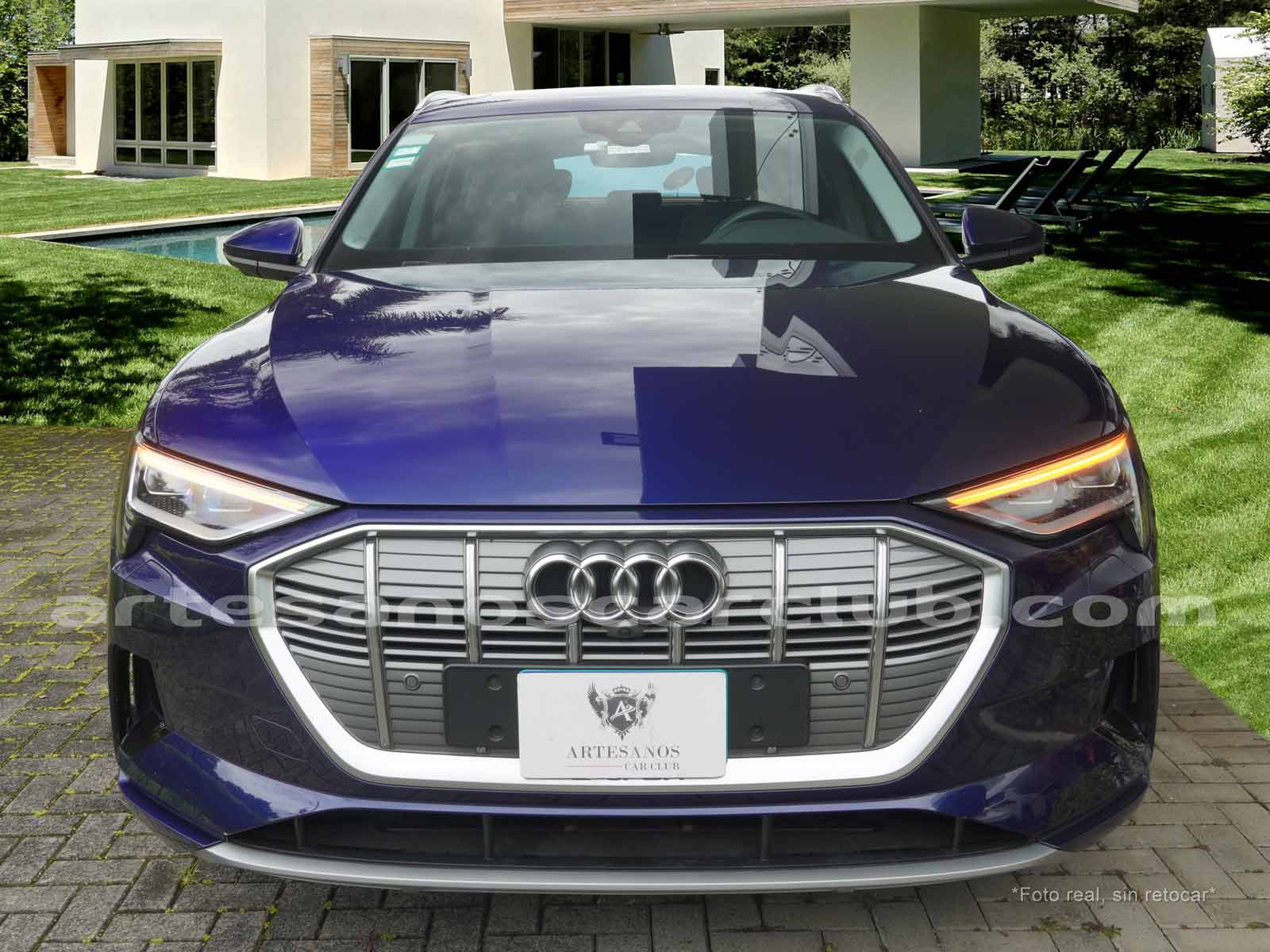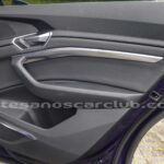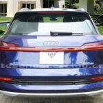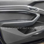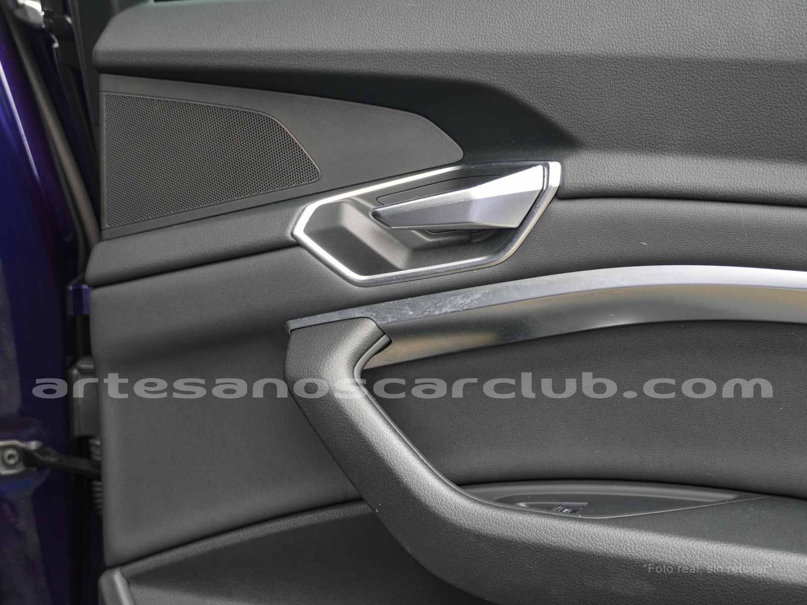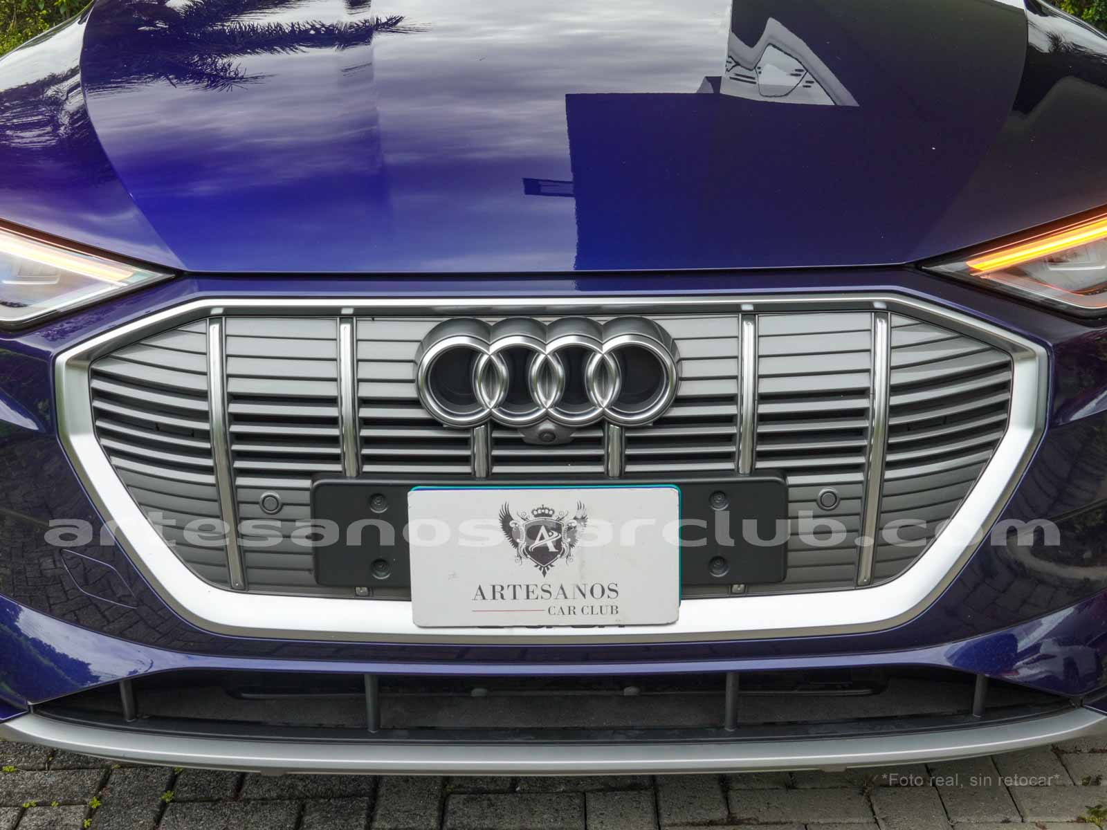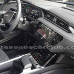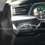 Emblema E-Tron en guardabarros delanteros incrustados en tapas de recarga de batería y parrilla frontal.