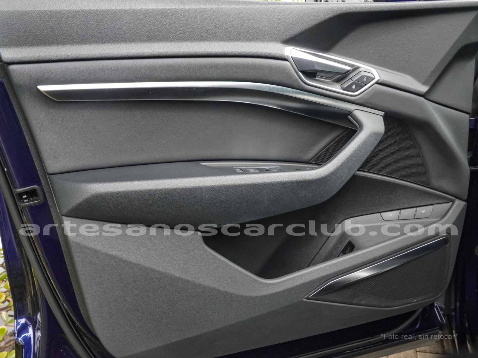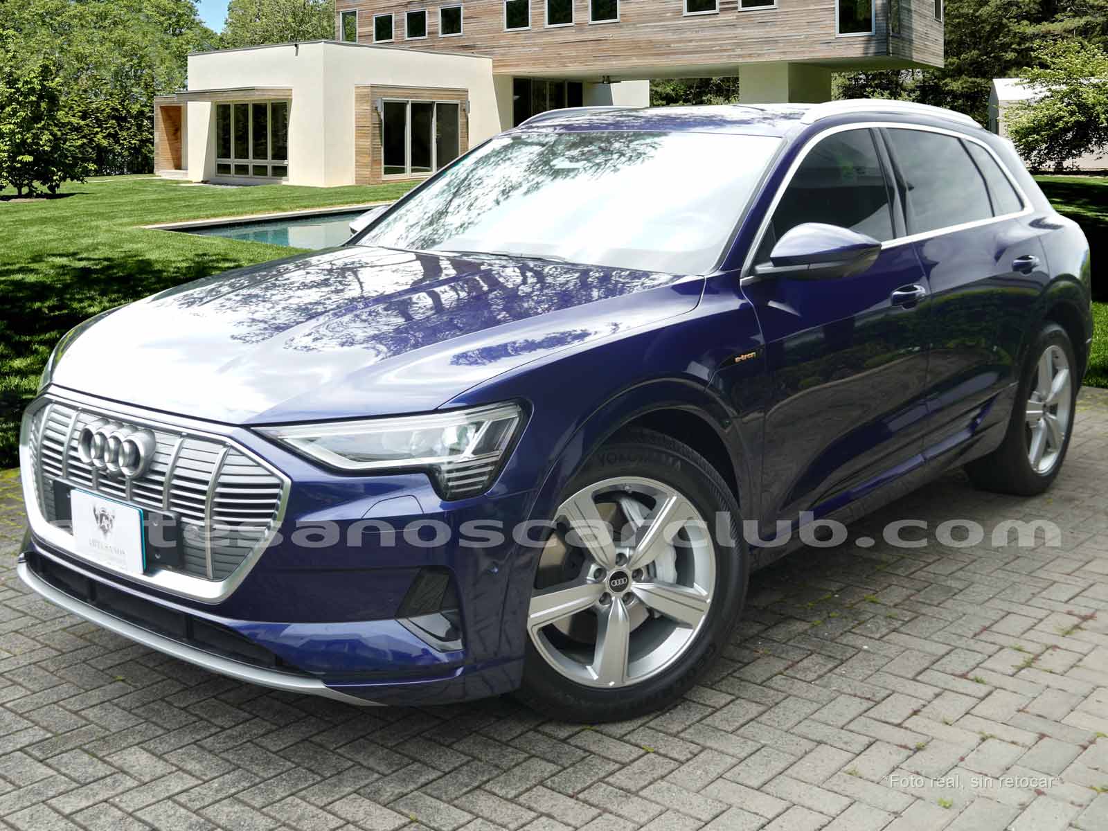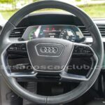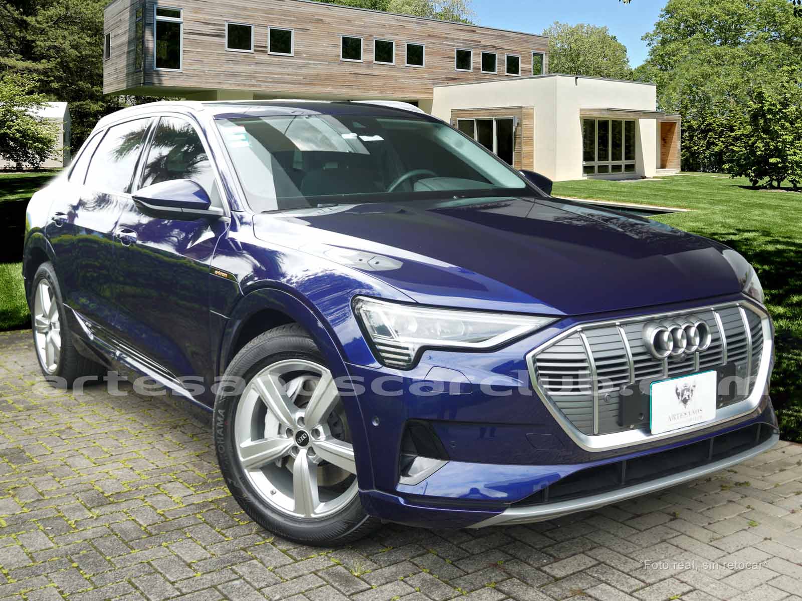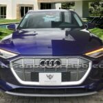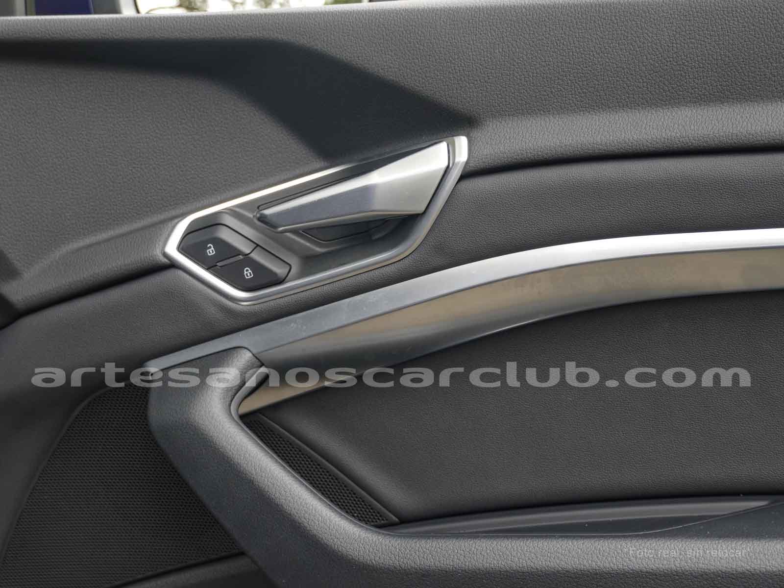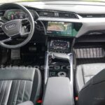 Emblema E-Tron en guardabarros delanteros incrustados en tapas de recarga de batería y parrilla frontal.