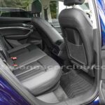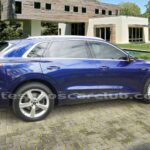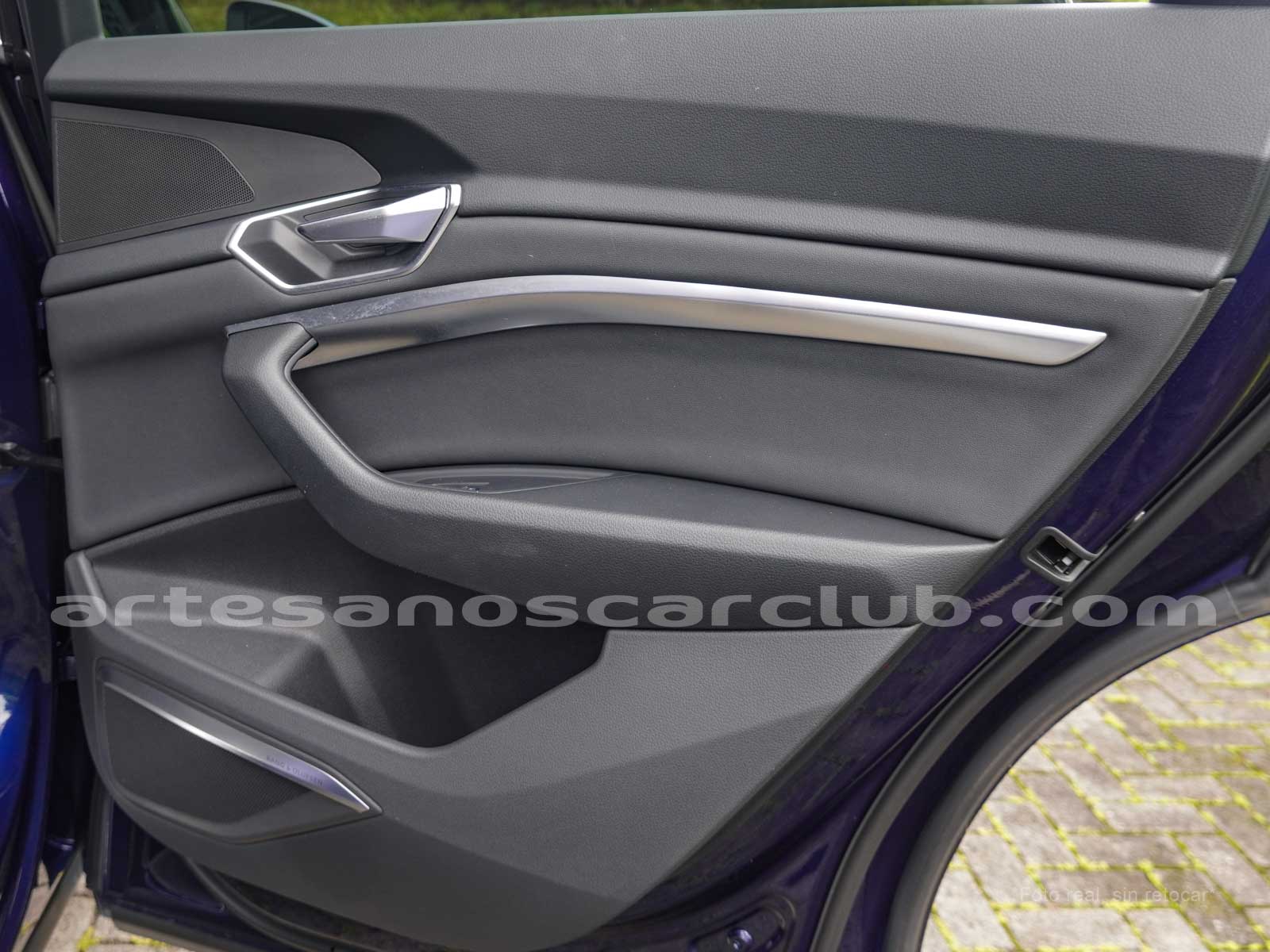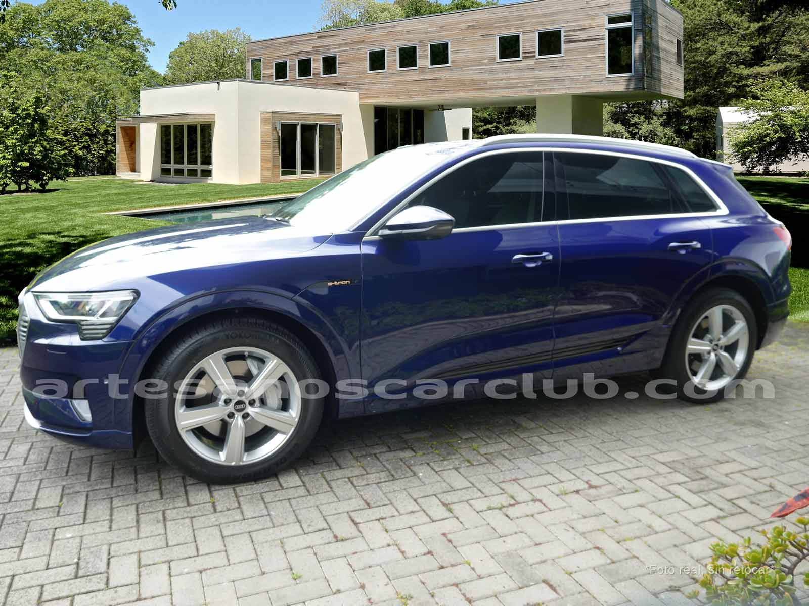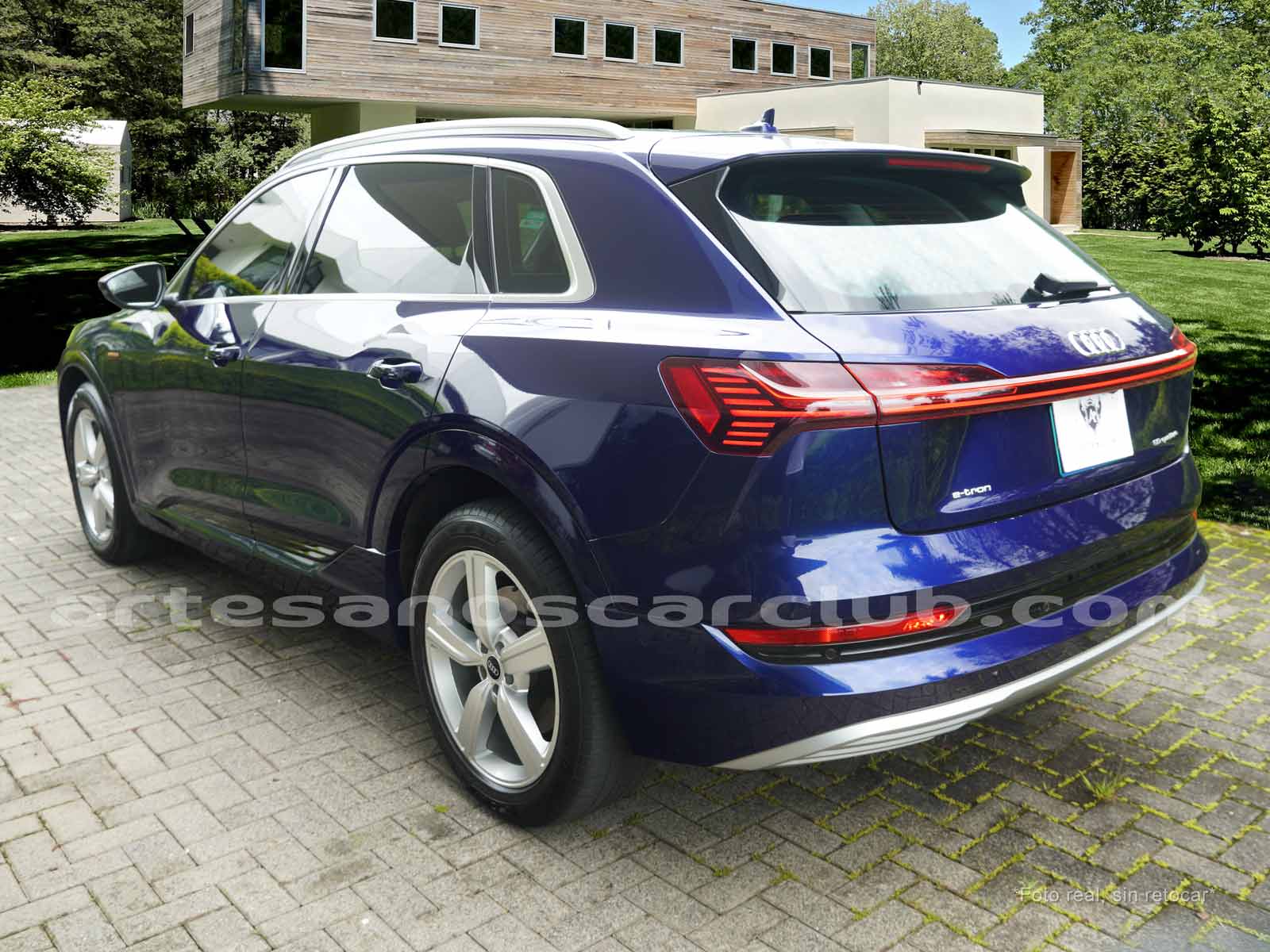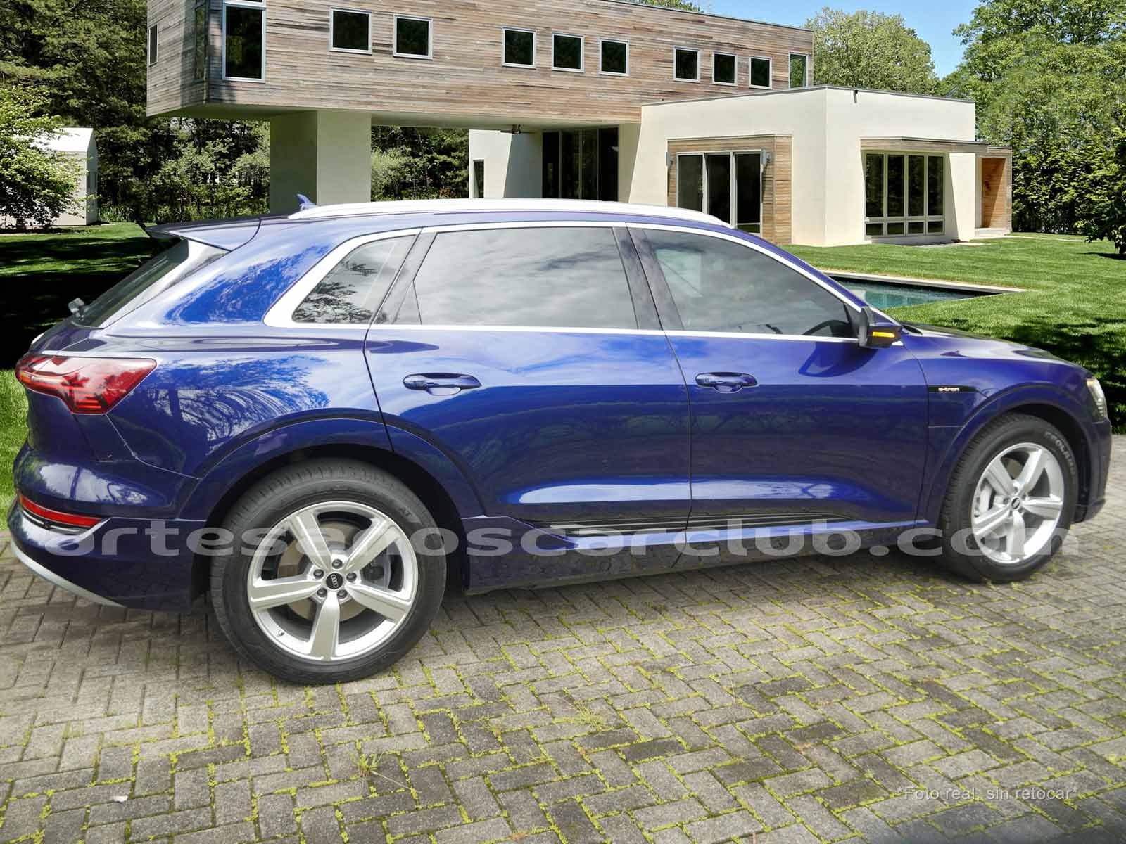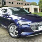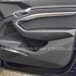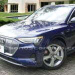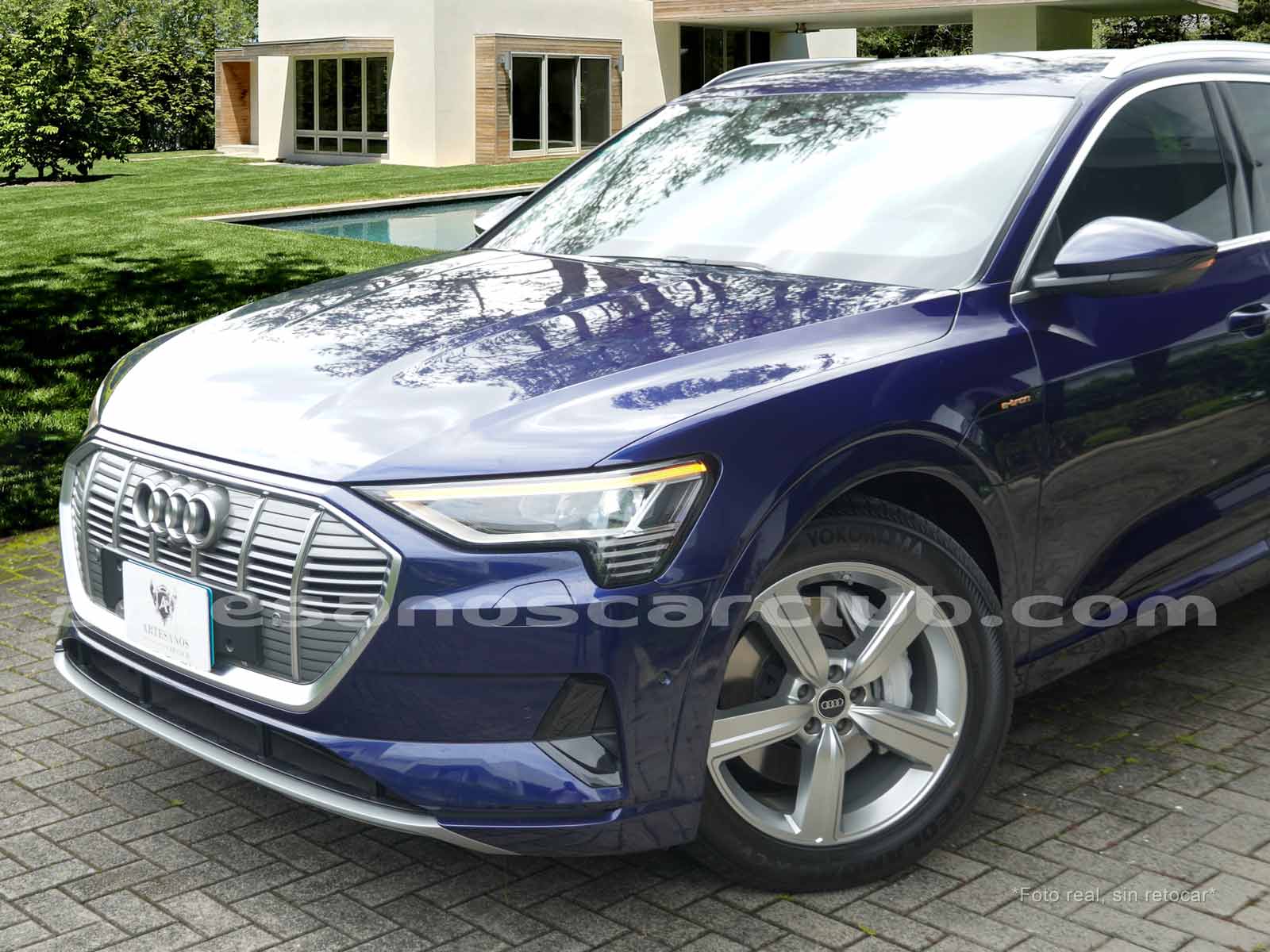 Emblema E-Tron en guardabarros delanteros incrustados en tapas de recarga de batería y parrilla frontal.