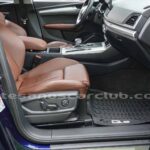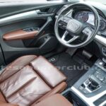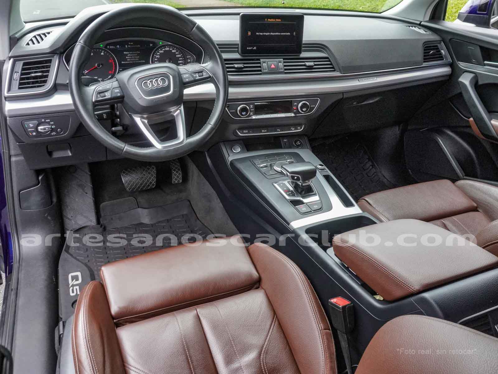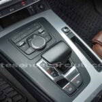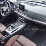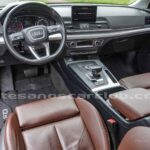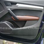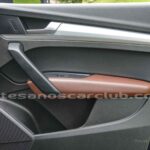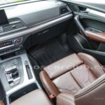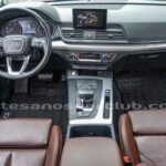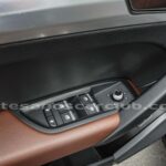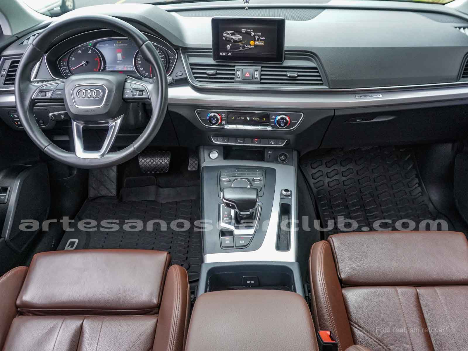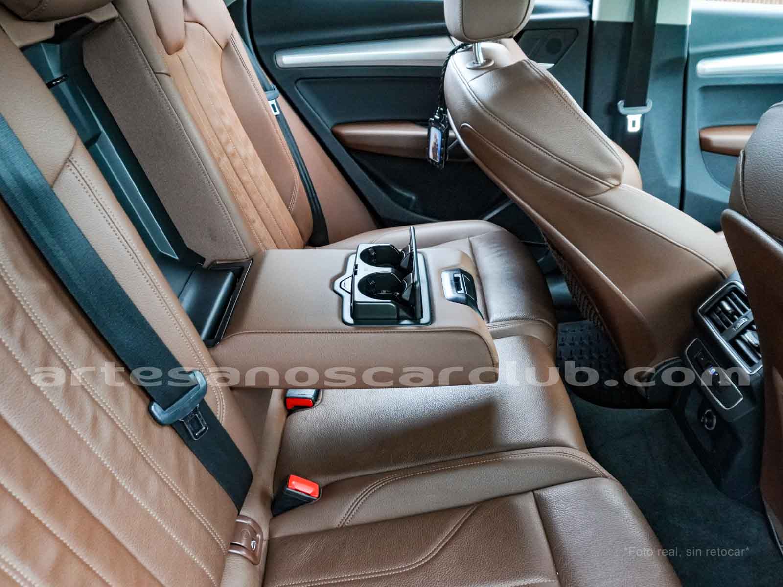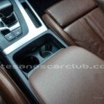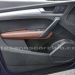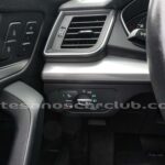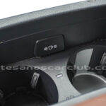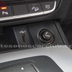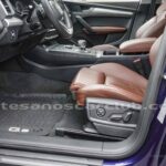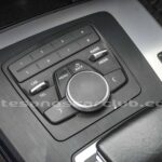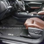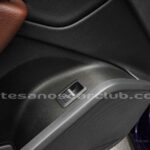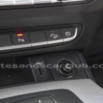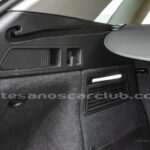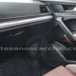 Moldura interior principal en aluminio «Tangente Plata» con decorado en laterales de consola central en piel negra con costuras dobles de alto contraste blancas.