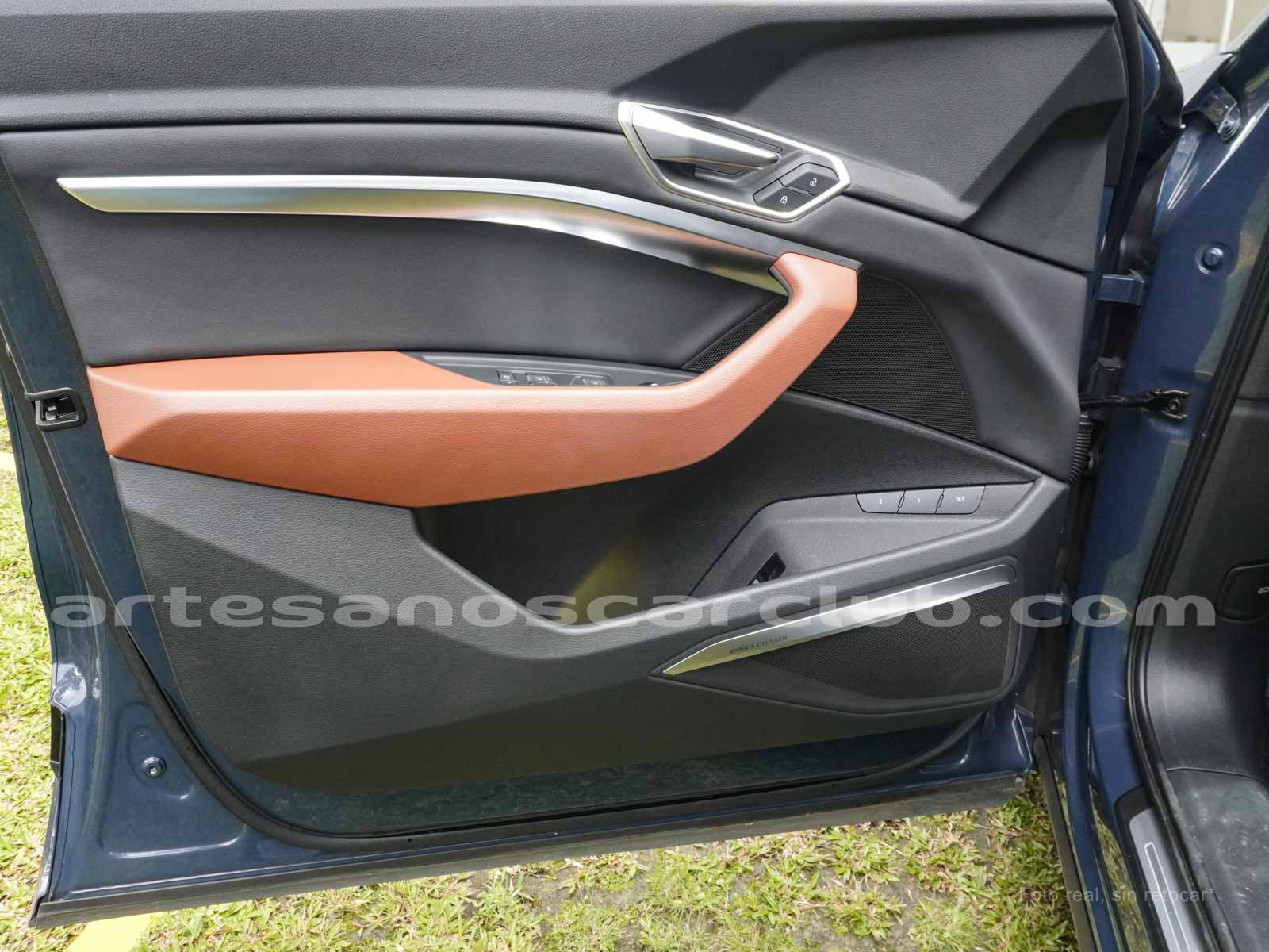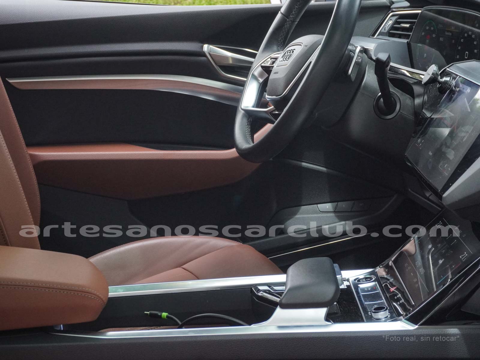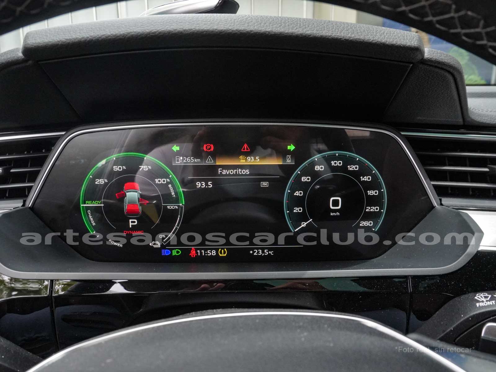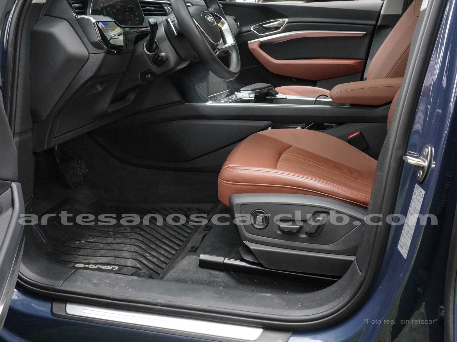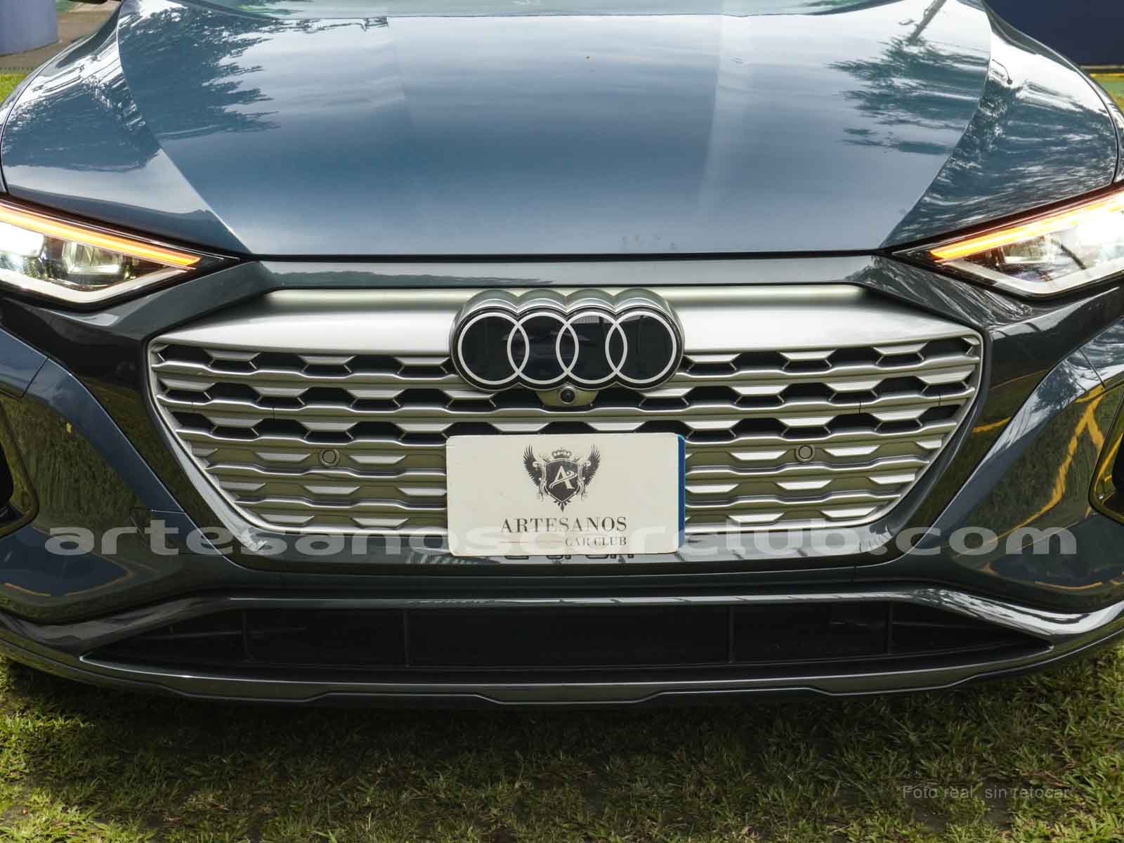 Emblema E-Tron en guardabarros delanteros integrados en tapas de recarga de batería y parrilla frontal.