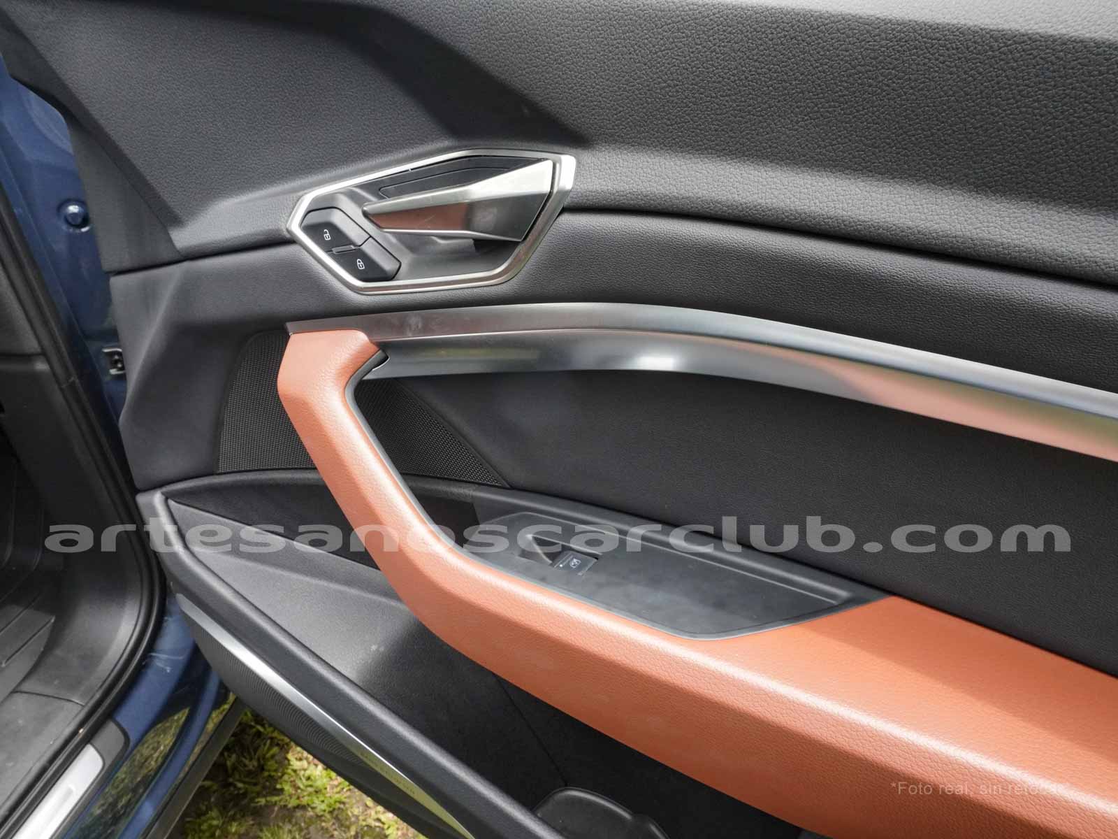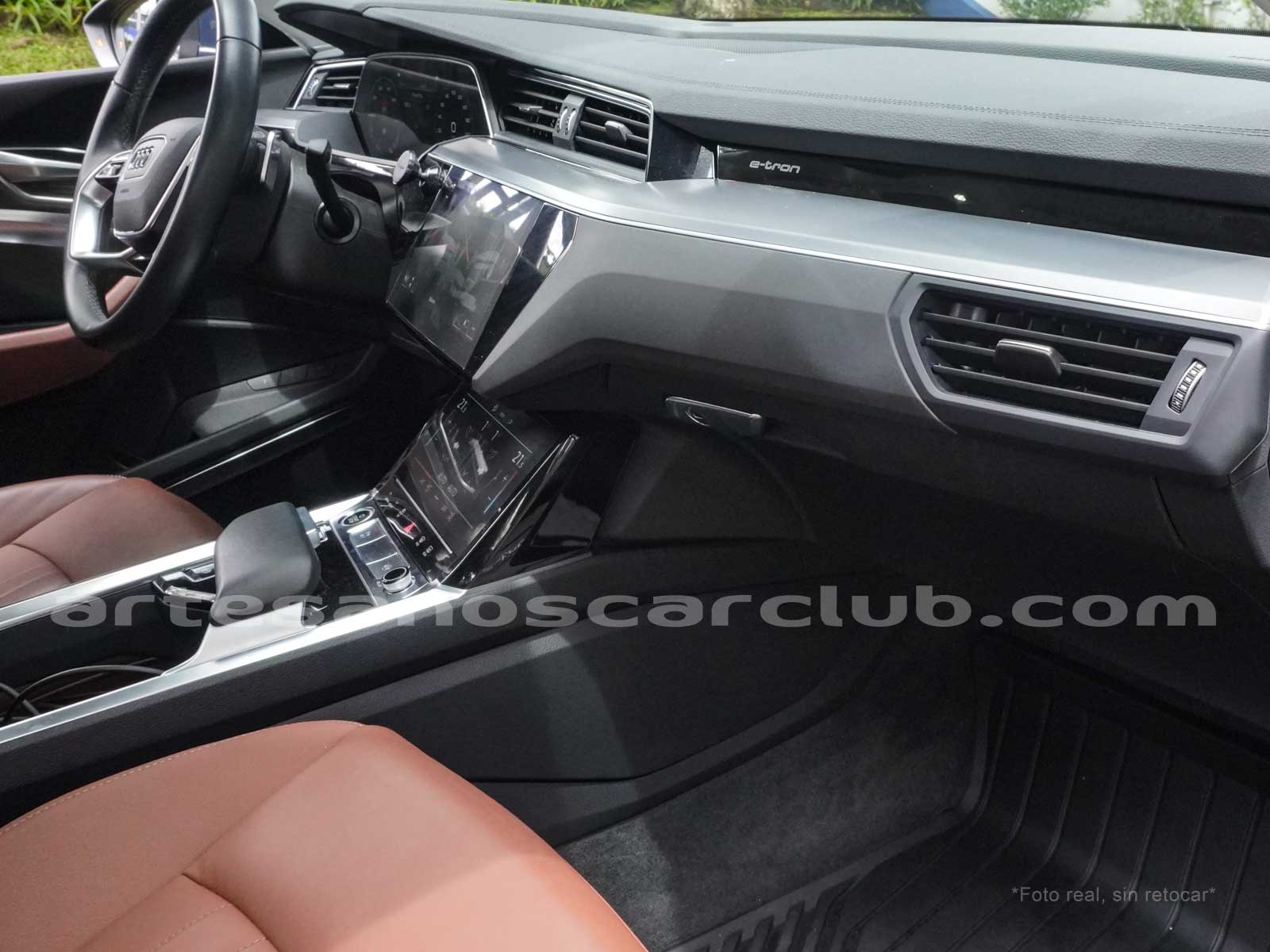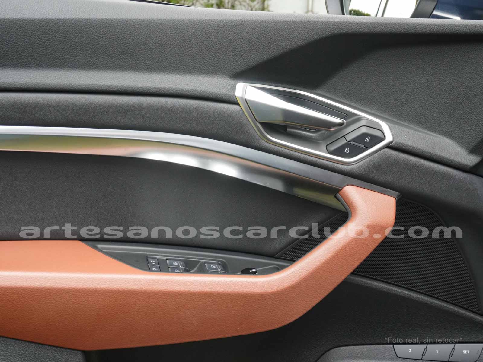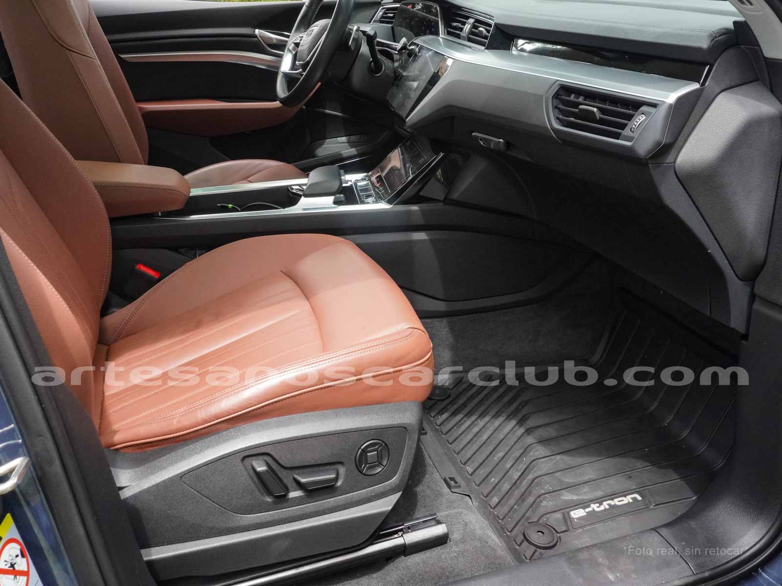 Emblema E-Tron en guardabarros delanteros integrados en tapas de recarga de batería y parrilla frontal.