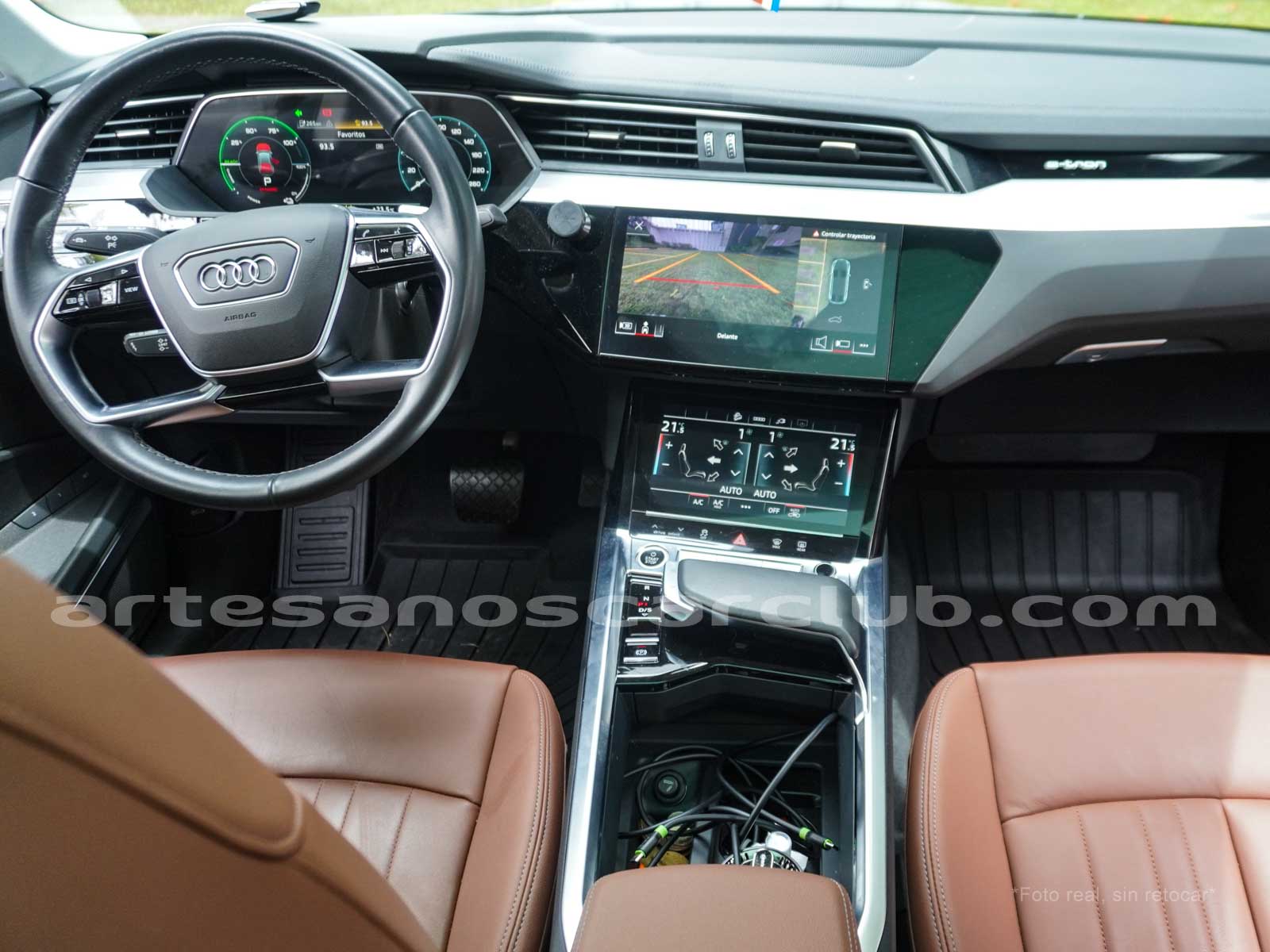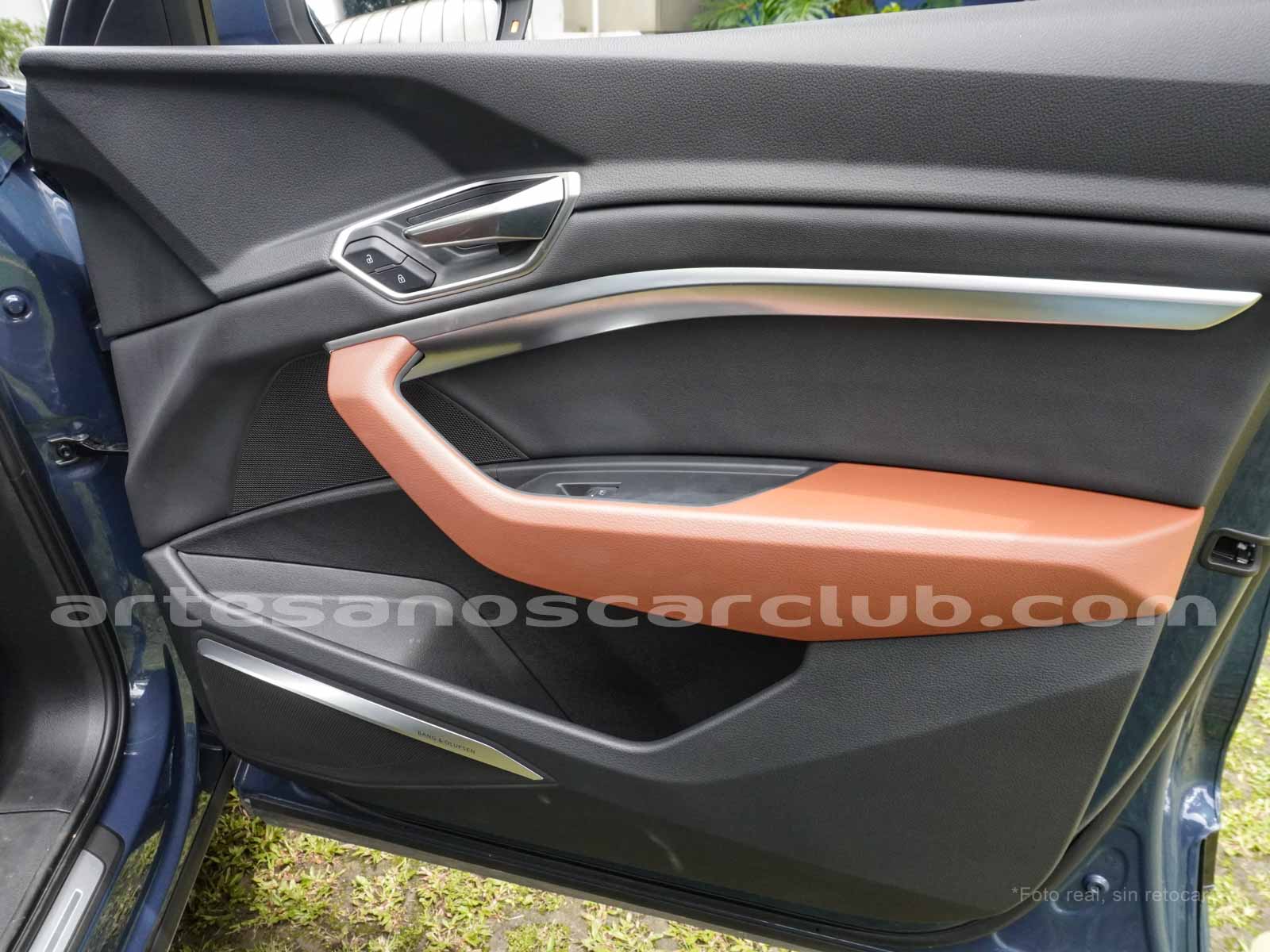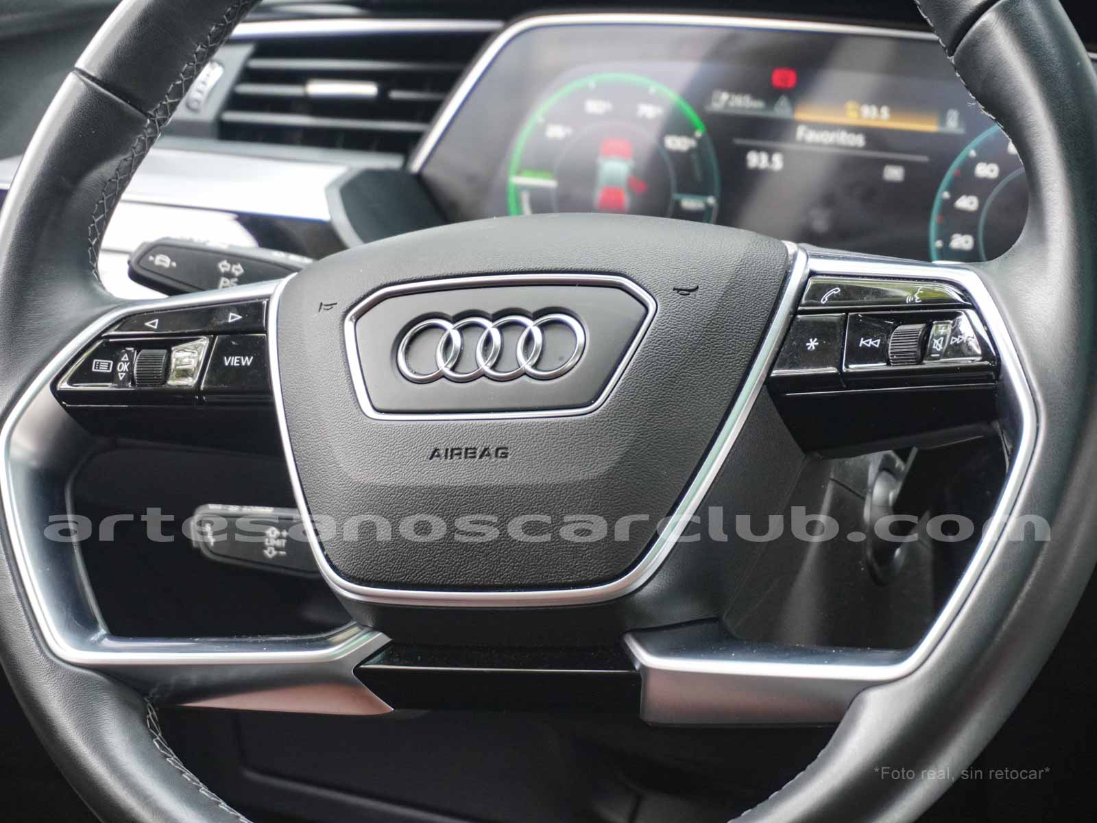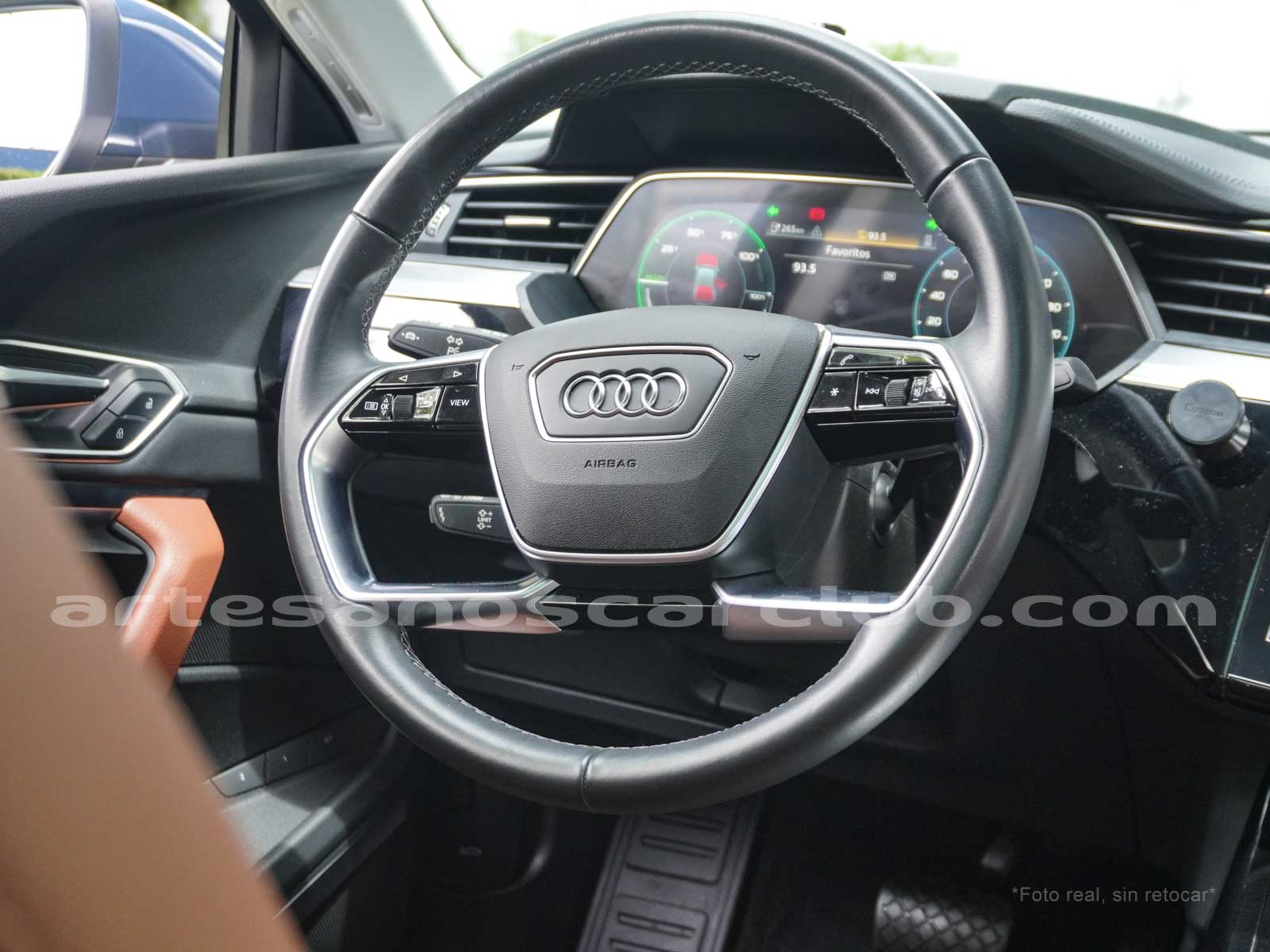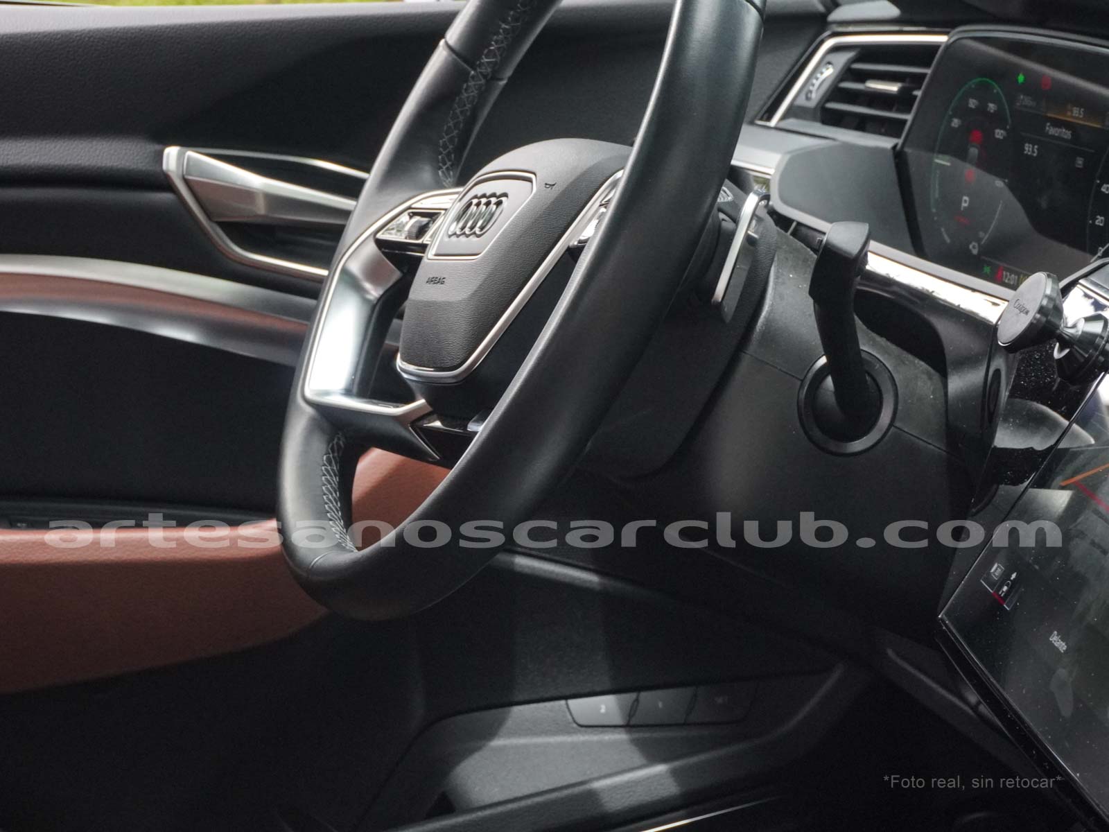 Emblema E-Tron en guardabarros delanteros integrados en tapas de recarga de batería y parrilla frontal.