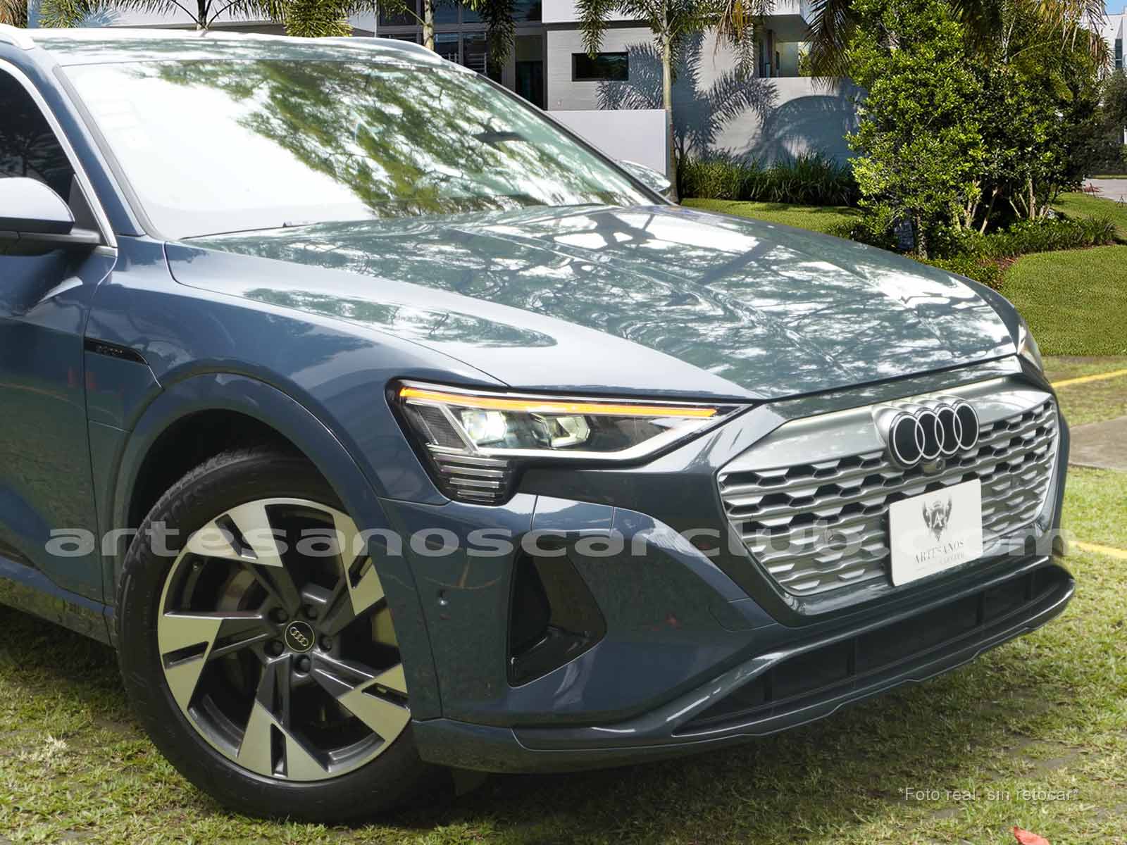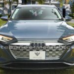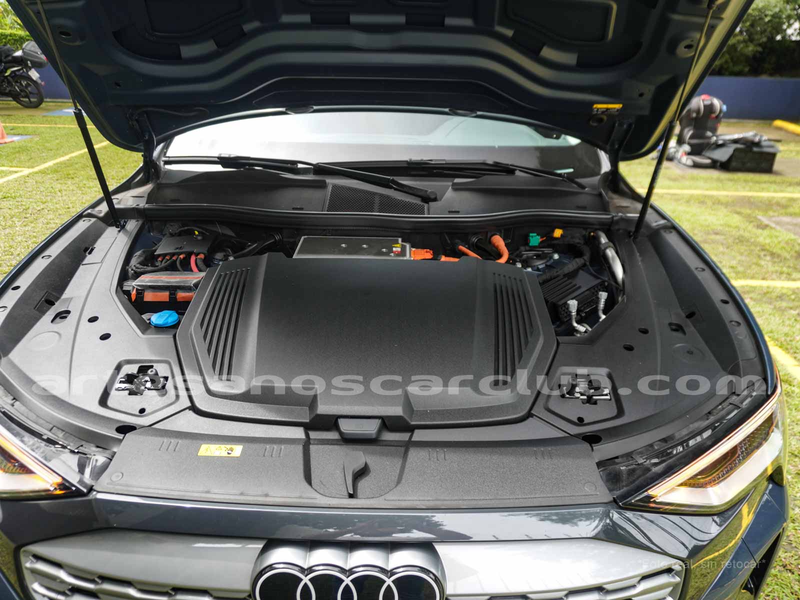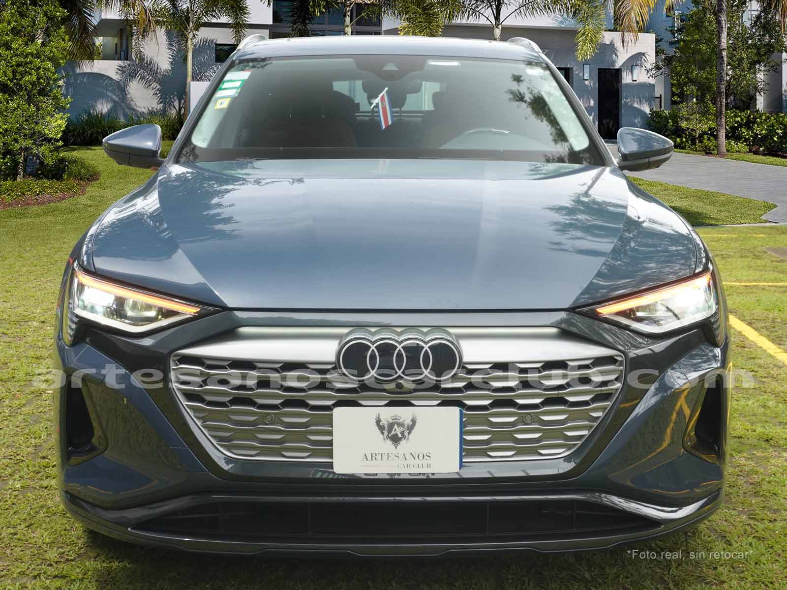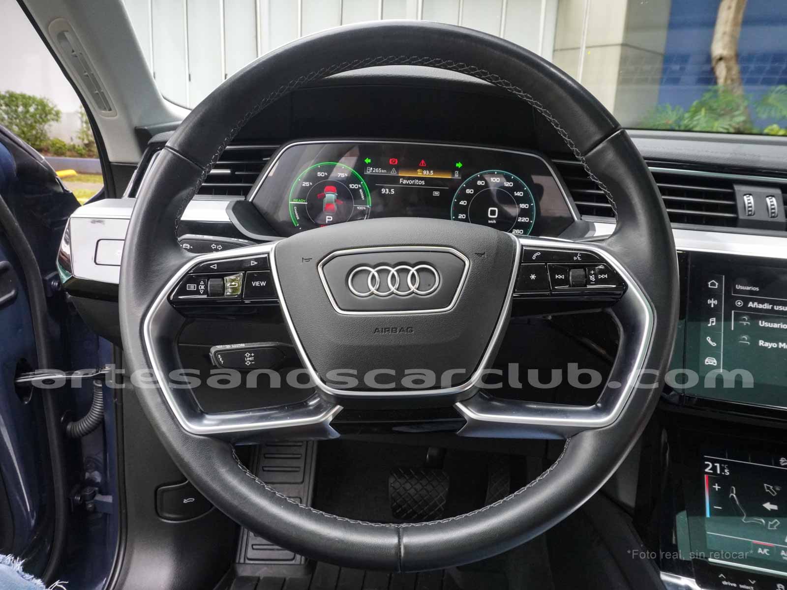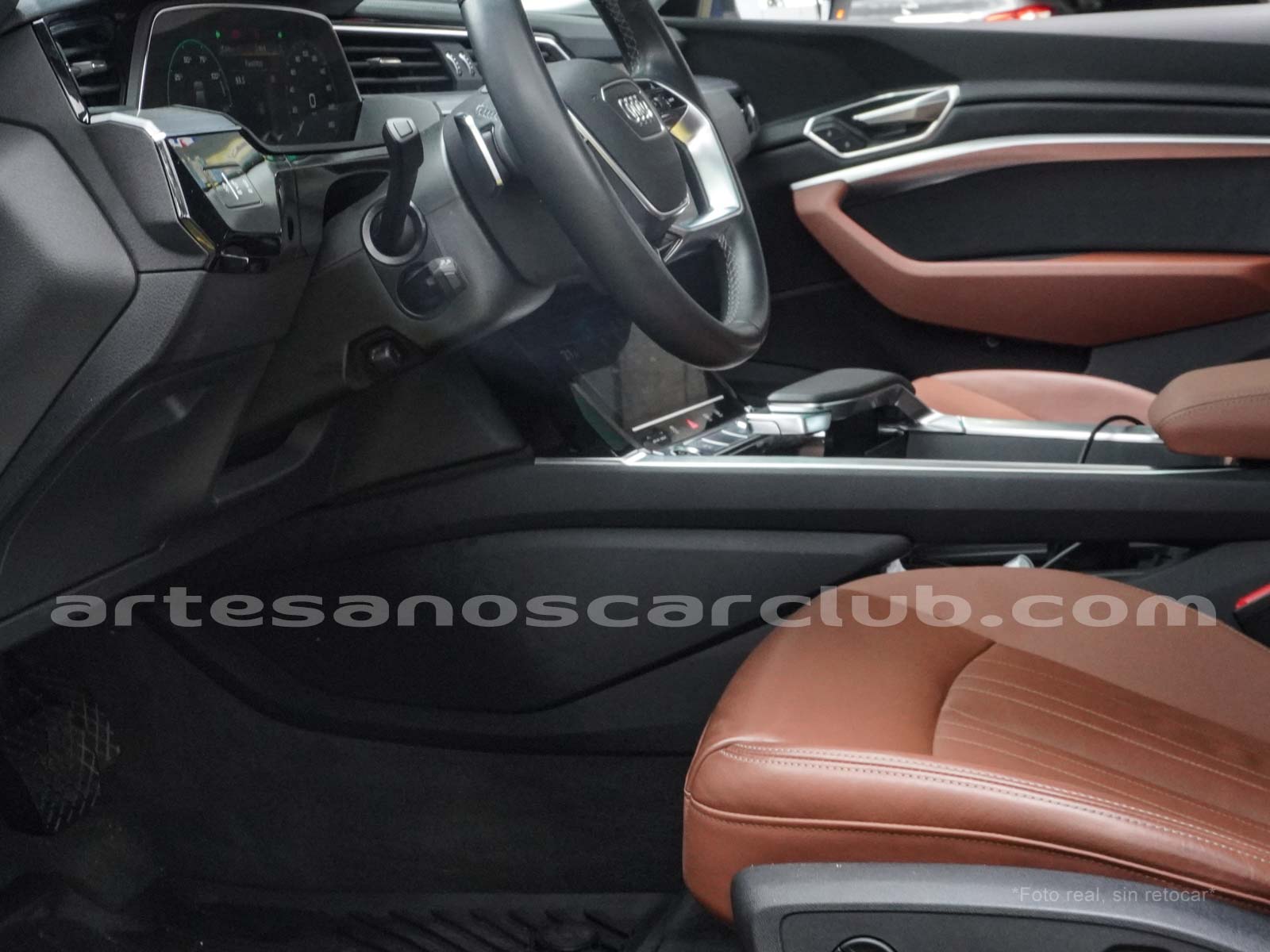 Emblema E-Tron en guardabarros delanteros integrados en tapas de recarga de batería y parrilla frontal.