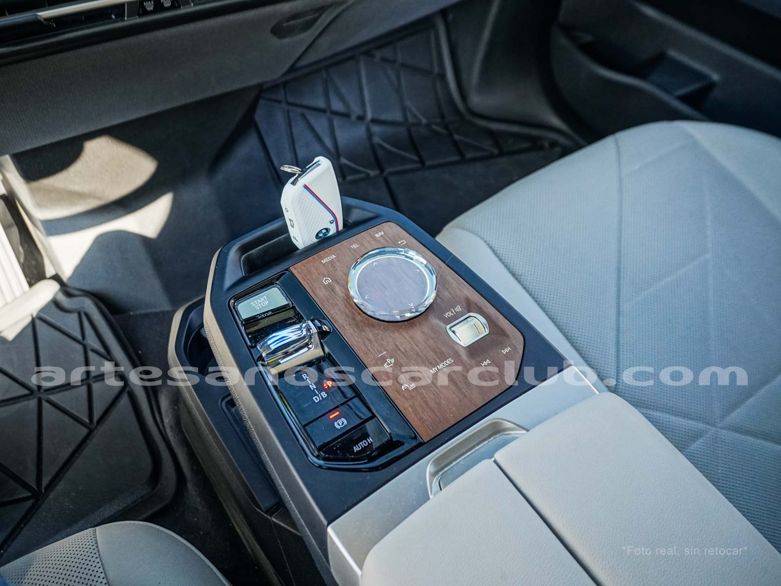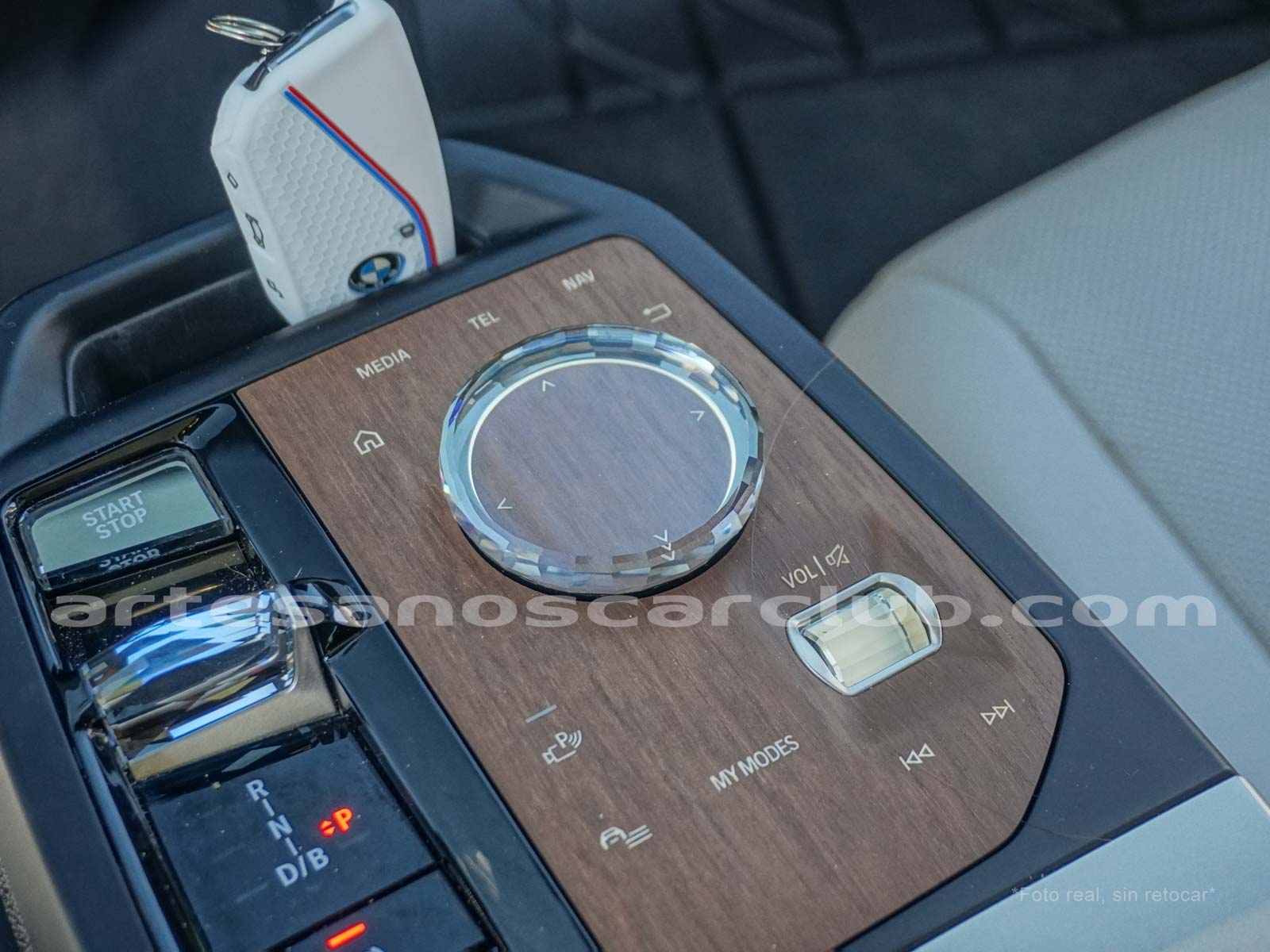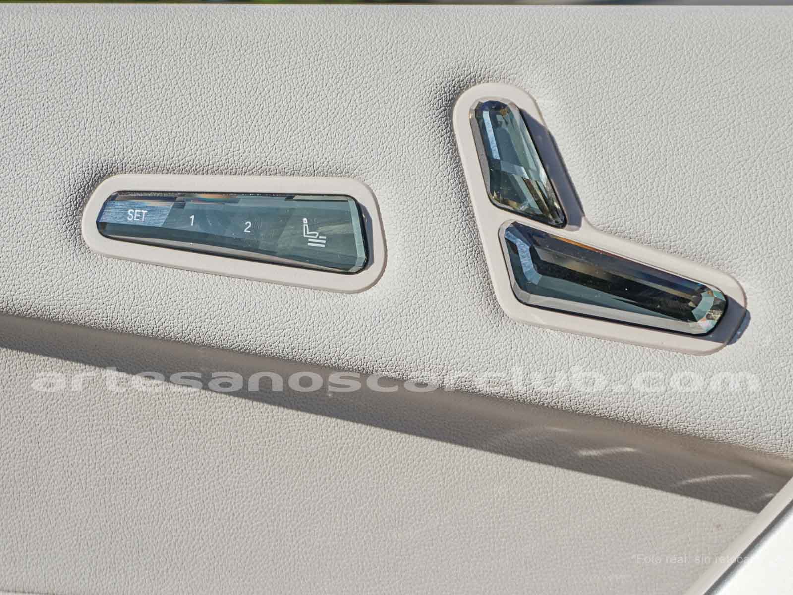 Mandos de sillas, control panel de consola central, botón de cambios y botón de Start/Stop en vidrio cristal cortado “CraftedClarity”.