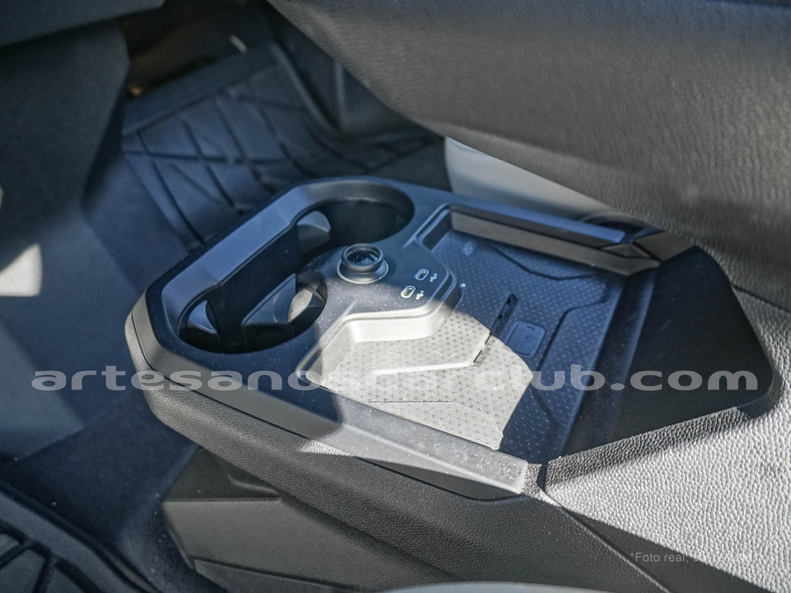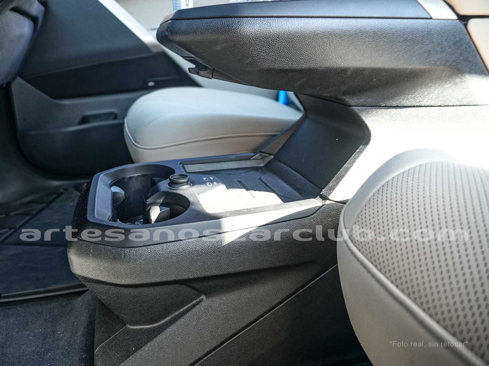 Consola central delantera con bodega y tapa, con conectores multimedia.