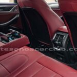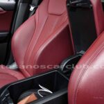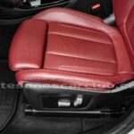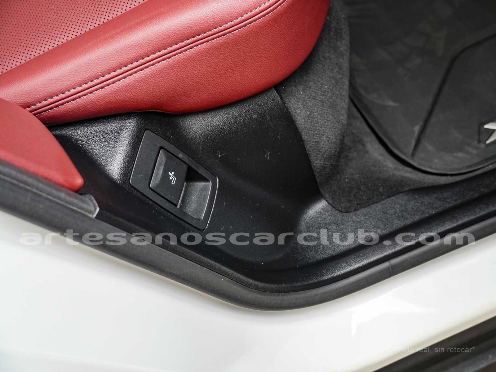 Cintura interior en piel roja con detalles negros con costuras de contraste y molduras en aluminio.