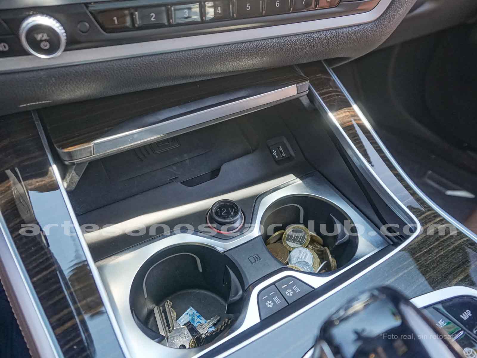 Consola central delantera con bodega y tapa con conectores multimedia.
