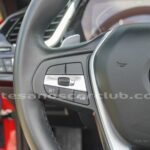 Volante multifunción de 4 radios en piel negra con controles en negro y decoraciones en aluminio.