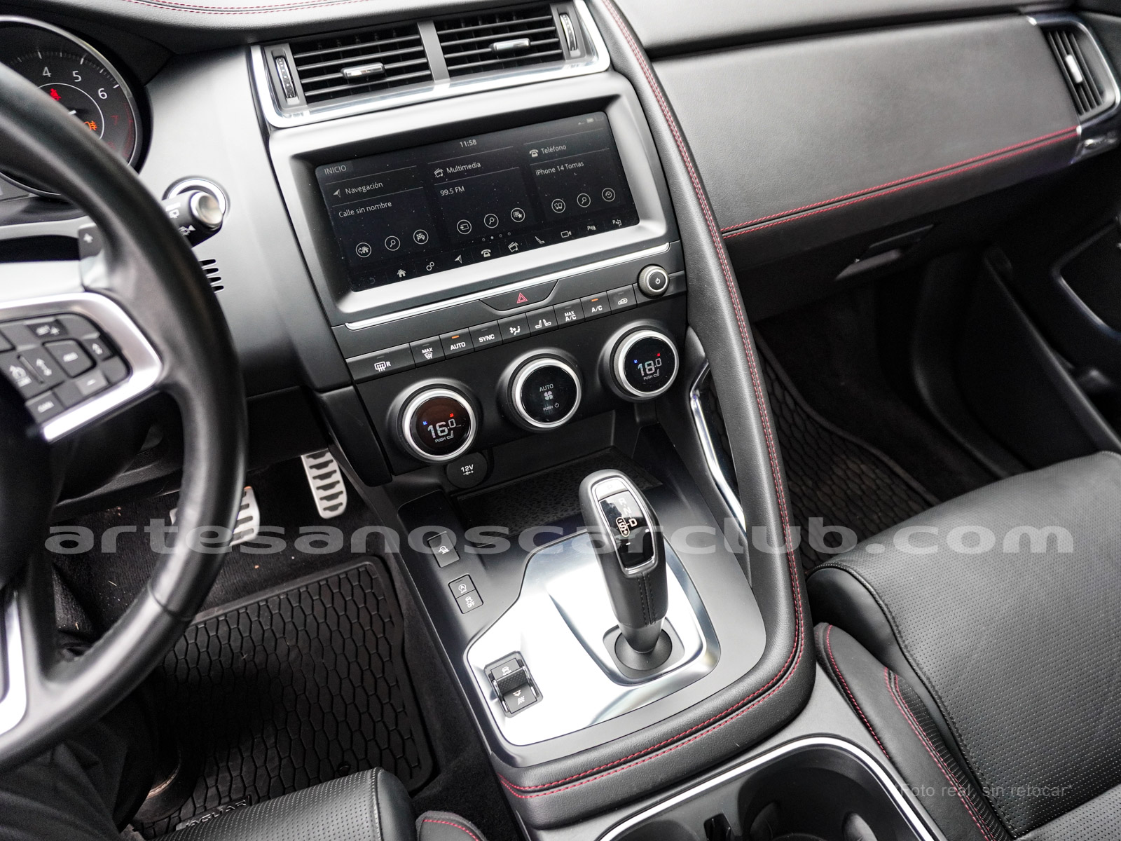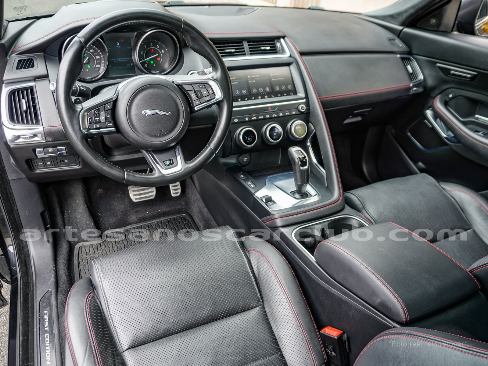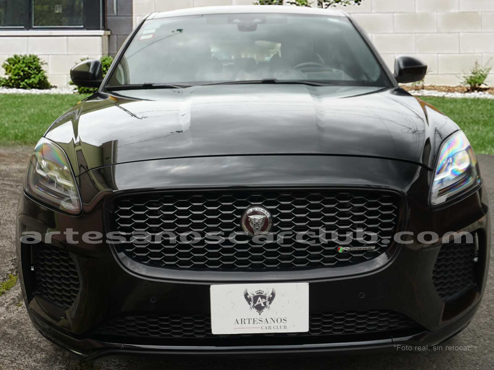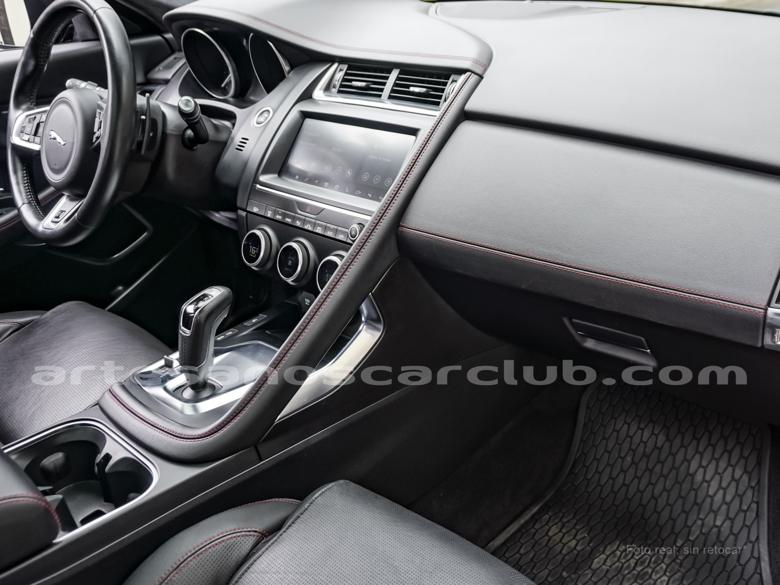 E PACE con paquete «R DYNAMIC»: Carrocería R-Dynamic (parachoques delantero único y rejilla delantera con acabado en negro brillante), Volante de cuero granulado y levas de cambio de marchas R-Dynamic, Tubos de escape dobles con acabados, Asientos de malla deportiva en Ebony con costuras de contraste, Faros antiniebla delanteros, Tomas de aire laterales en Satin Chrome, Rejilla en Gloss Black con contorno en Satin Chrome, Pedales de metal brillante, Revestimiento del techo en gamuza Ebony, recubrimiento de puertas en gamuza negra «Ebony».
