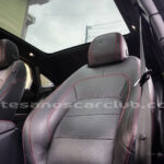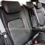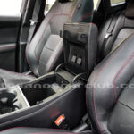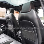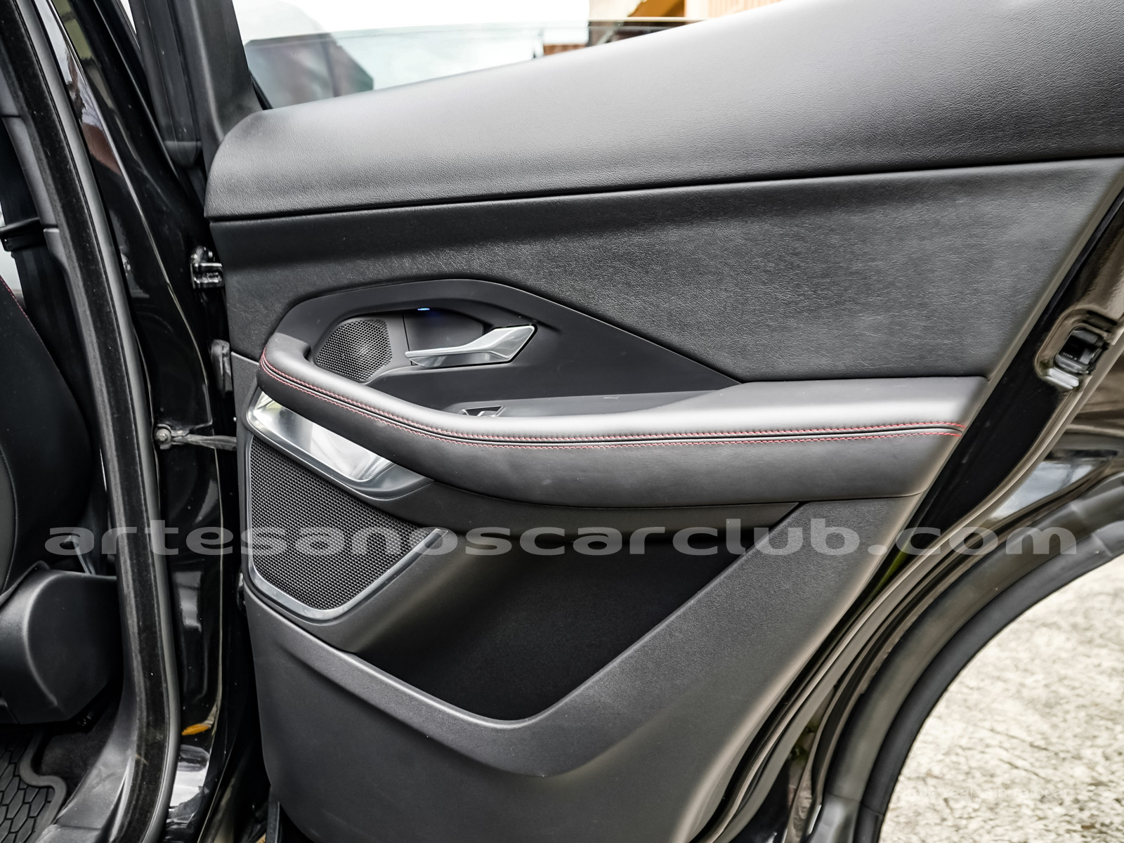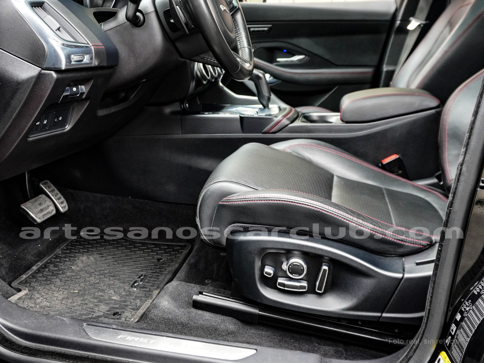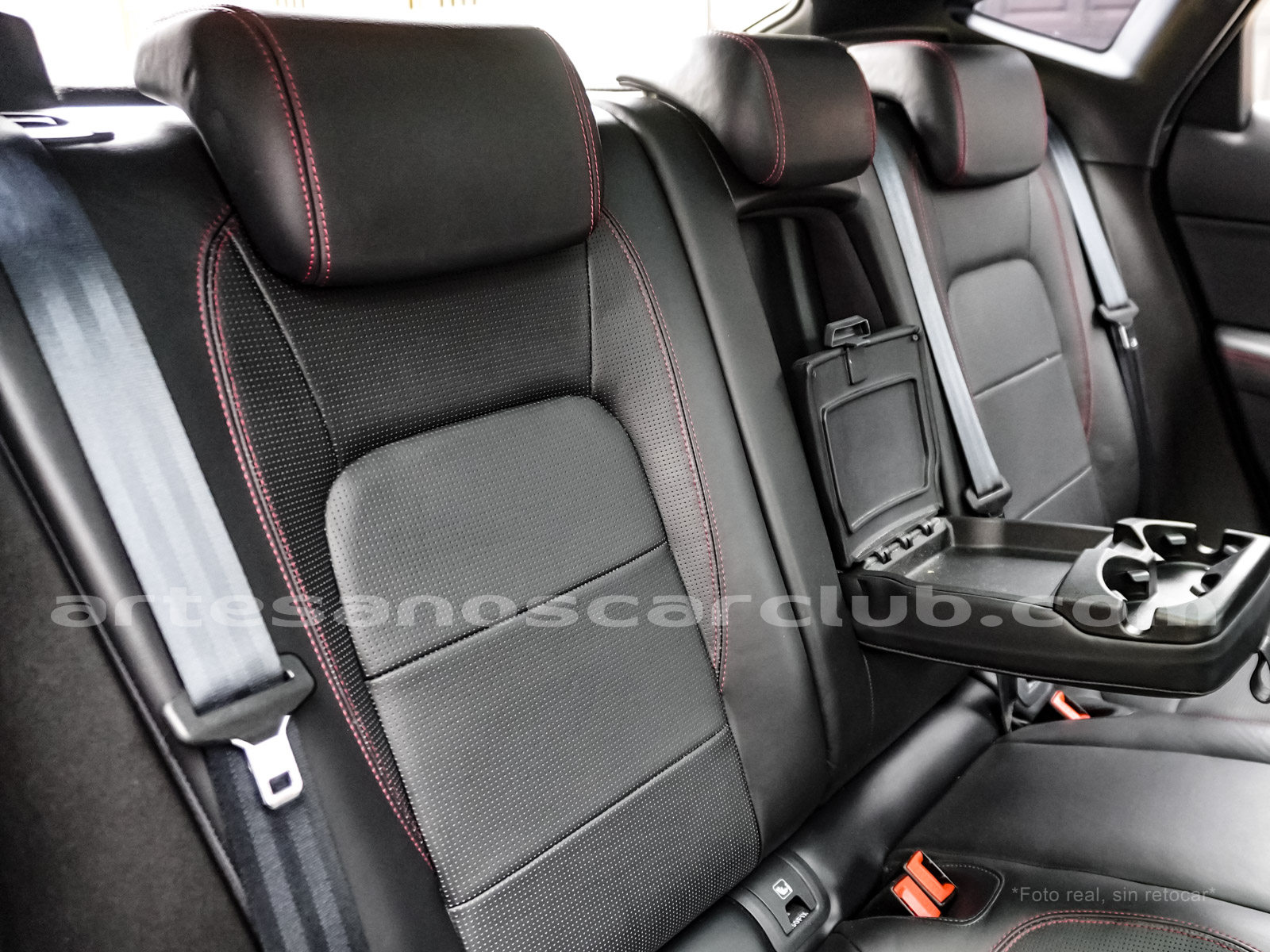 Sillas en piel «Windsor» negra «Ebony» microperforada con costuras de alto contraste dobles en color rojo «Mars» con marcación en cabeceras con emblema Jaguar.