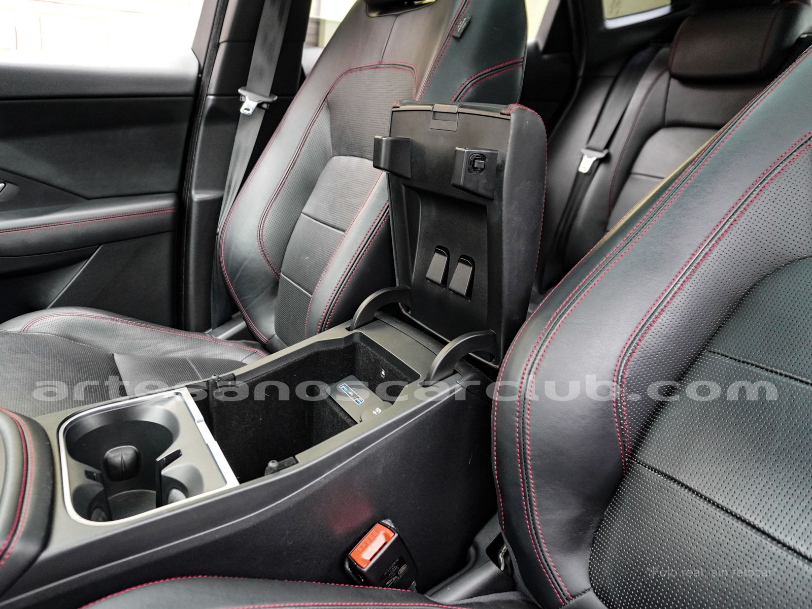 Apoyabrazos delantero con bodega y múltiples conectores multimedia.