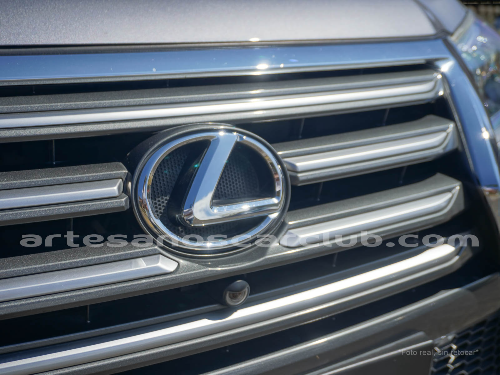 Parrilla frontal de diseño de reloj de arena con marco en aluminio satinado y malla en negro.