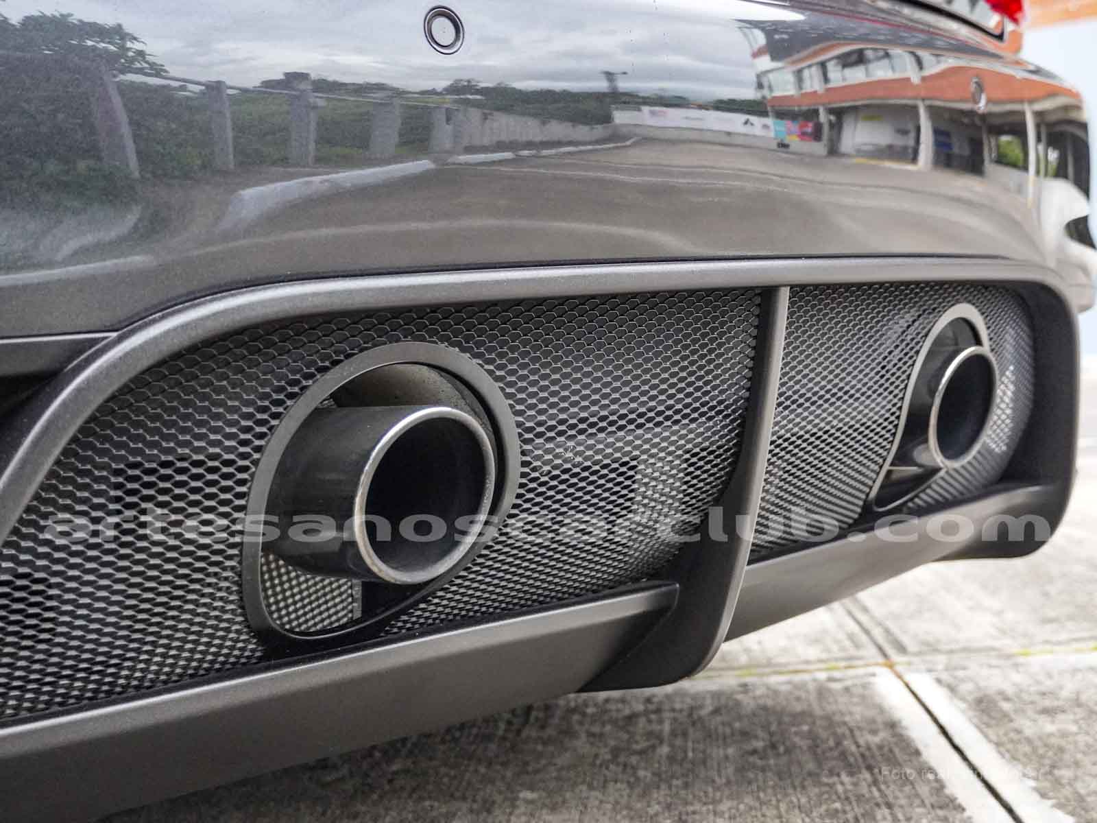 2 salidas de escape en acero inoxidable con terminación negra y diseño redondeado.
