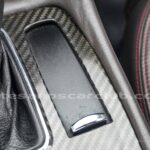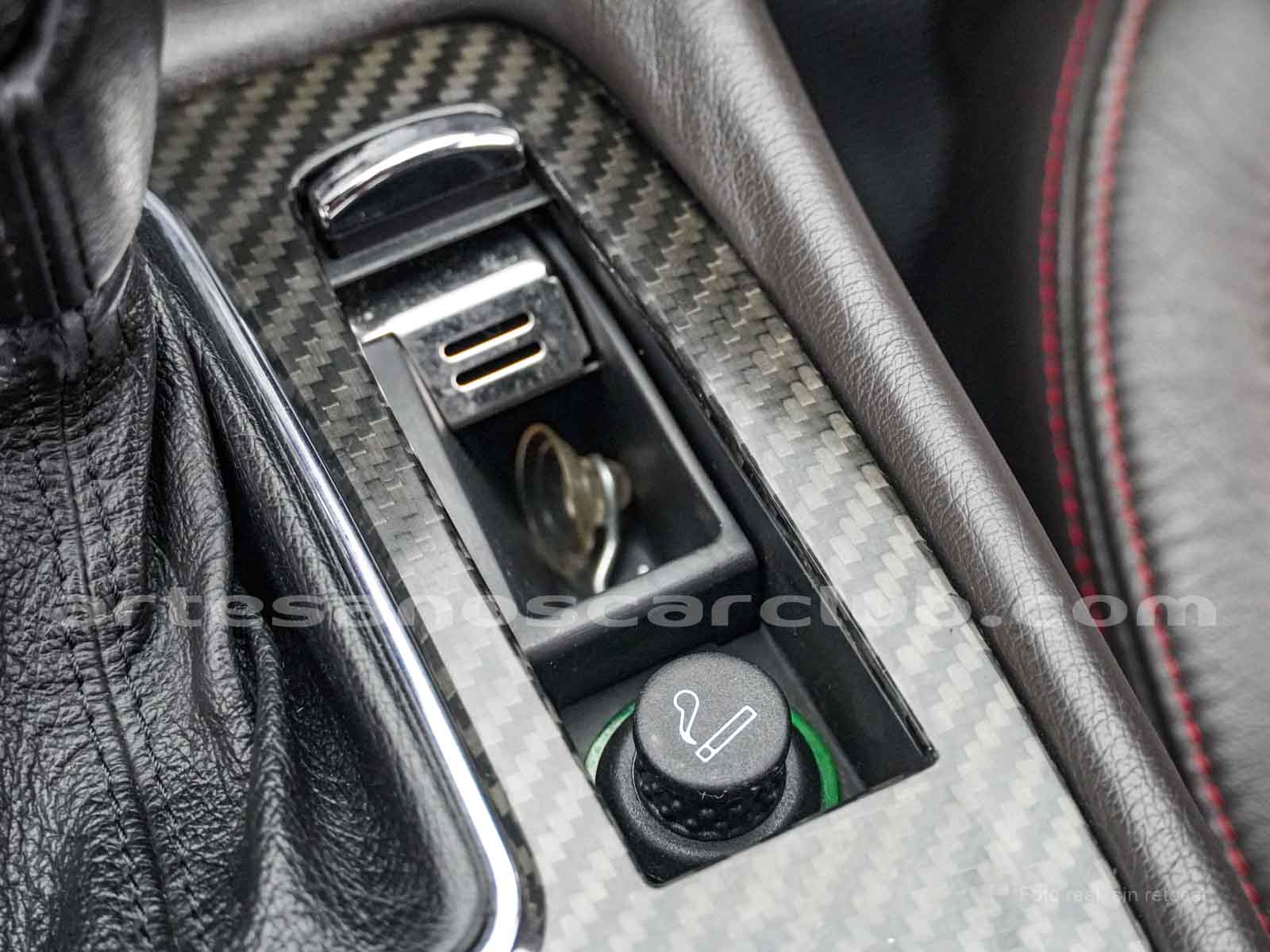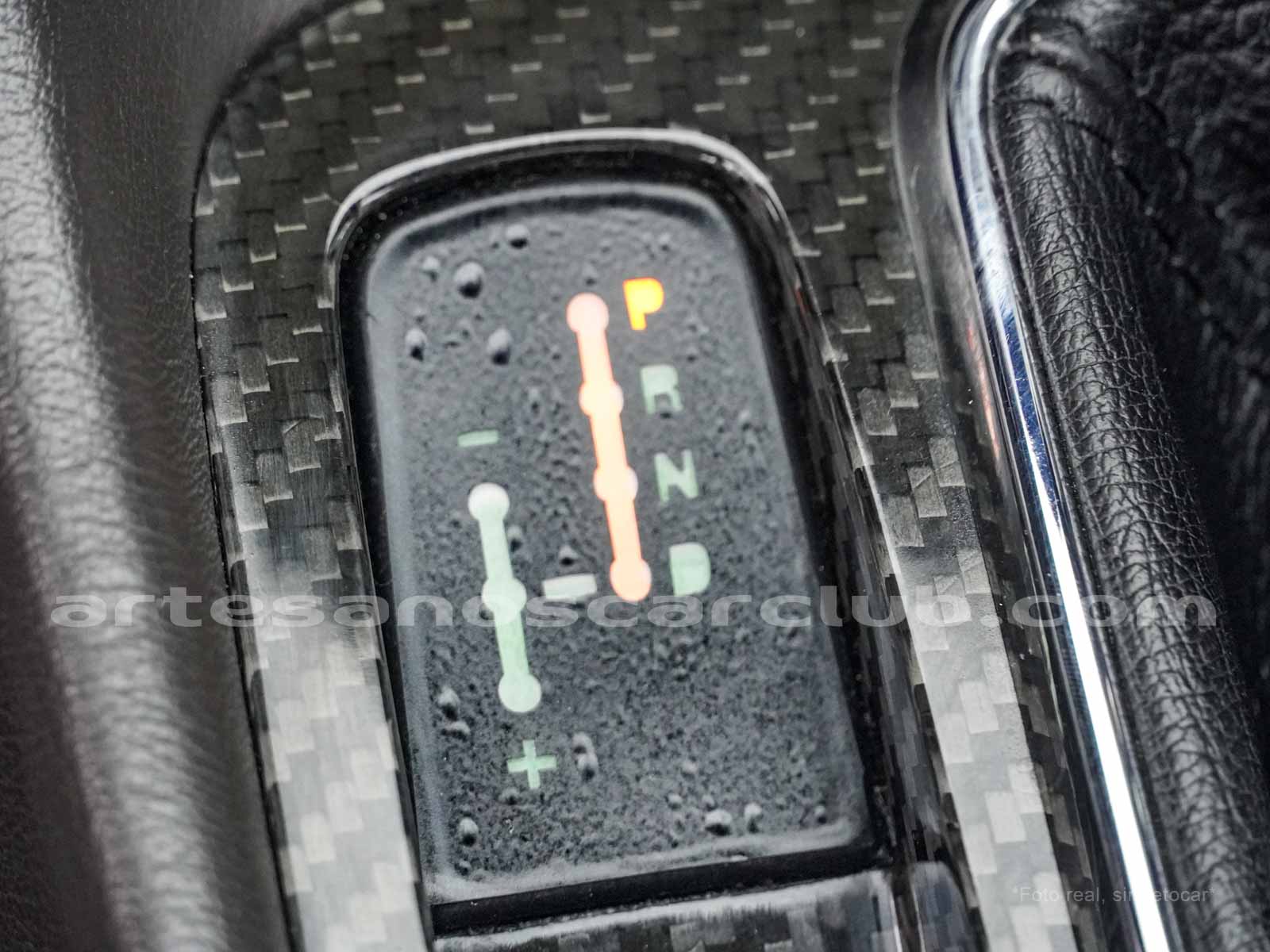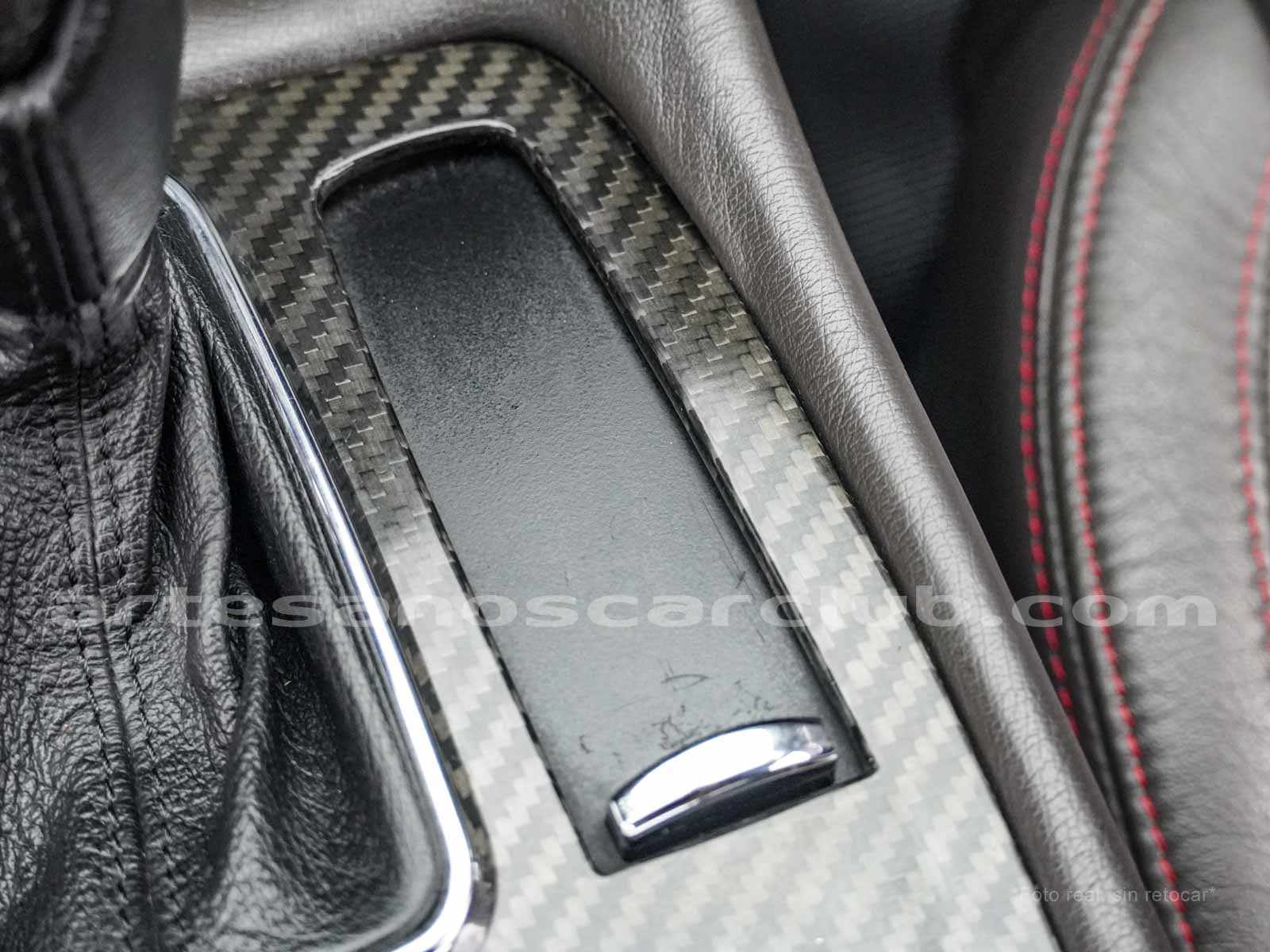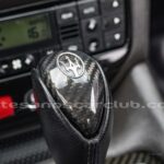 Pomo de palanca de cambios en piel negra con acabado de carbono.