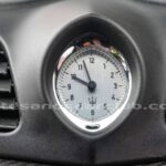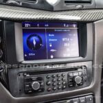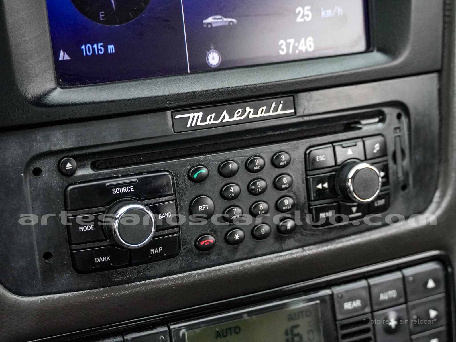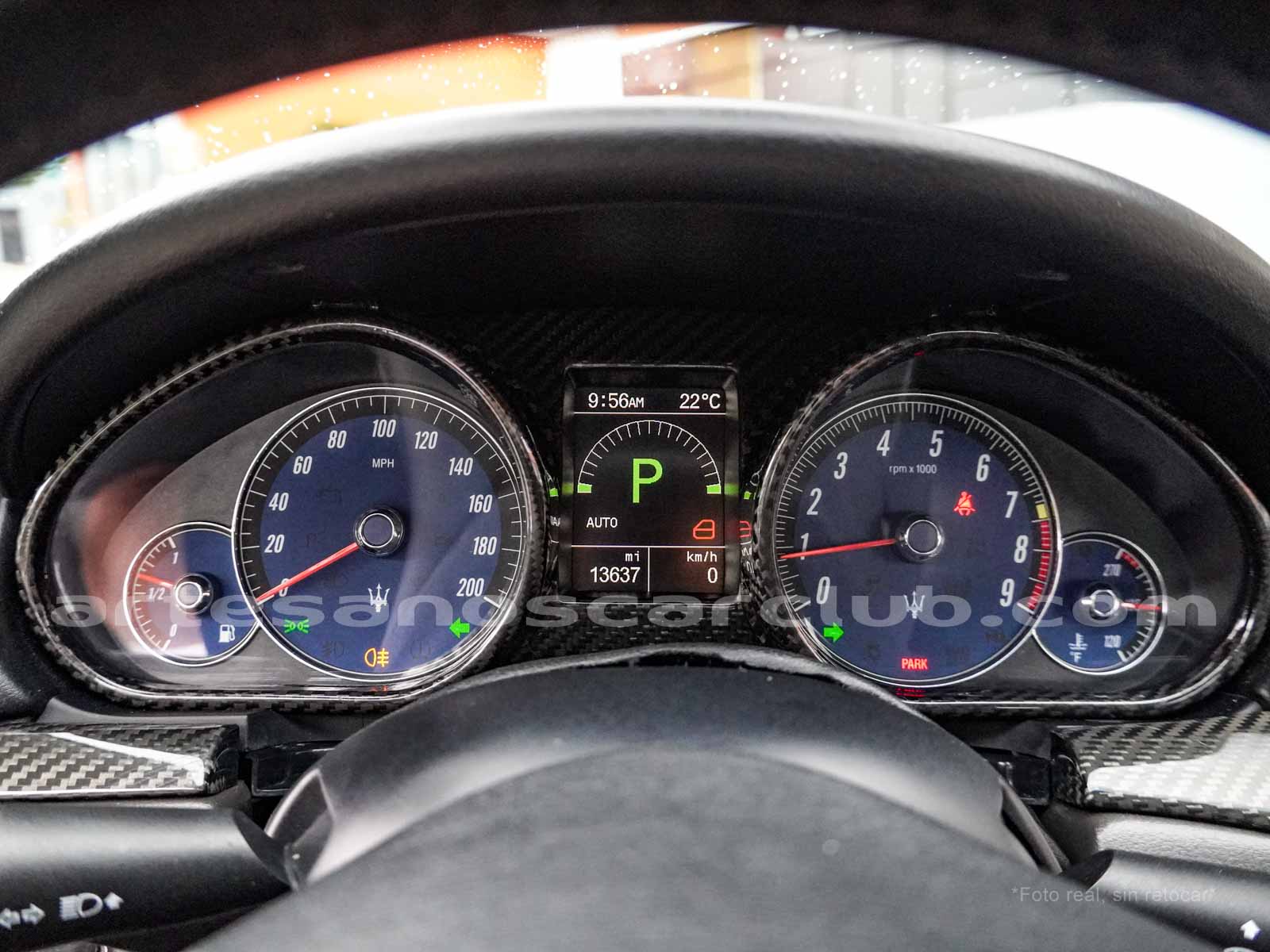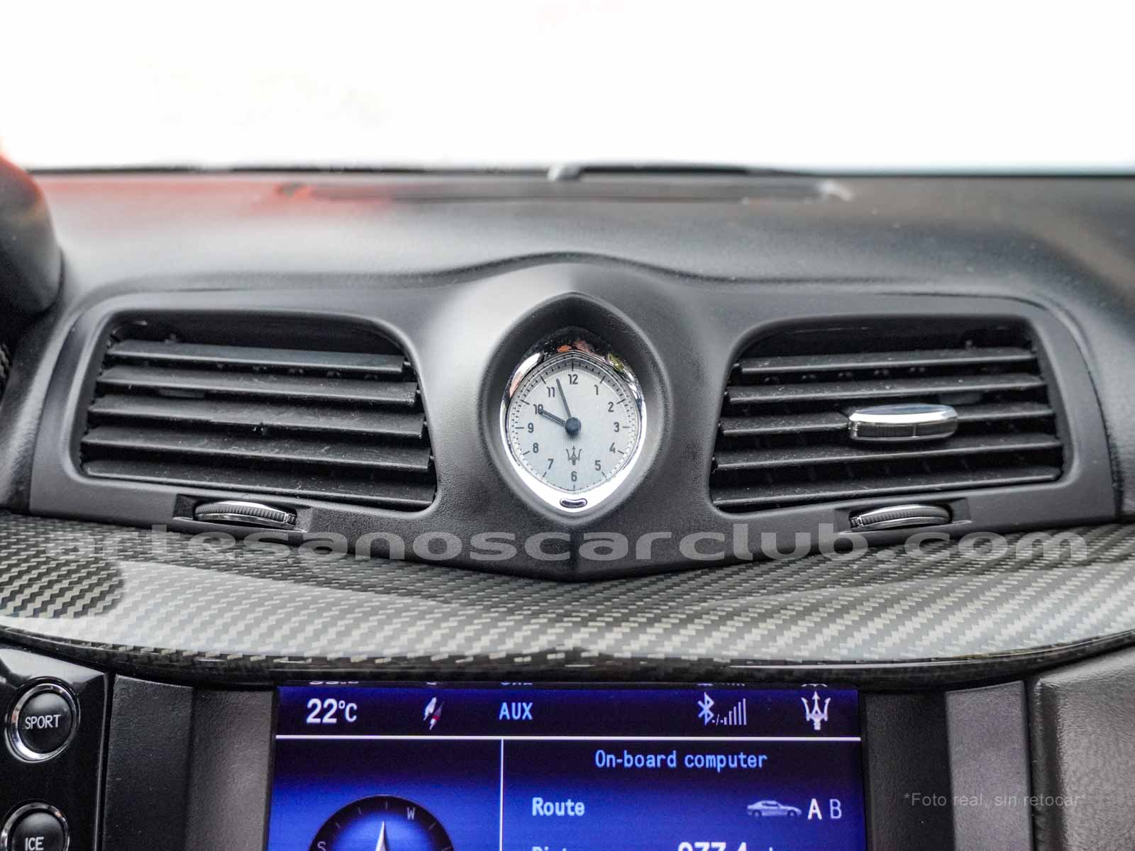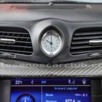 Reloj de consola central de diseño Maserati con fondo decorado blanco y retroiluminado.