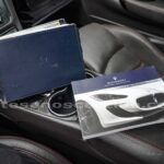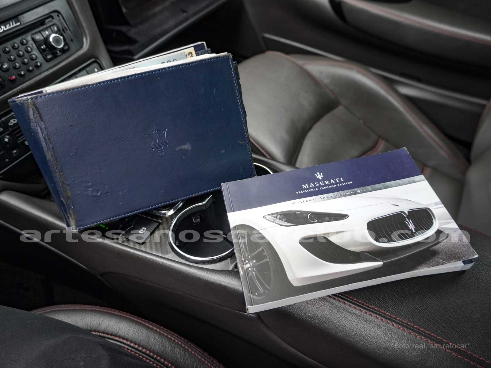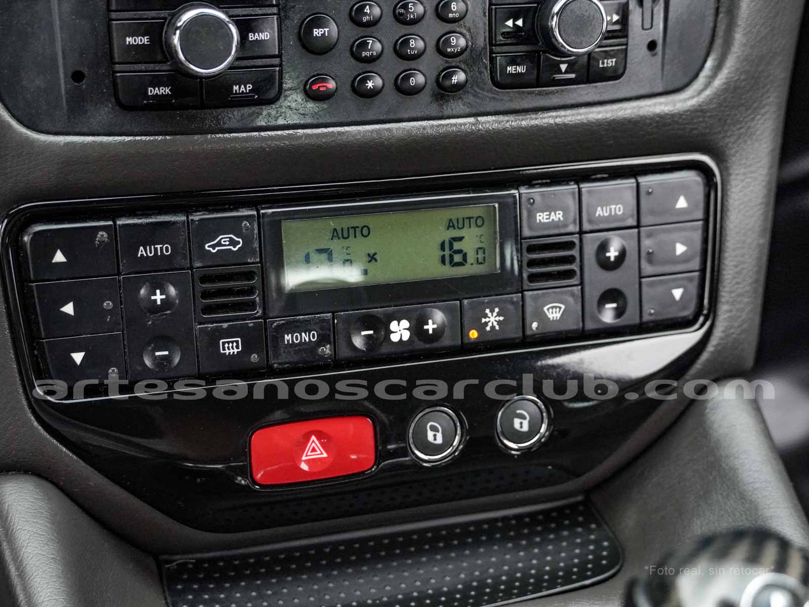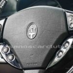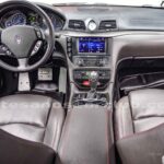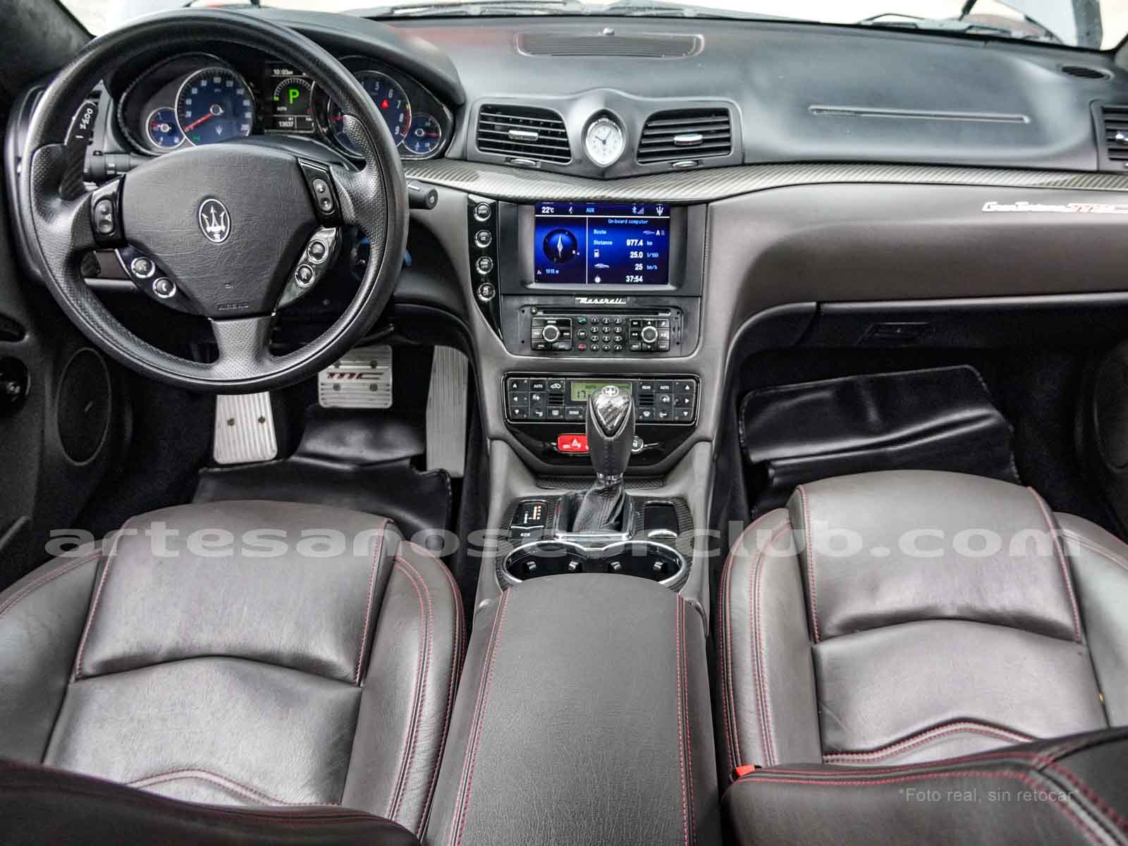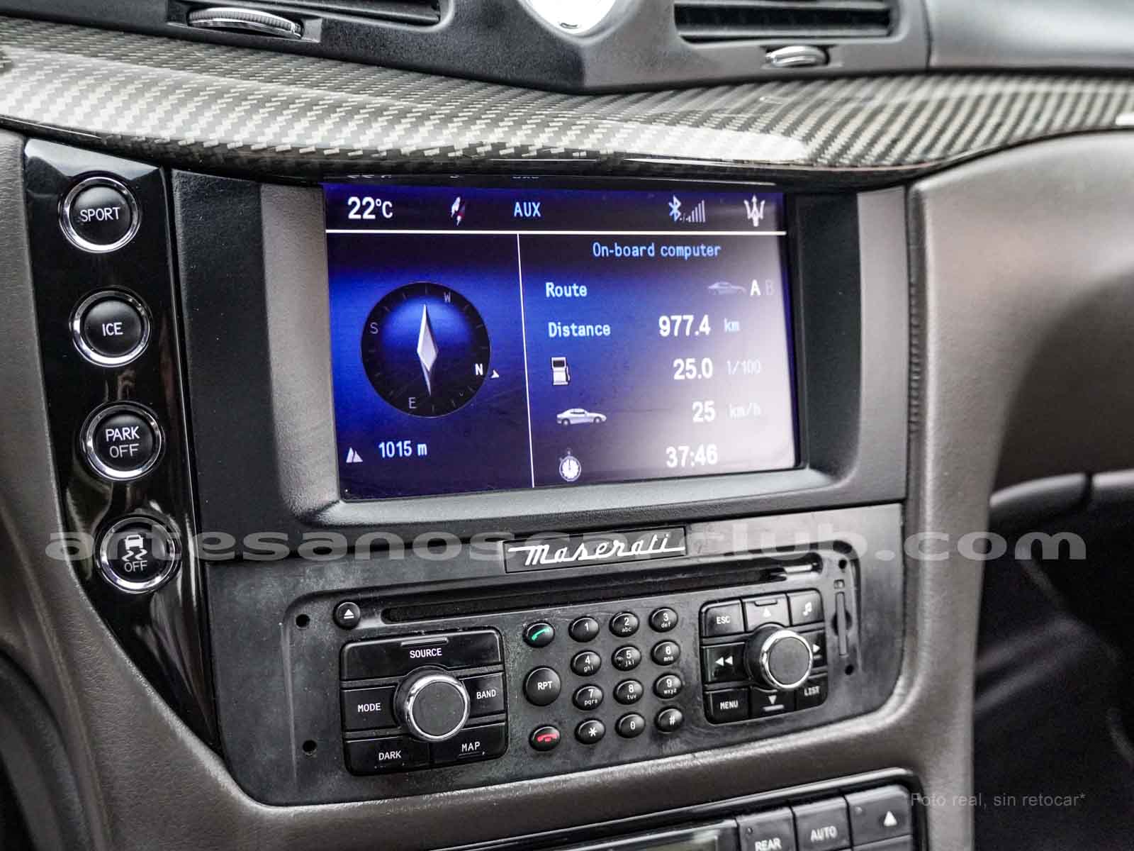 Reloj de consola central de diseño Maserati con fondo decorado blanco y retroiluminado.