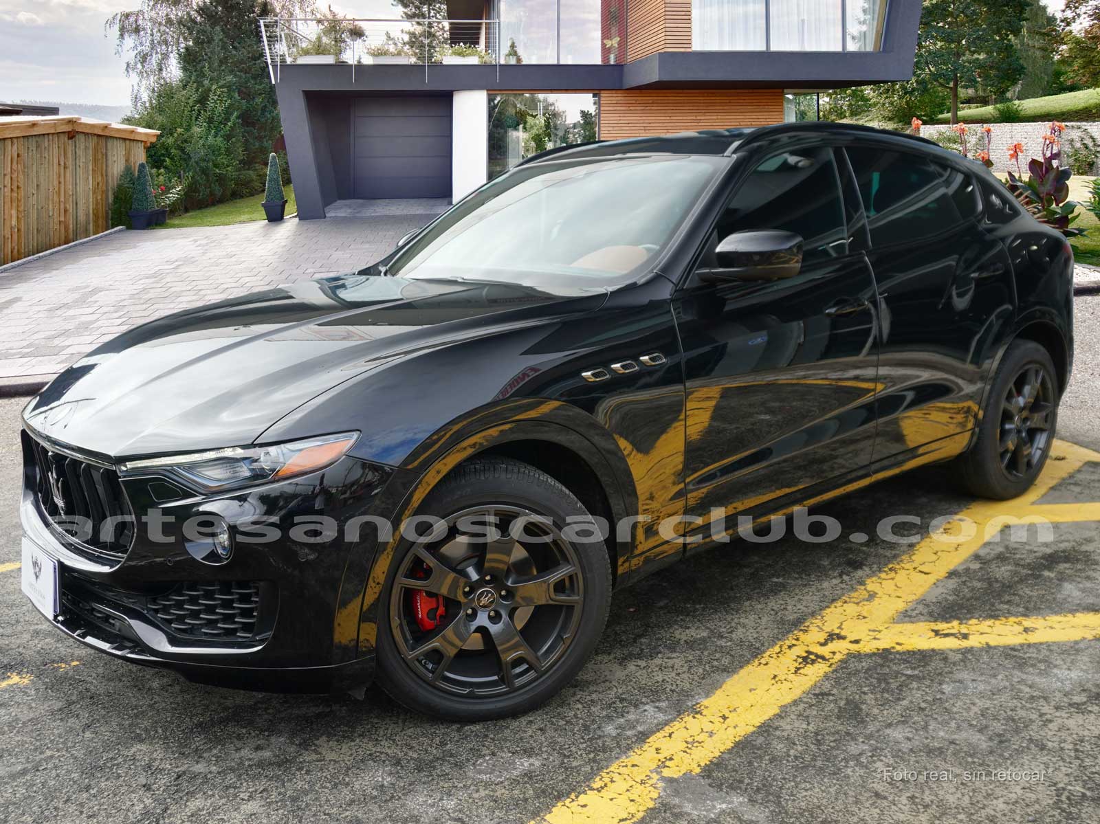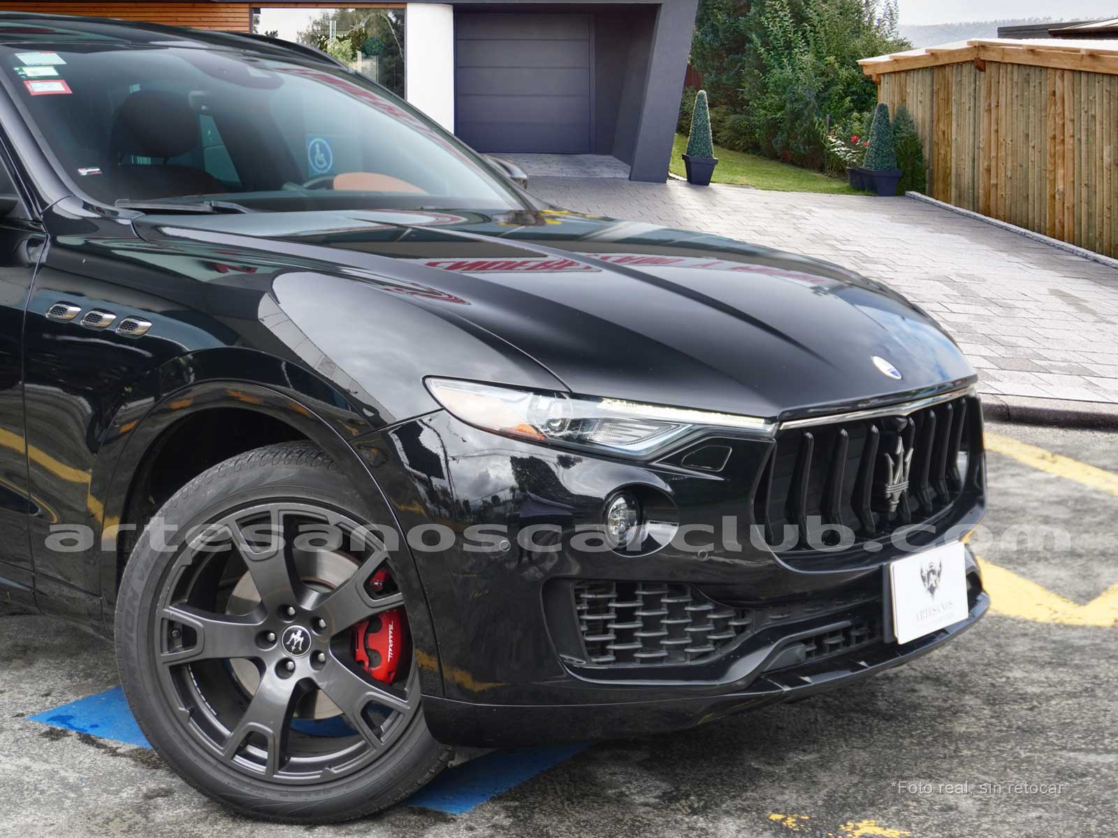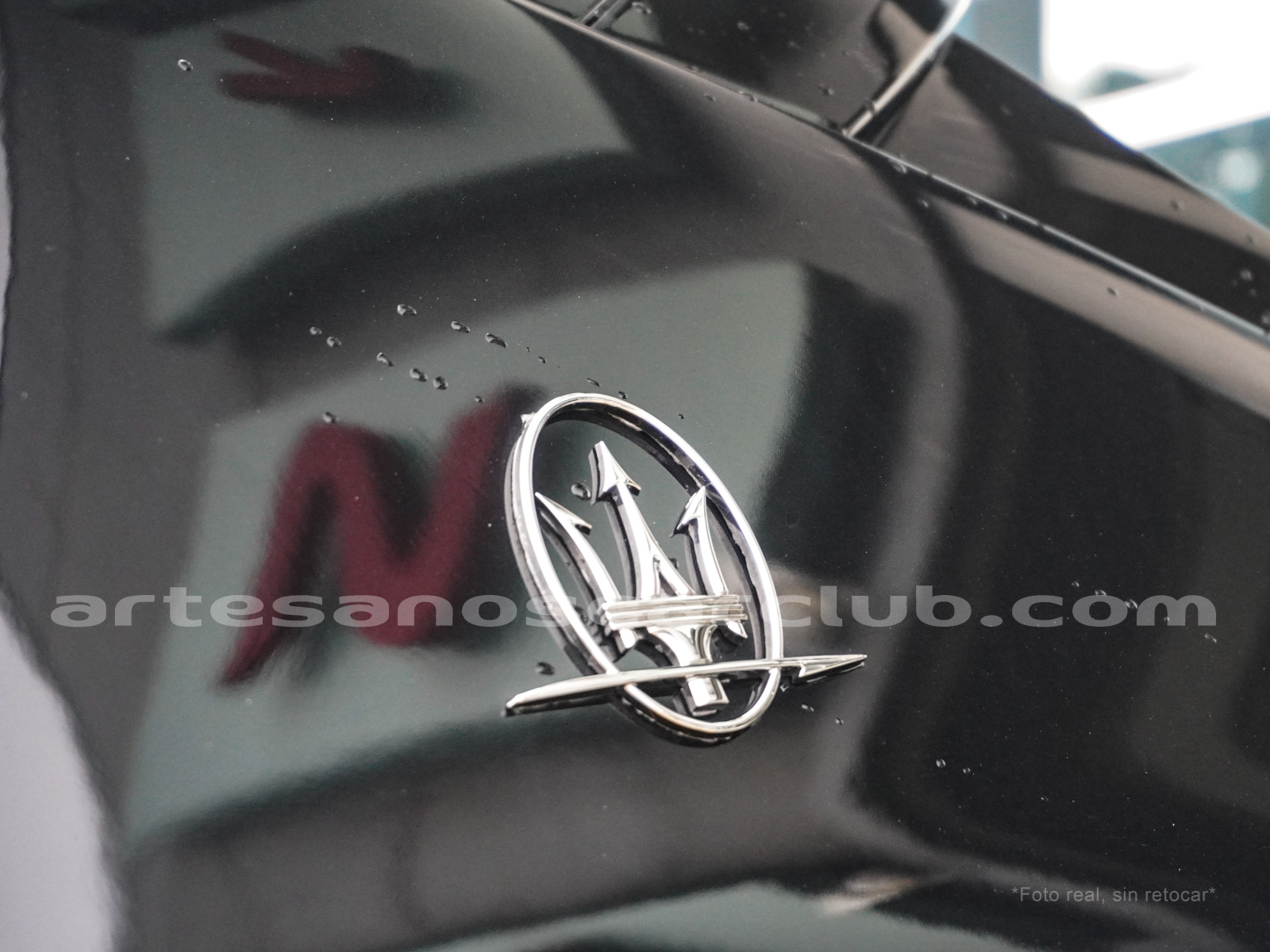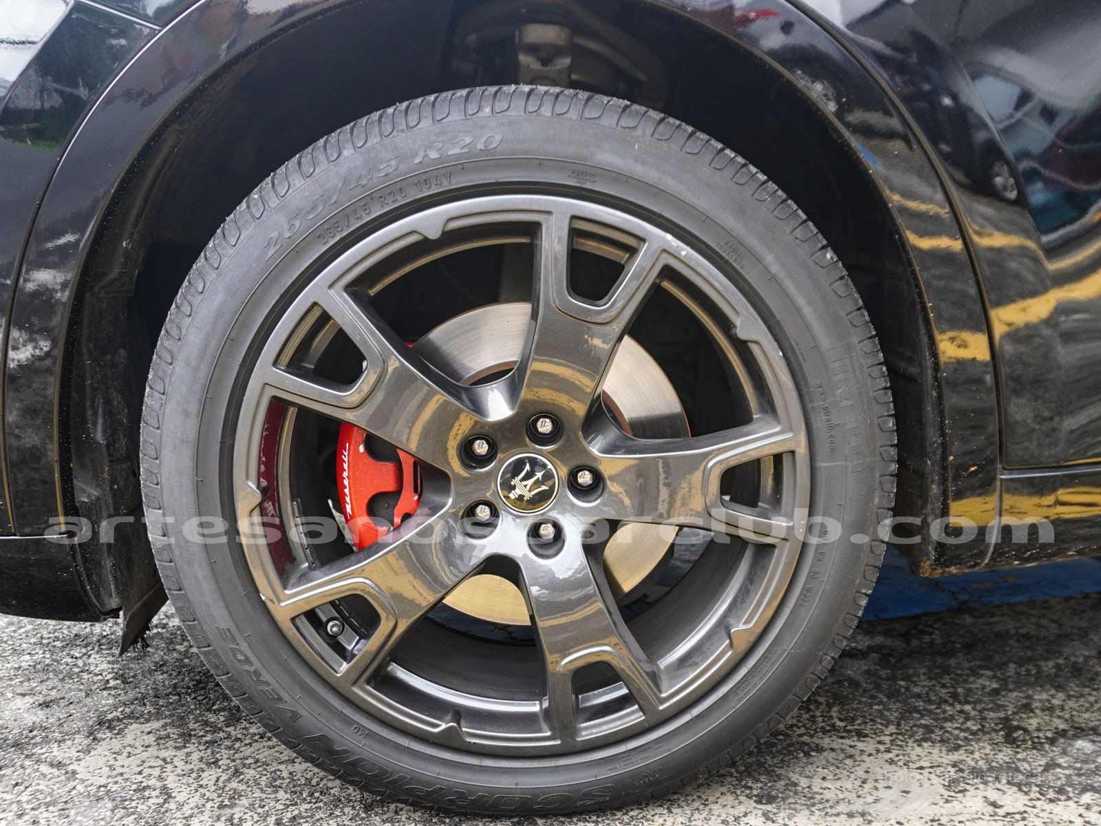Mordazas de frenos en color rojo con inscripción Maserati en negro.