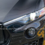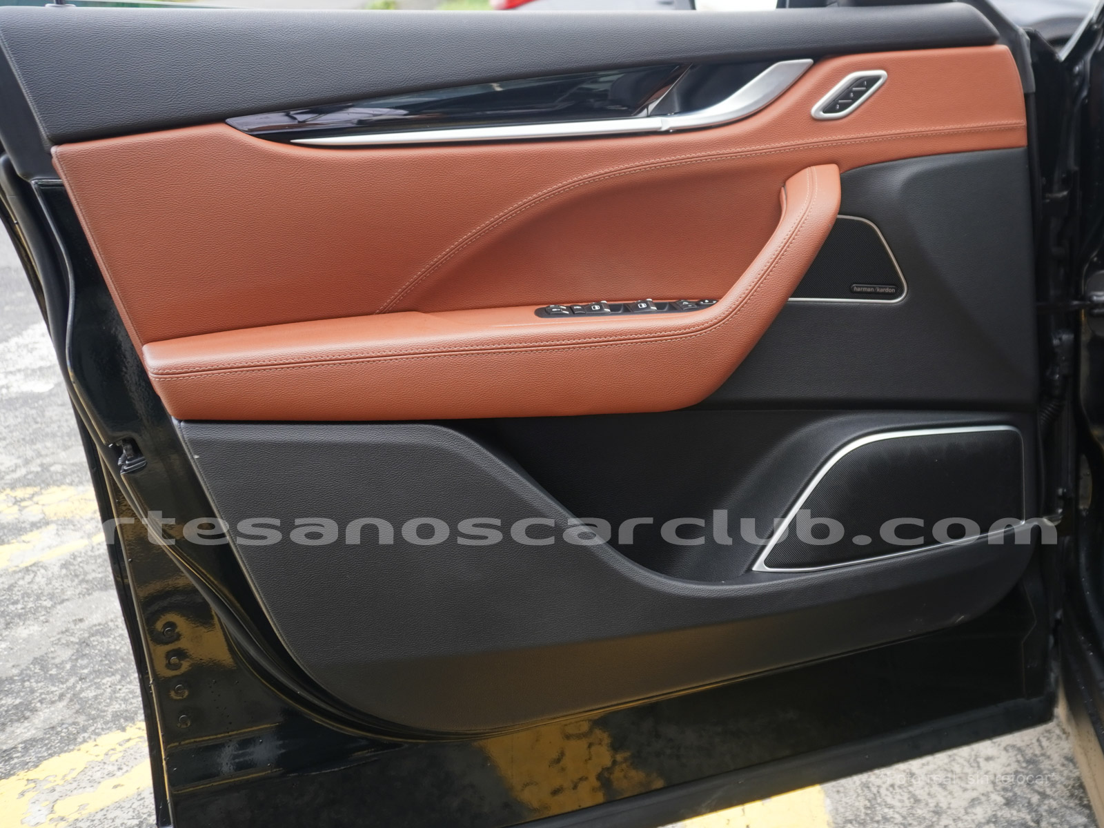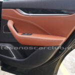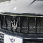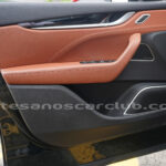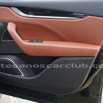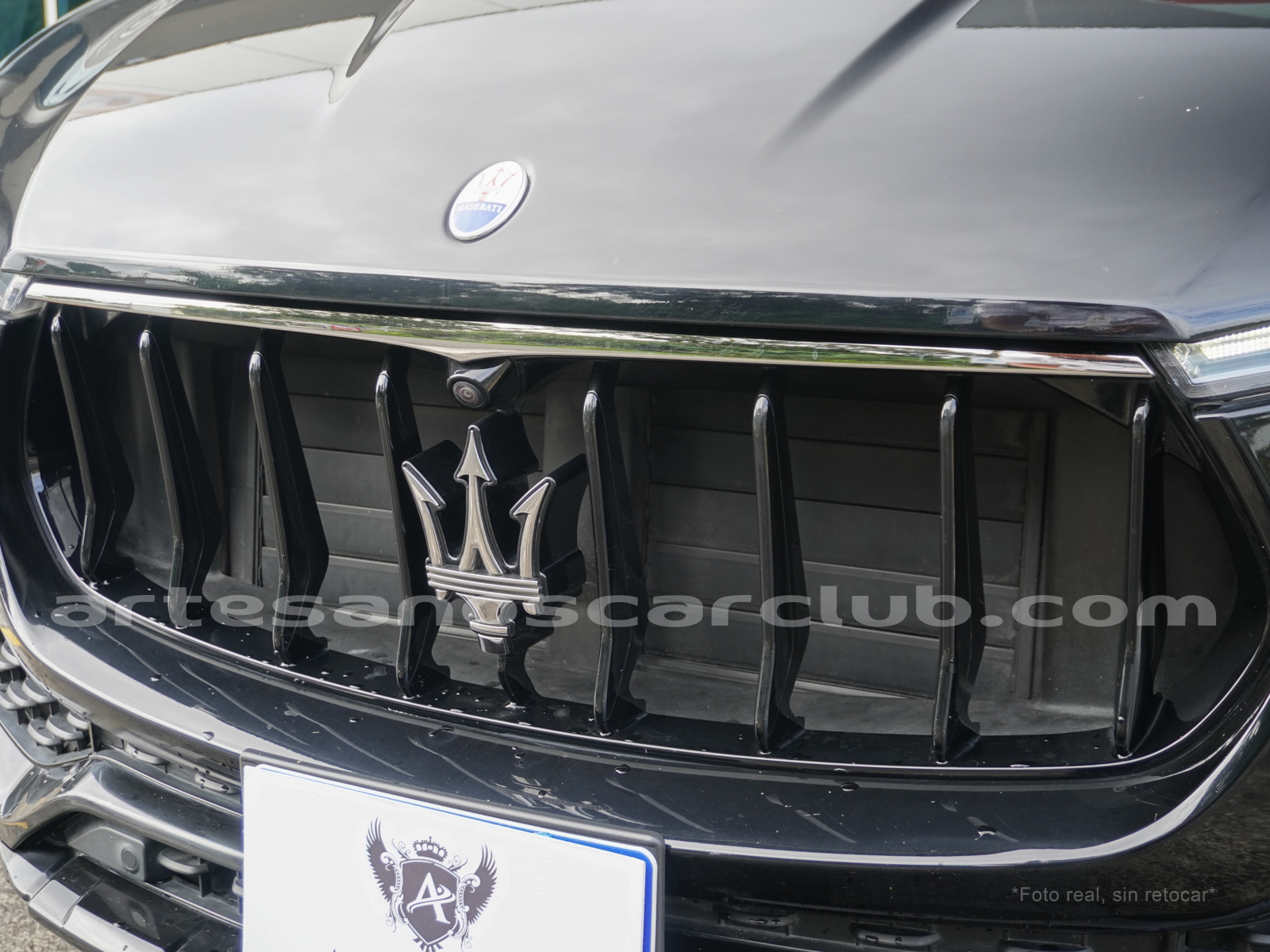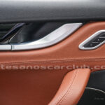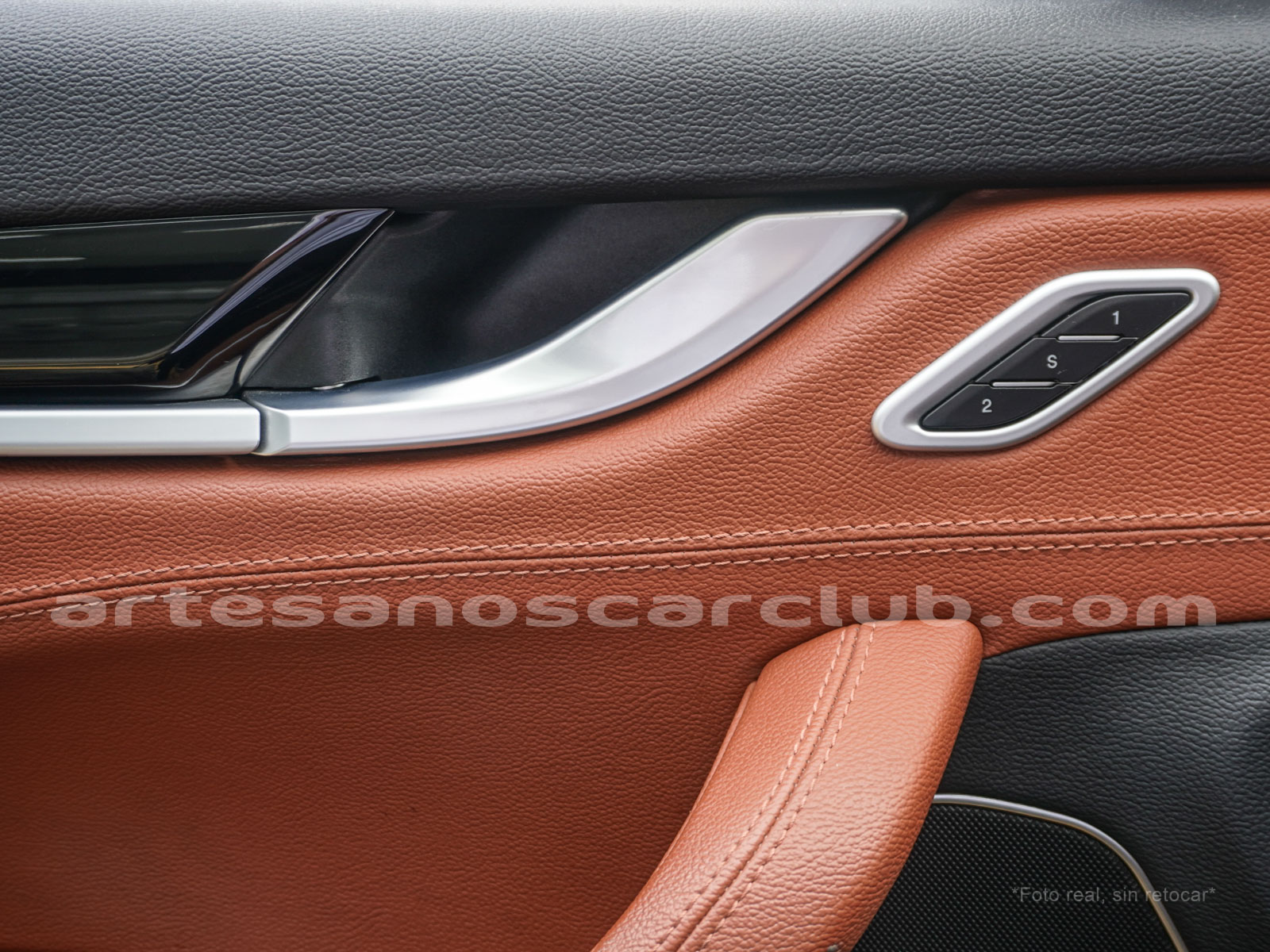Moldura de entrada de puerta en acero con logo Maserati iluminado.