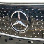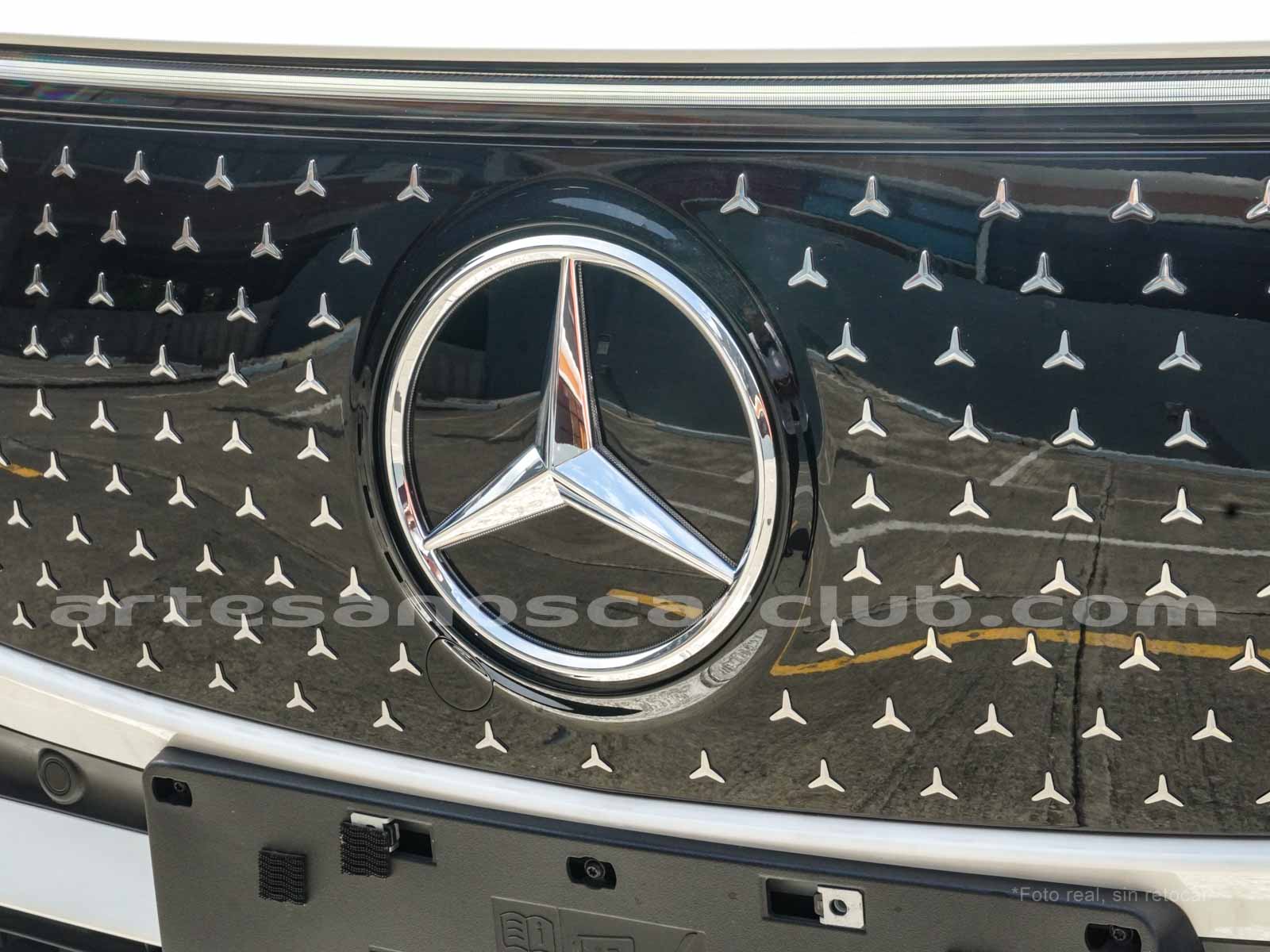 Parrilla frontal cerrada con marco y línea cromada con fondo negro y emblema Mercedes Benz de última generación.