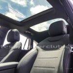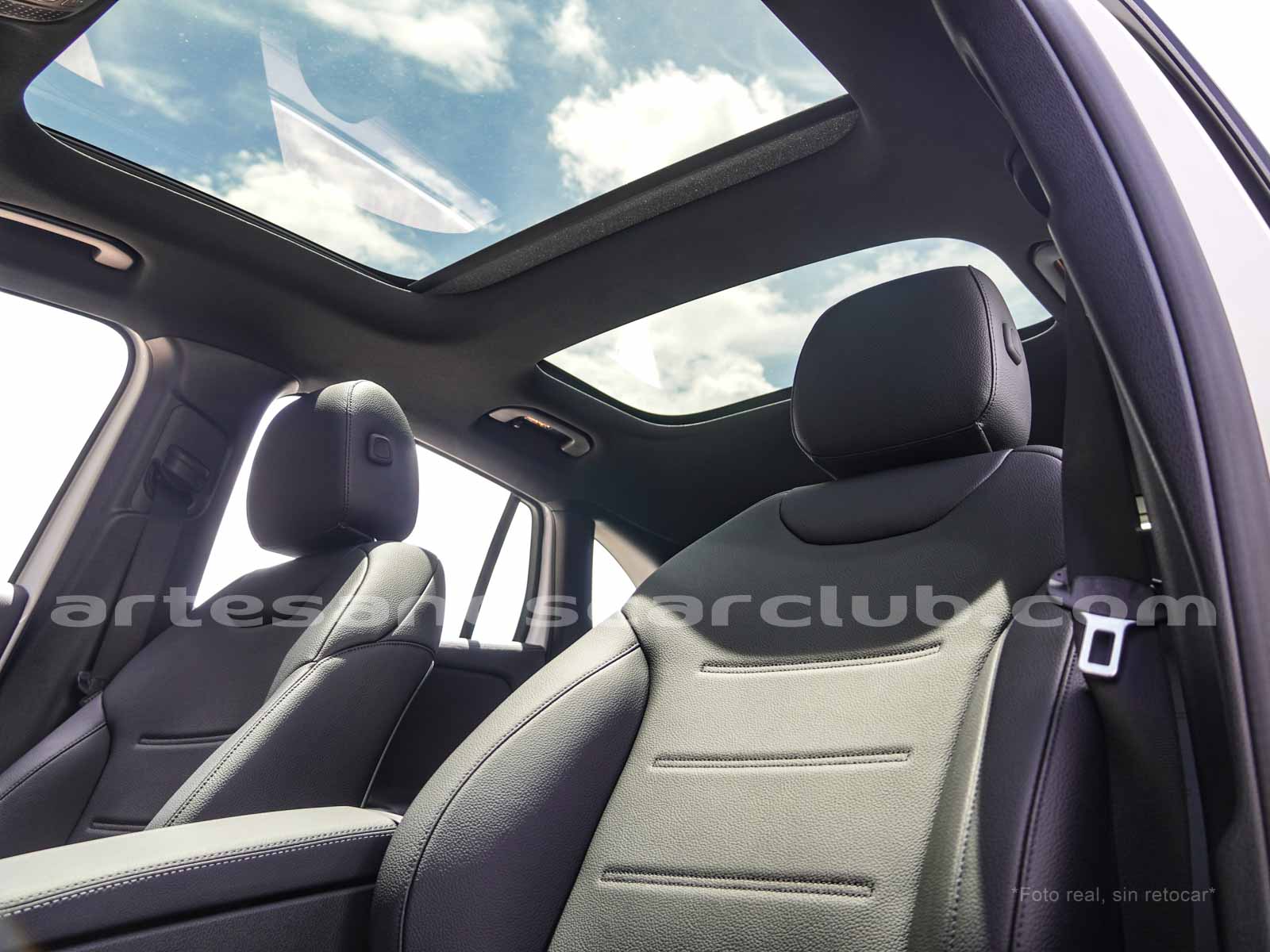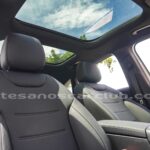 Doble techo en cristal panorámico elevable y deslizable la sección delantera con cortinas antisolares en textil negro.