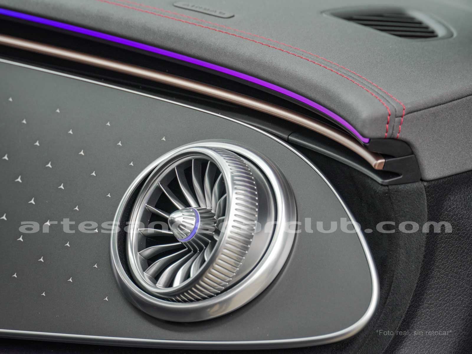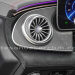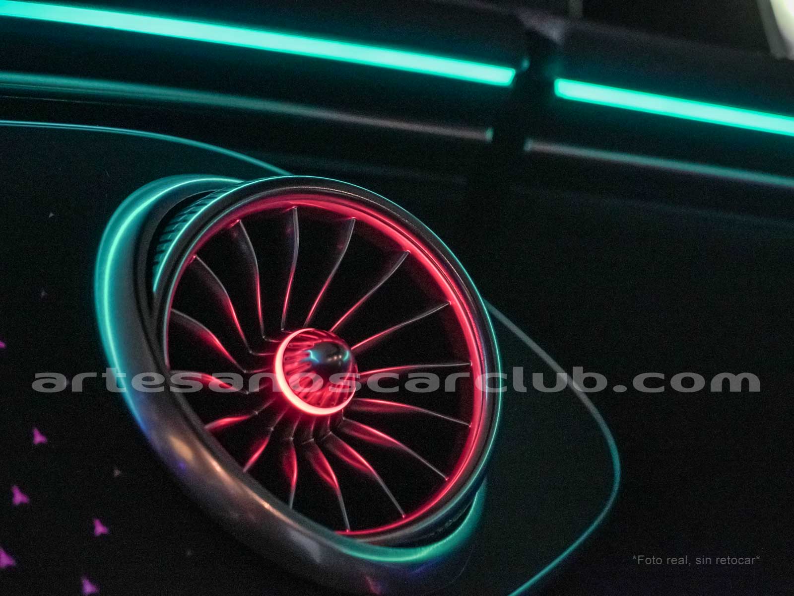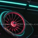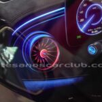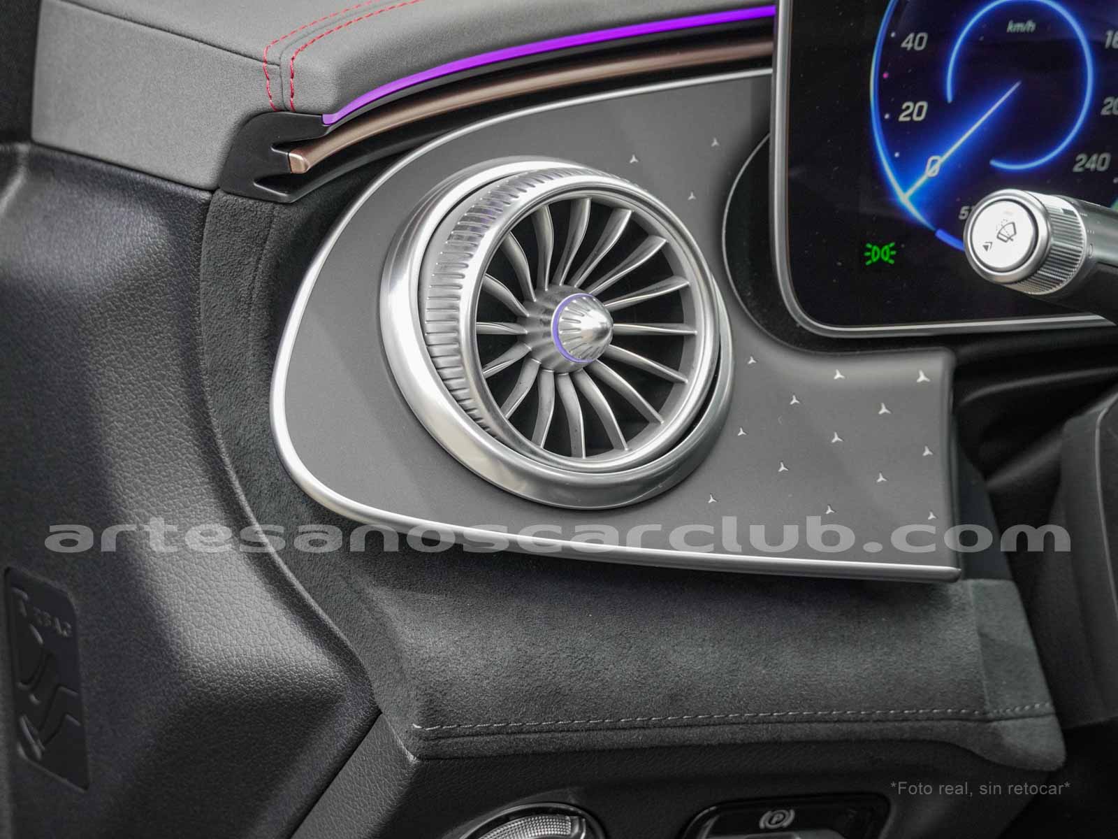 Difusores interiores de aire delanteros tipo turbina con anillos decorativos de aluminio iluminados.