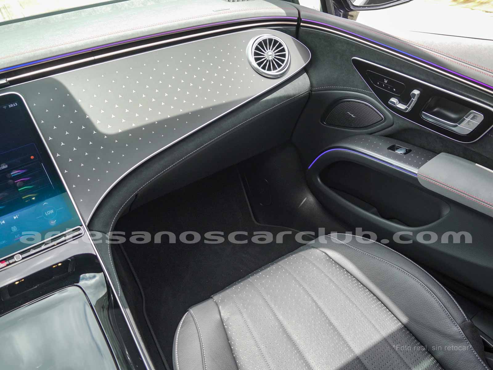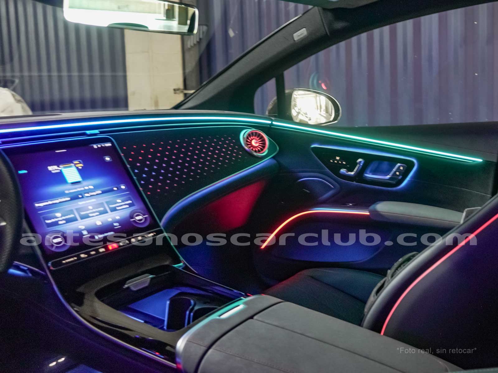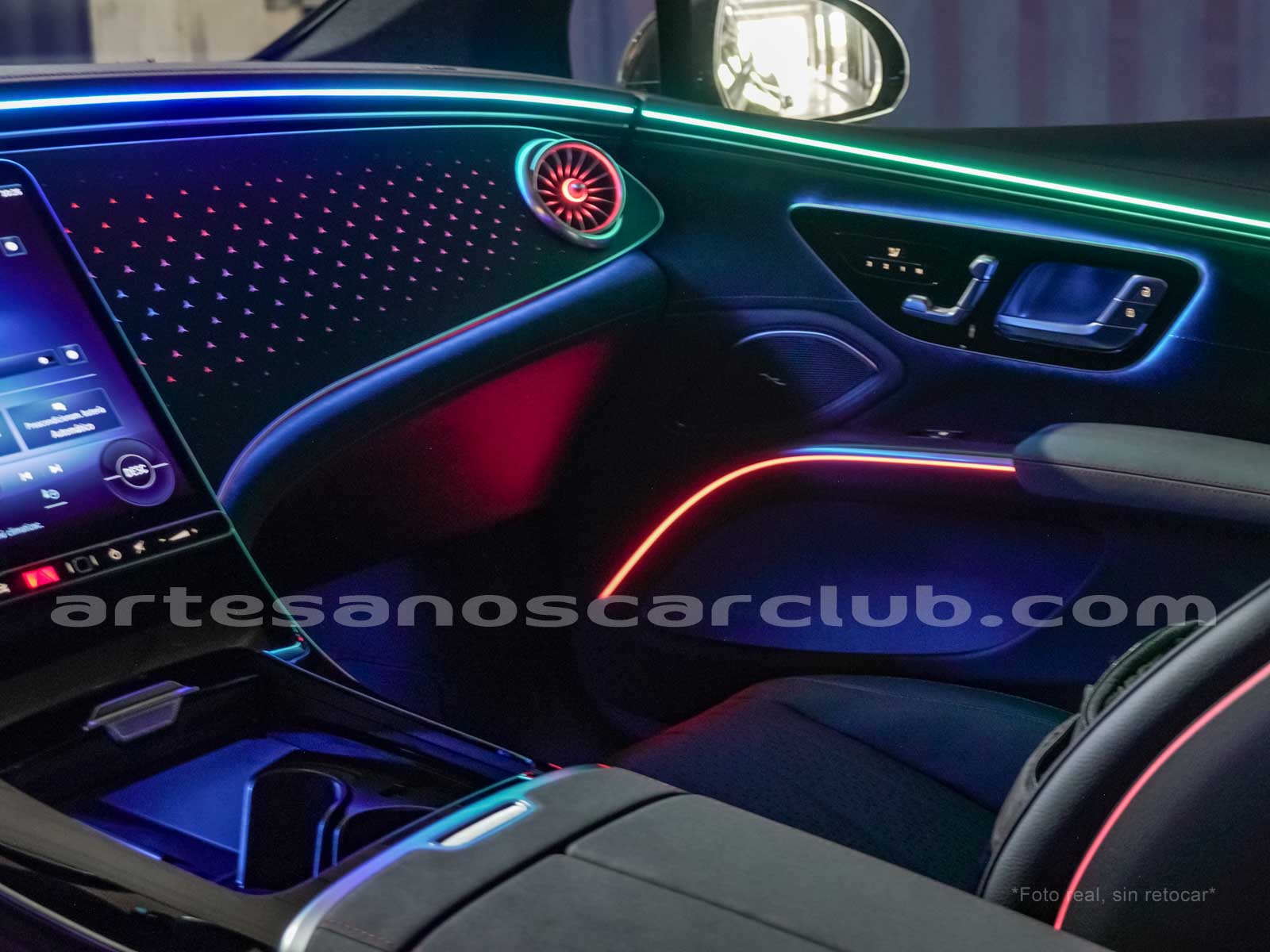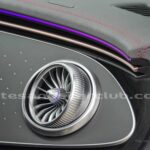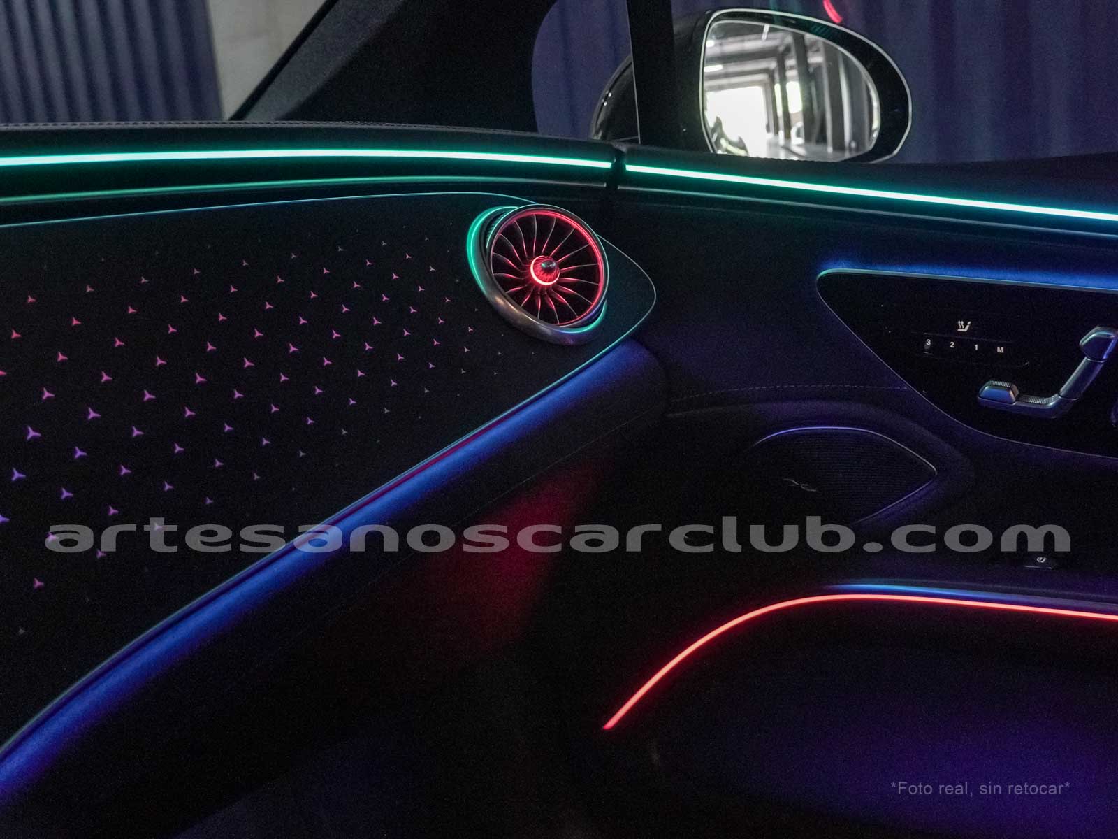 Difusores interiores de aire delanteros tipo turbina con anillos decorativos de aluminio iluminados.