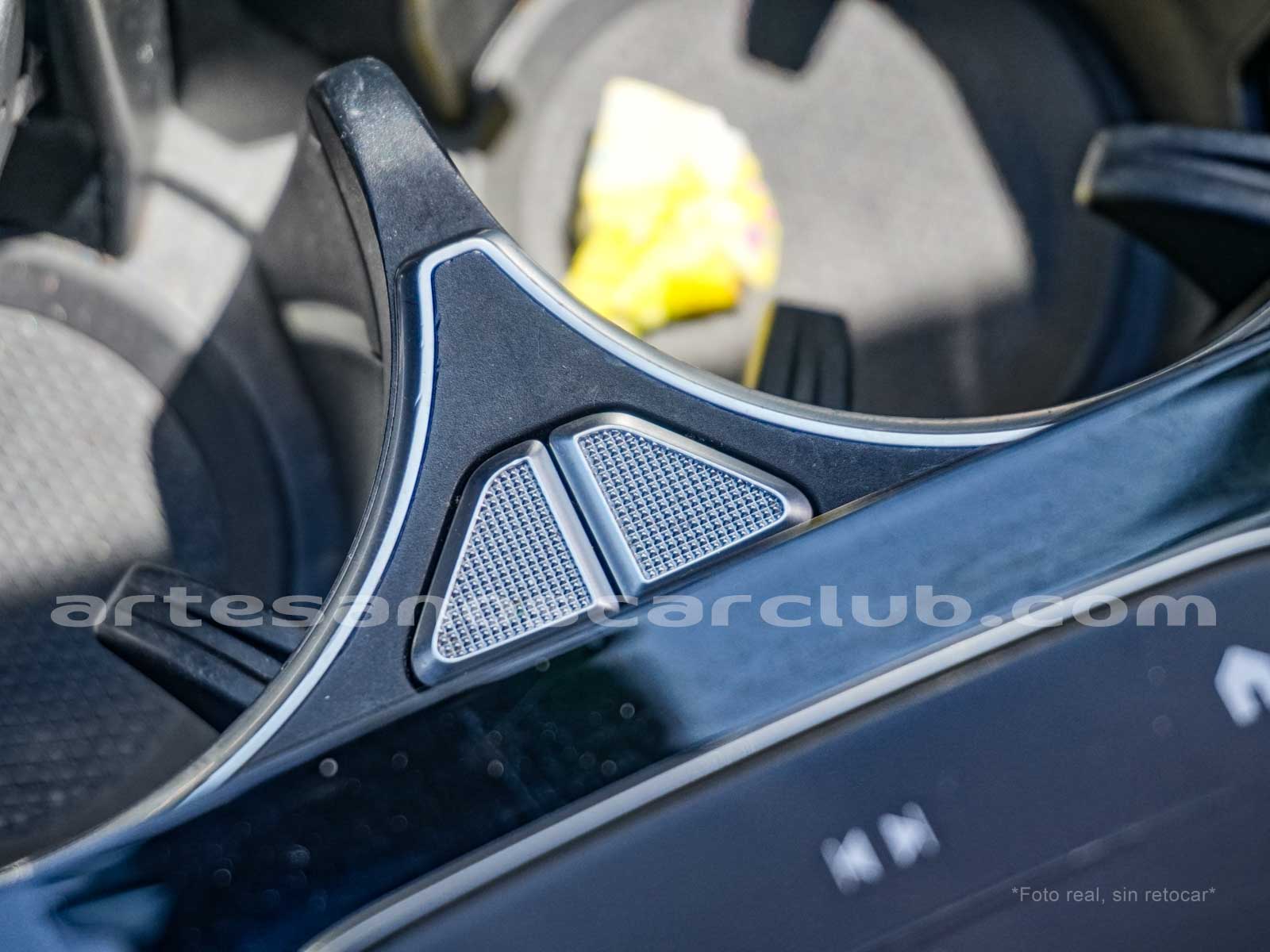 Volante deportivo multifunción en cuero Napa con moldura decorativa en en cromo plateado.
