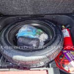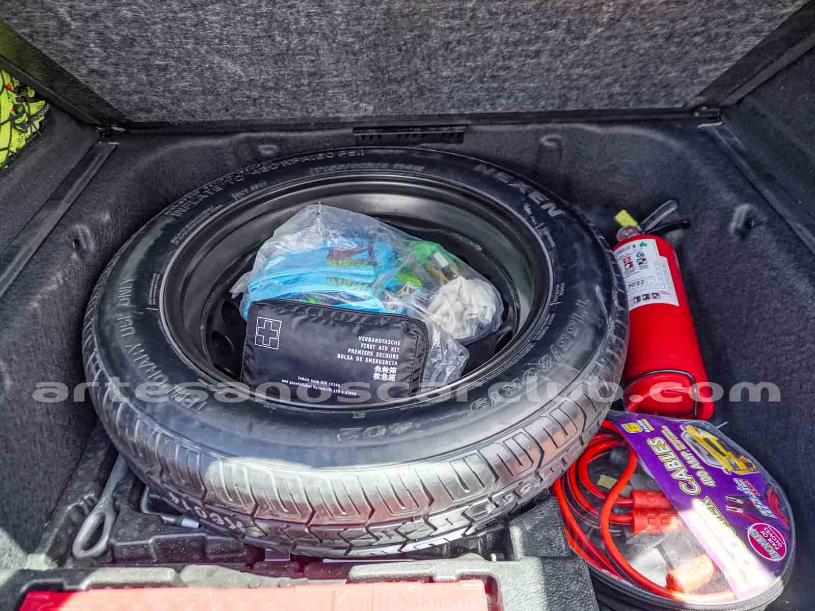 Herramienta y rueda de repuesto bajo piso de baúl.