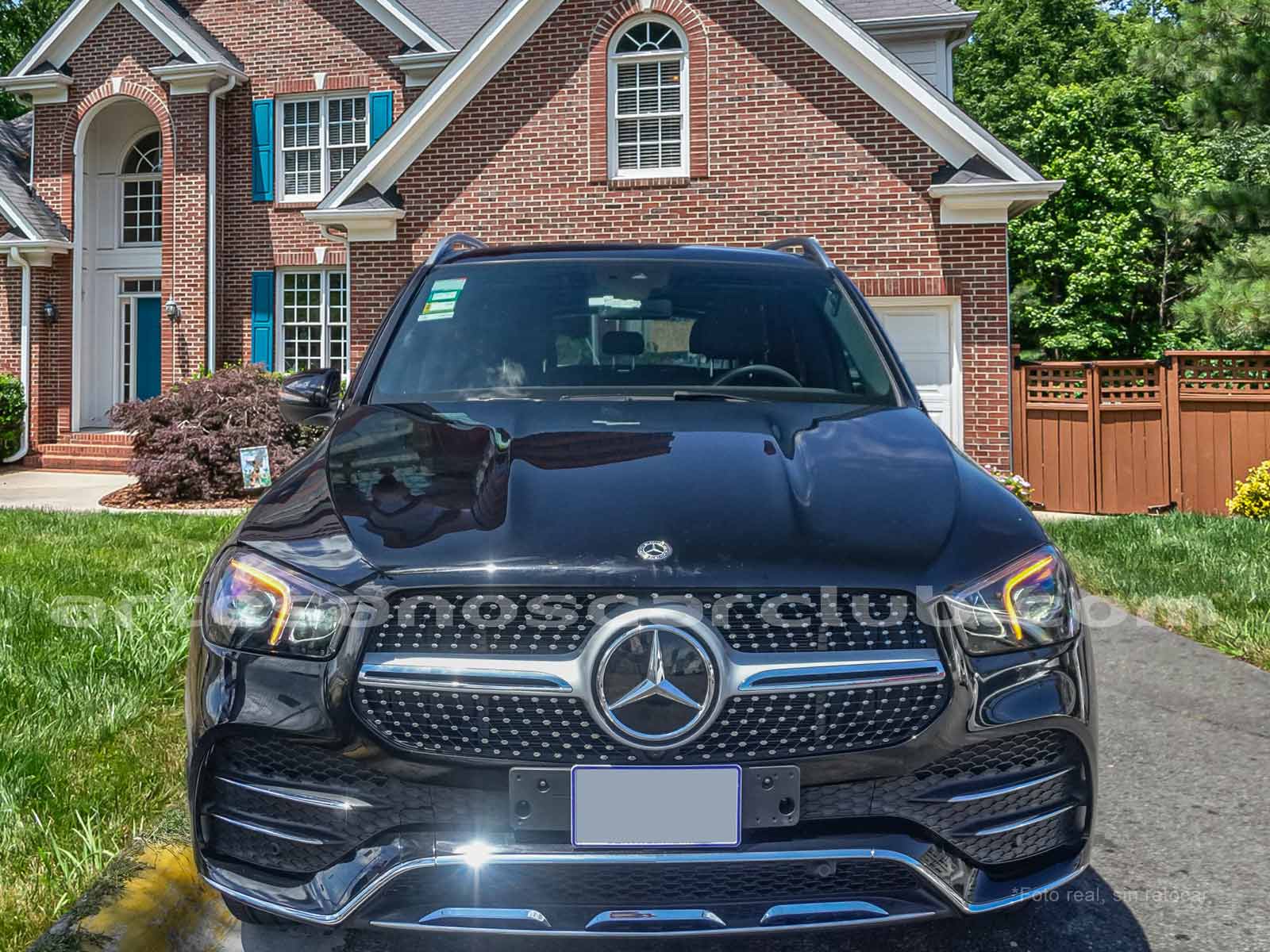 Parrilla frontal con 2 líneas horizontales con apliques cromados tipo diamante en cromo con fondo negro con emblema «Mercedes Benz» de última generación.