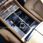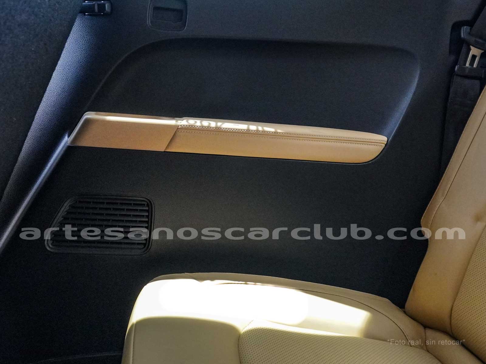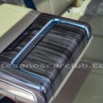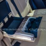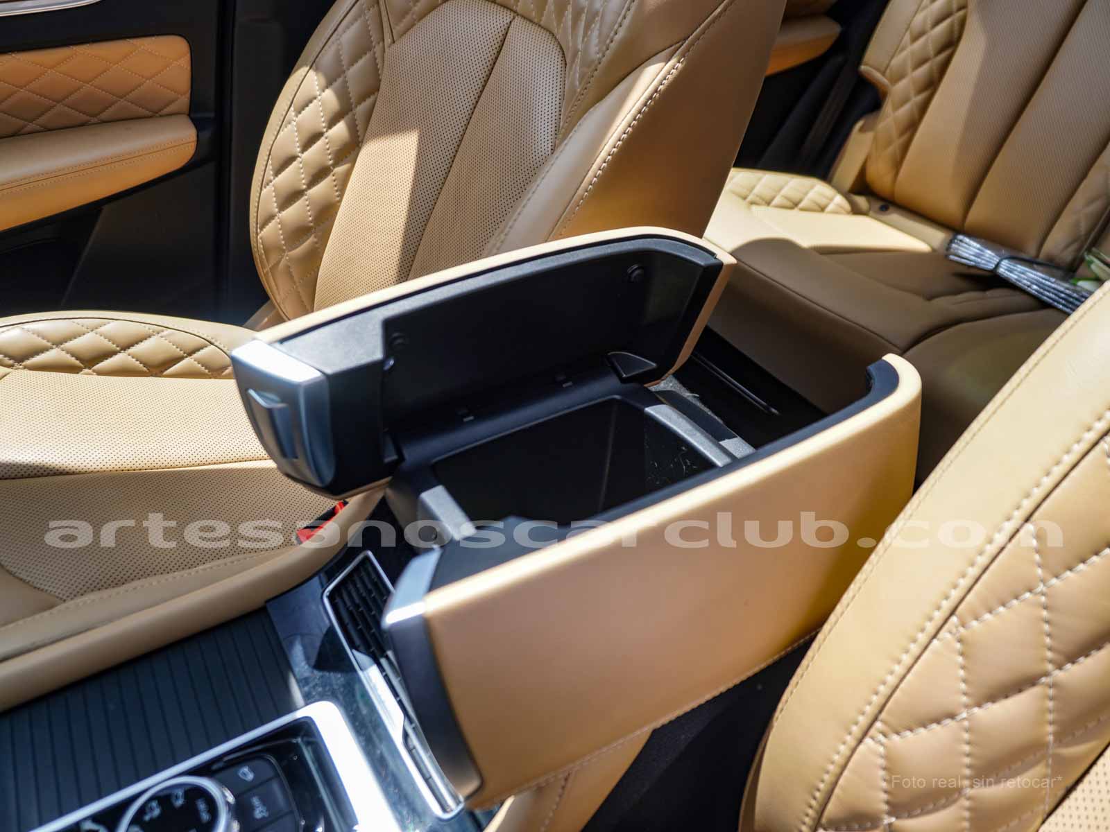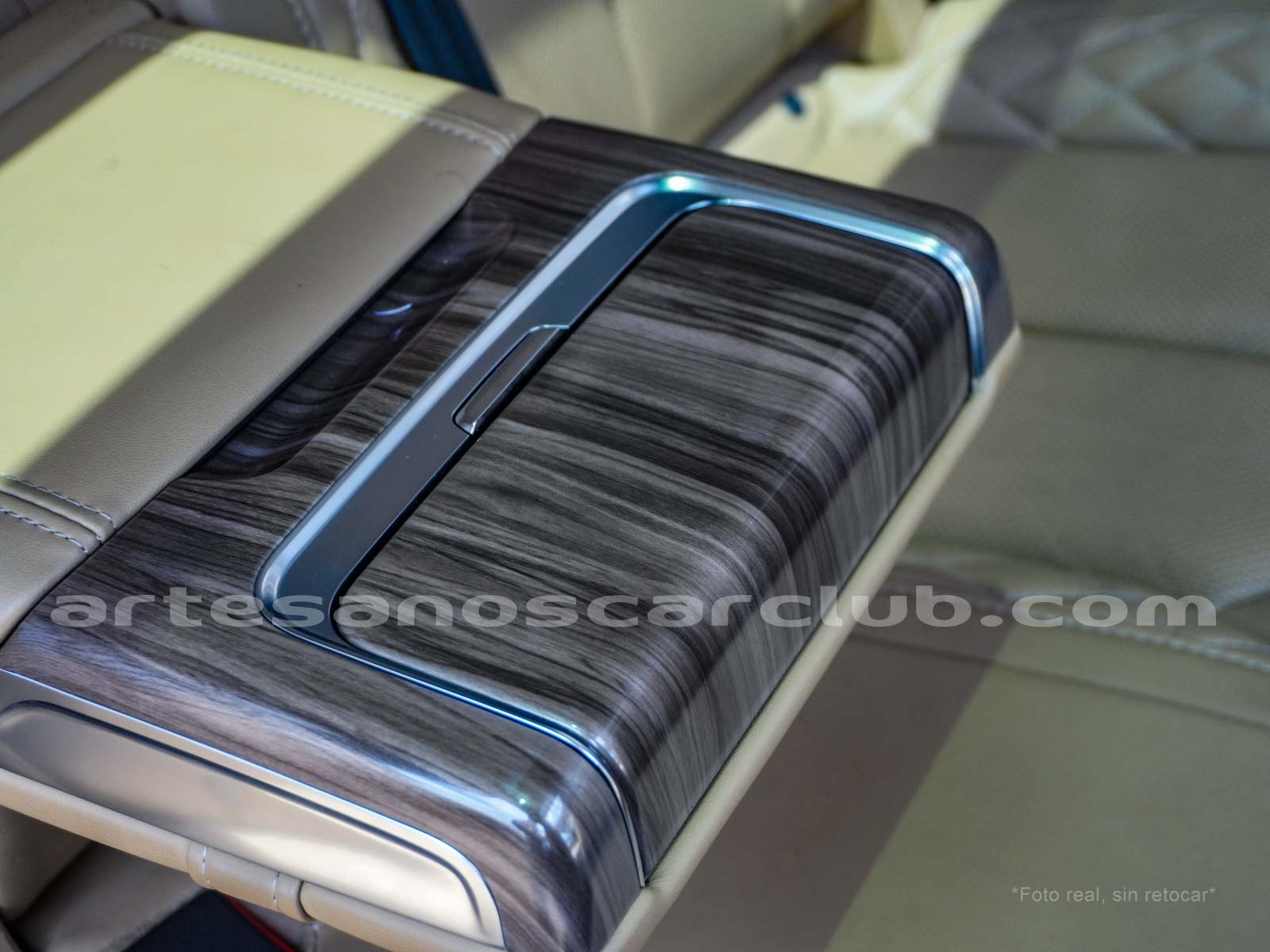 - Apoyabrazos de 2da fila de asientos en piel beige con madera y decoraciones en aluminio satinado.