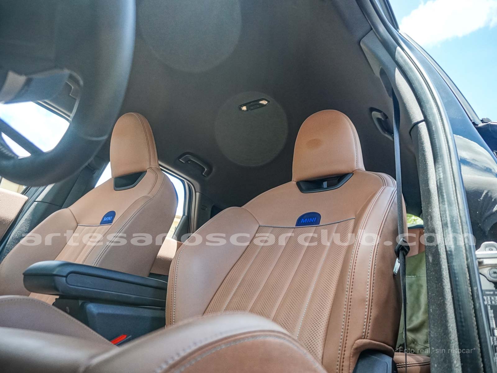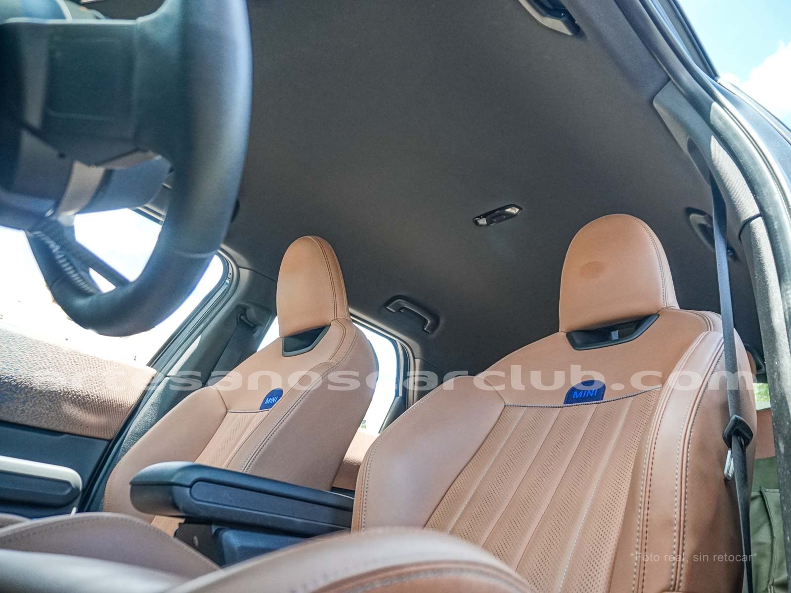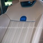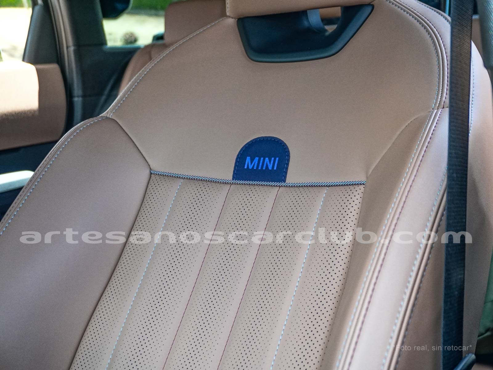 • Sillas deportivas en piel microperforada marrón “Vescin Vintage”  con costuras dobles del mismo color e inscripción Mini en respaldo.