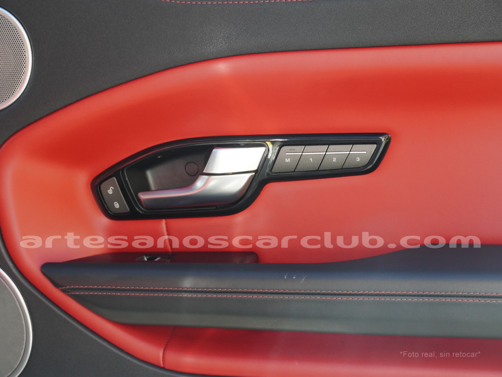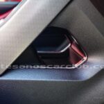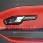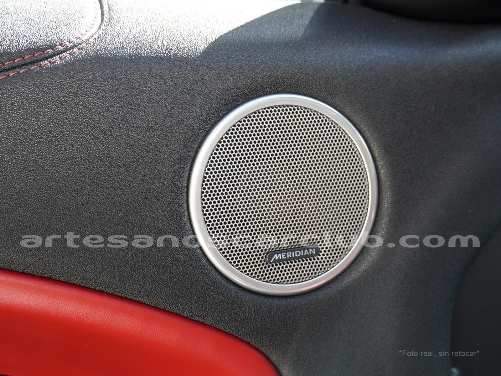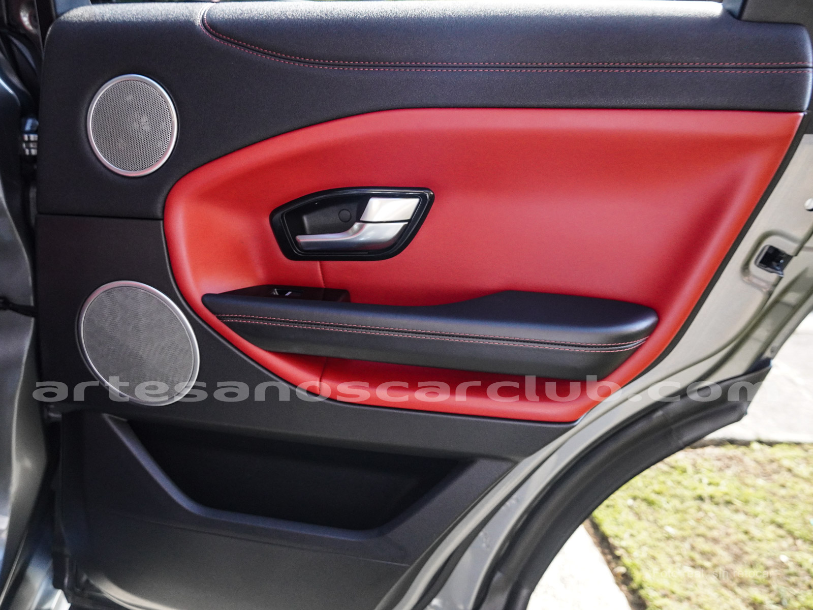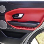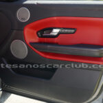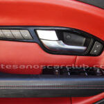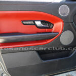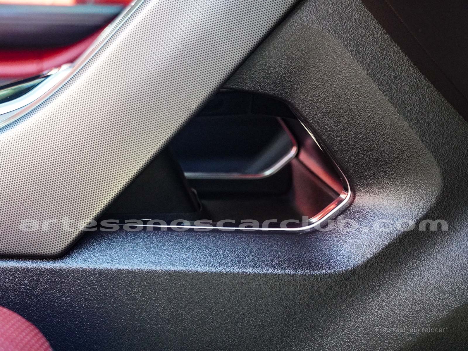 Interior de puertas en piel con costuras de contraste rojas.