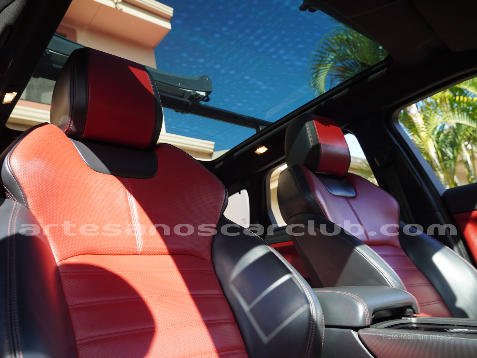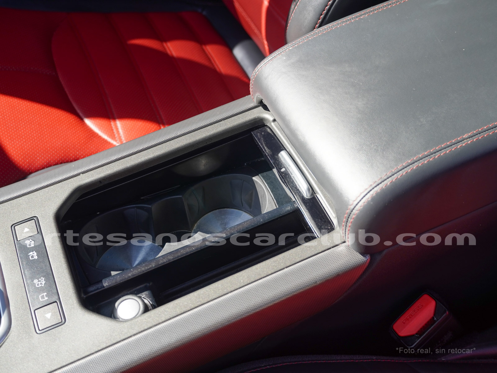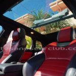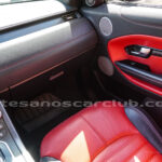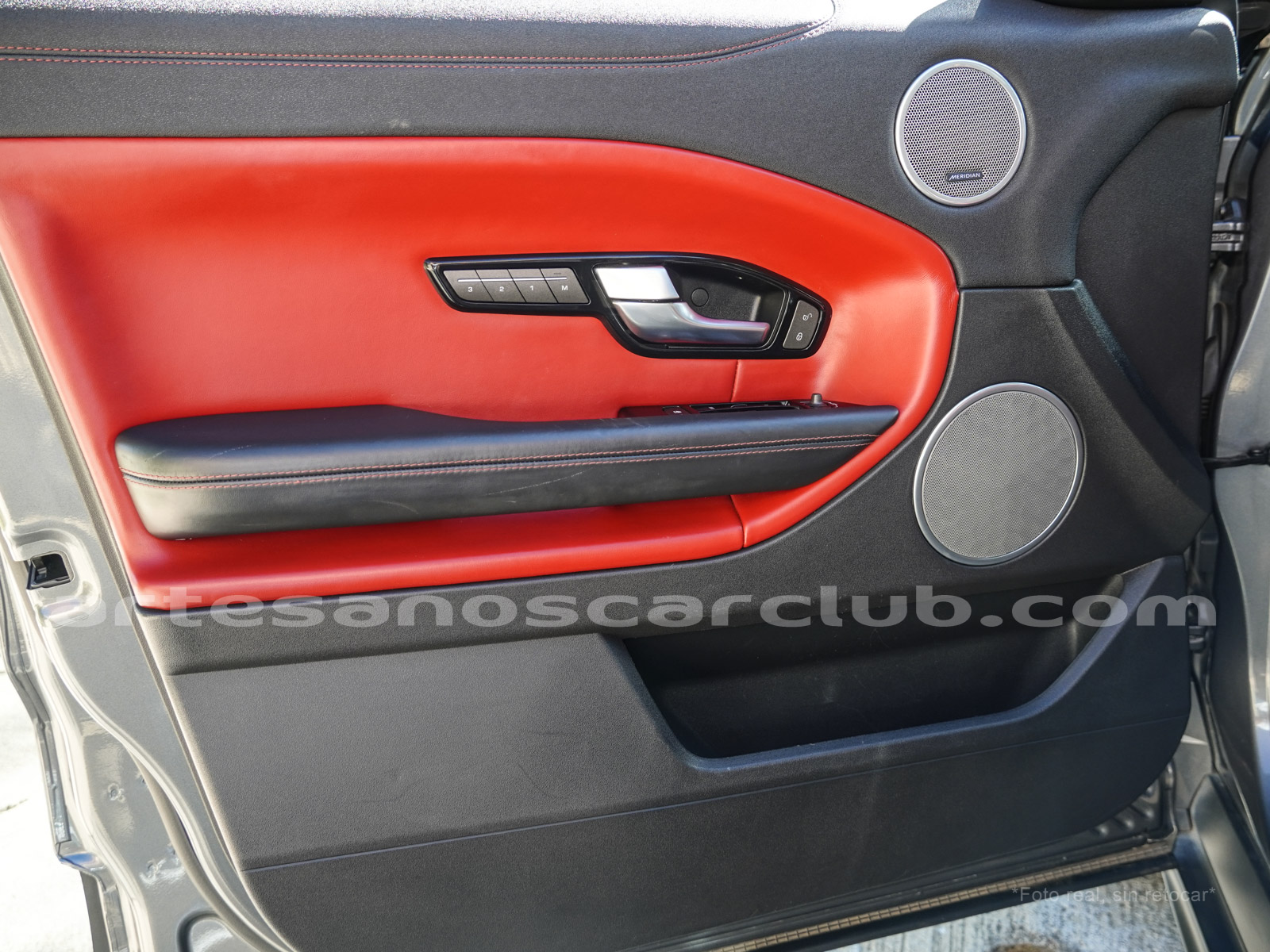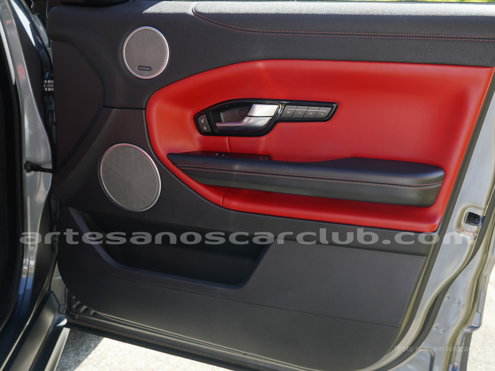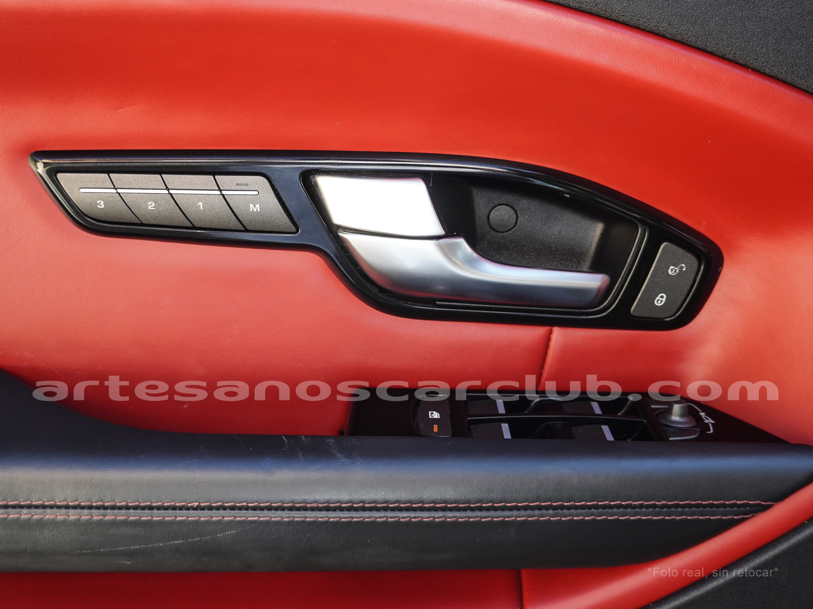 Interior de puertas en piel con costuras de contraste rojas.