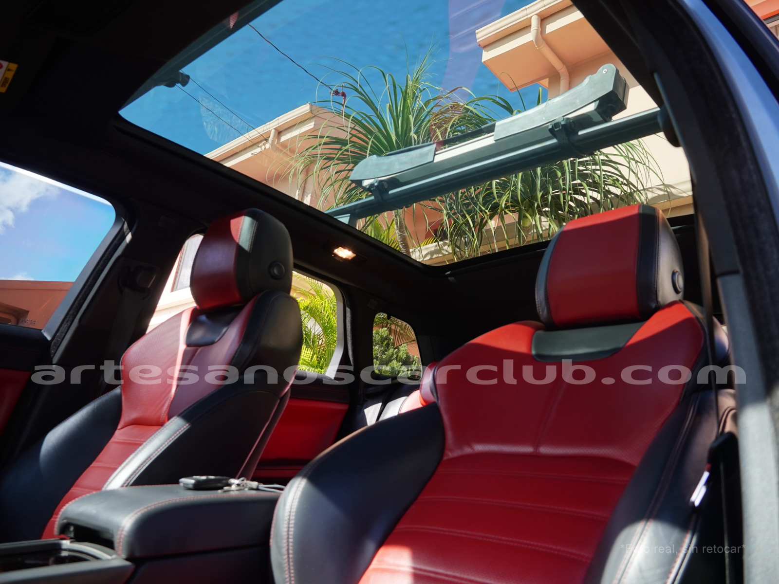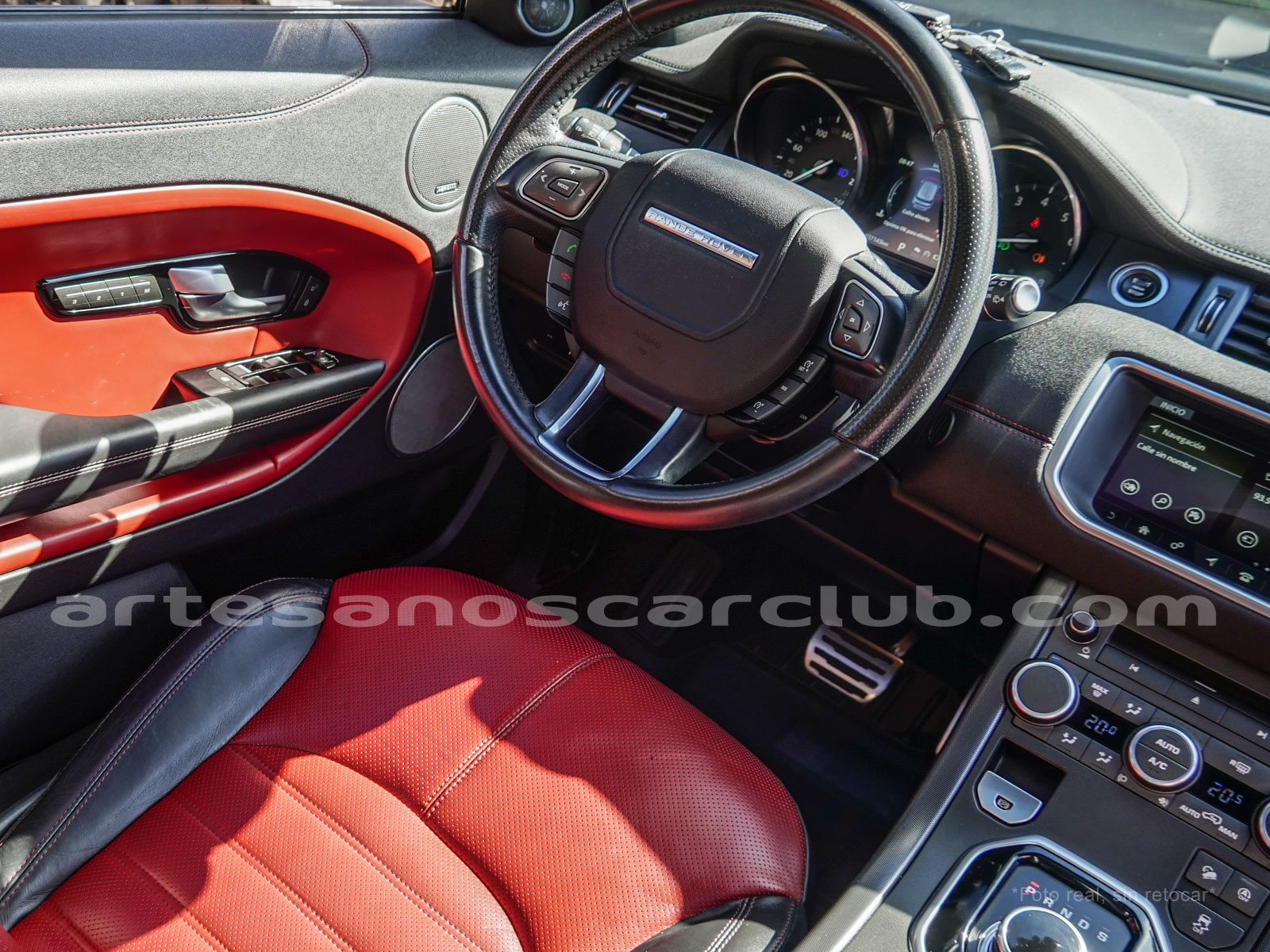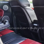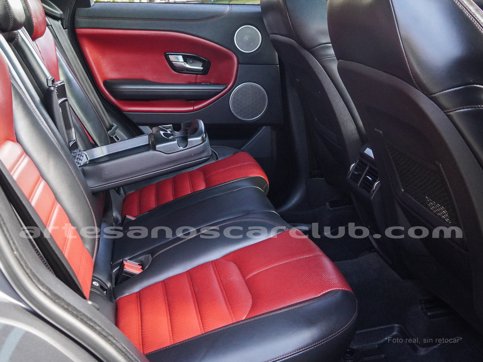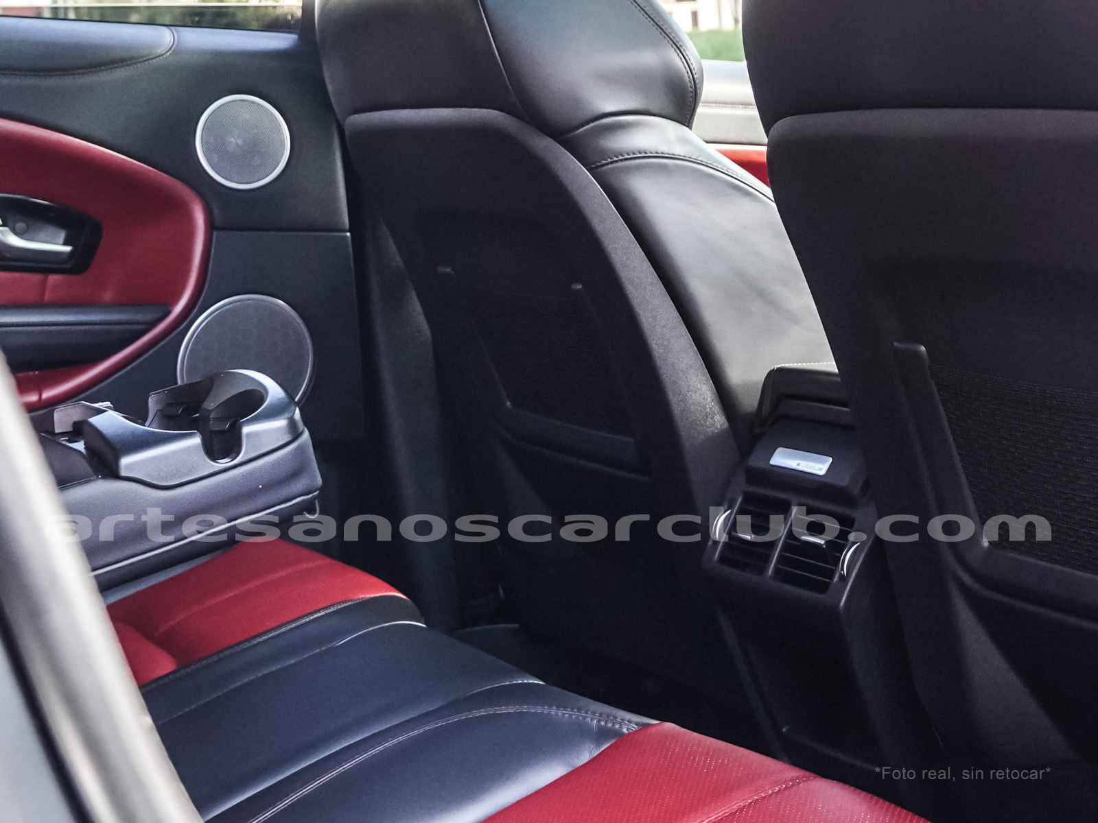 Interior de puertas en piel con costuras de contraste rojas.
