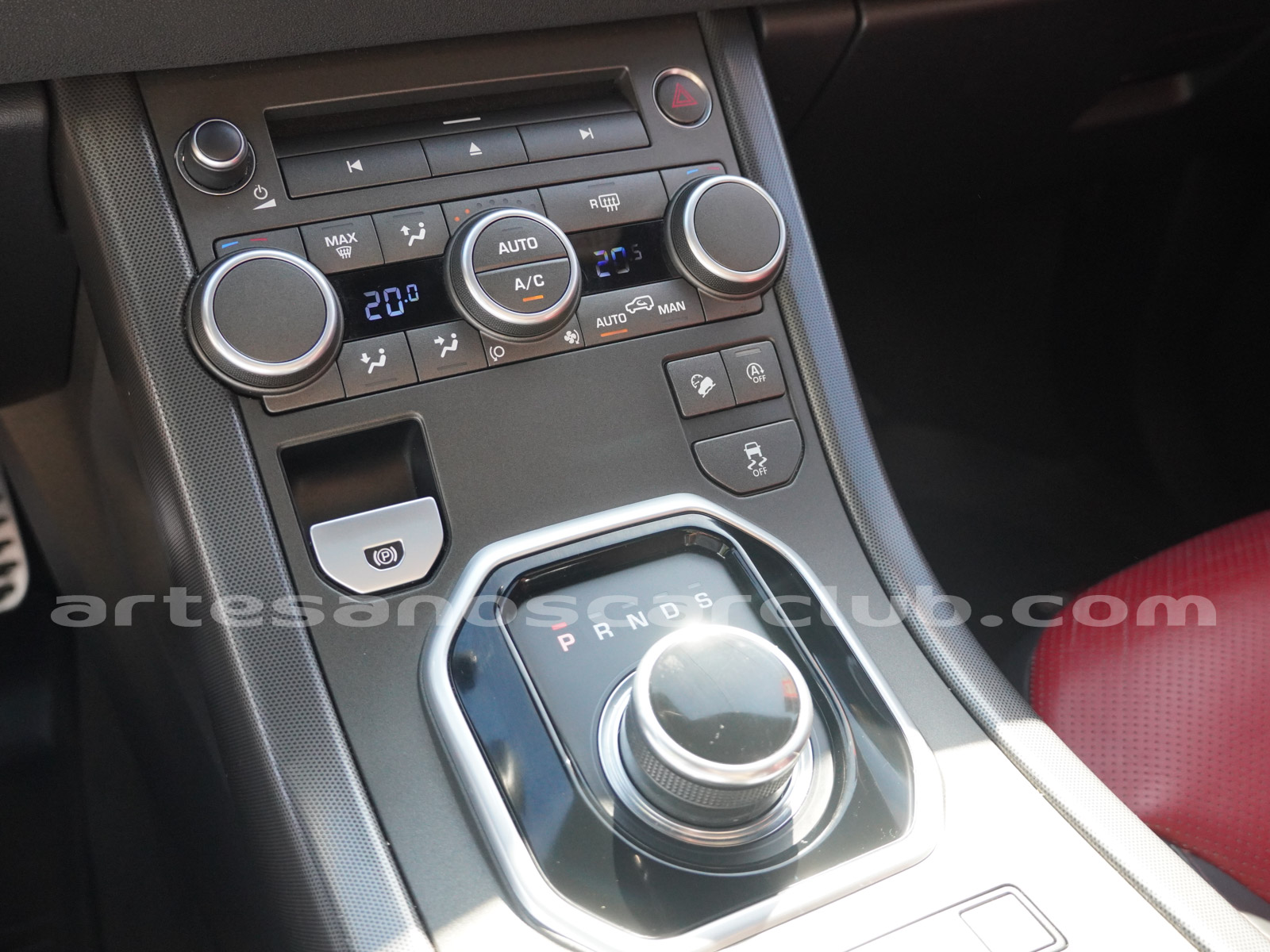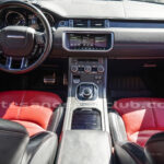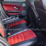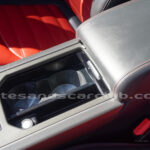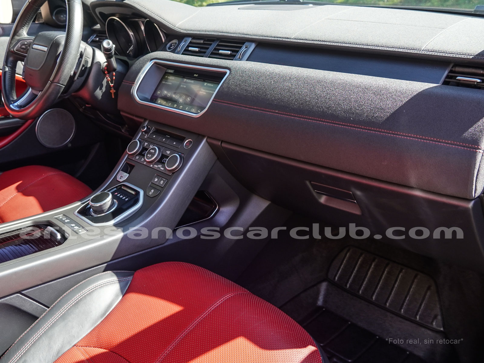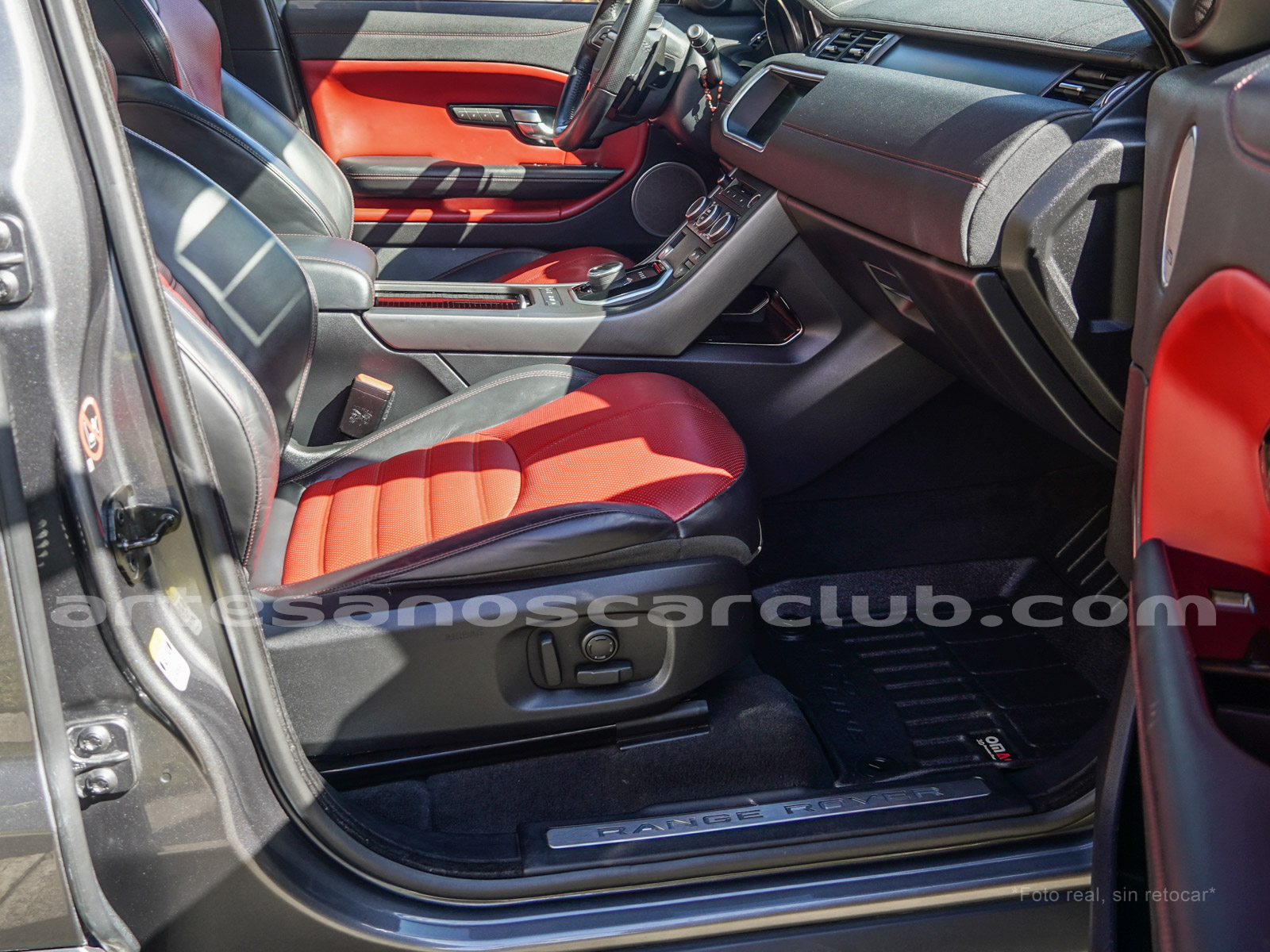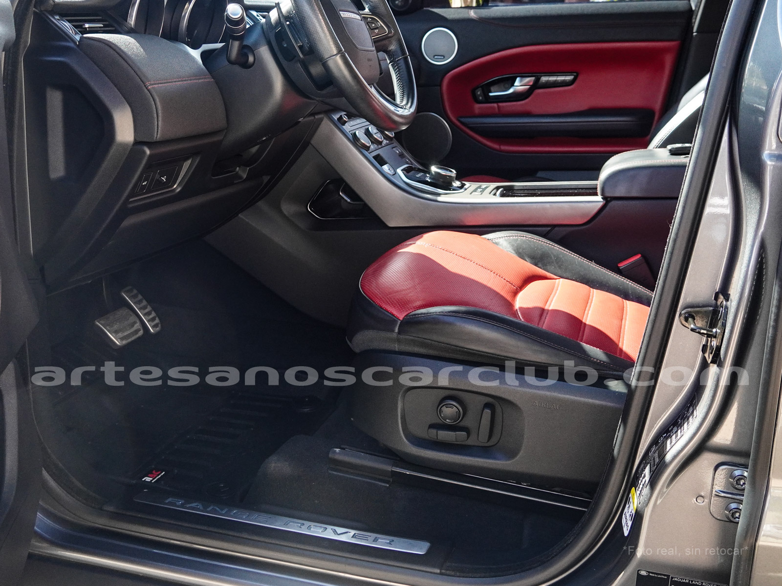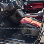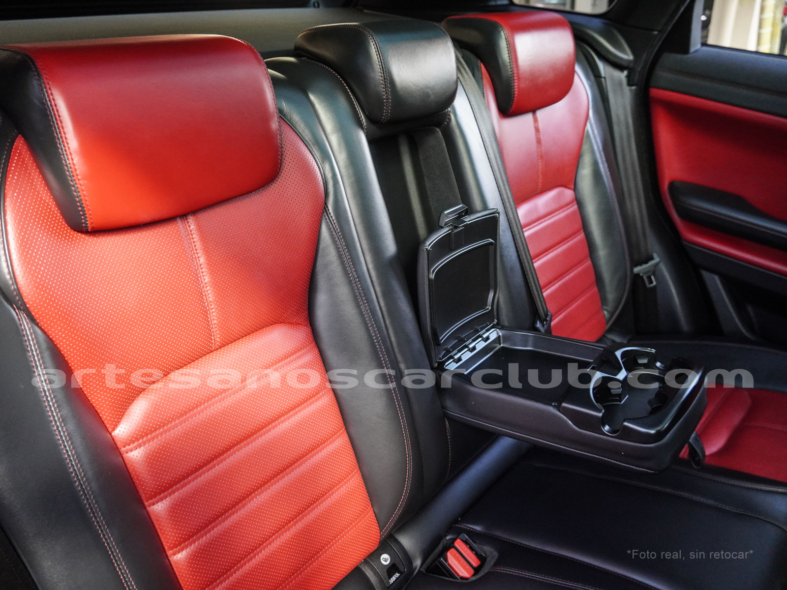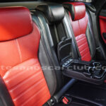 Cintura media de interior de vehículo en rojo «Pimento» y negro «Ebony» con costuras de alto contraste rojas.