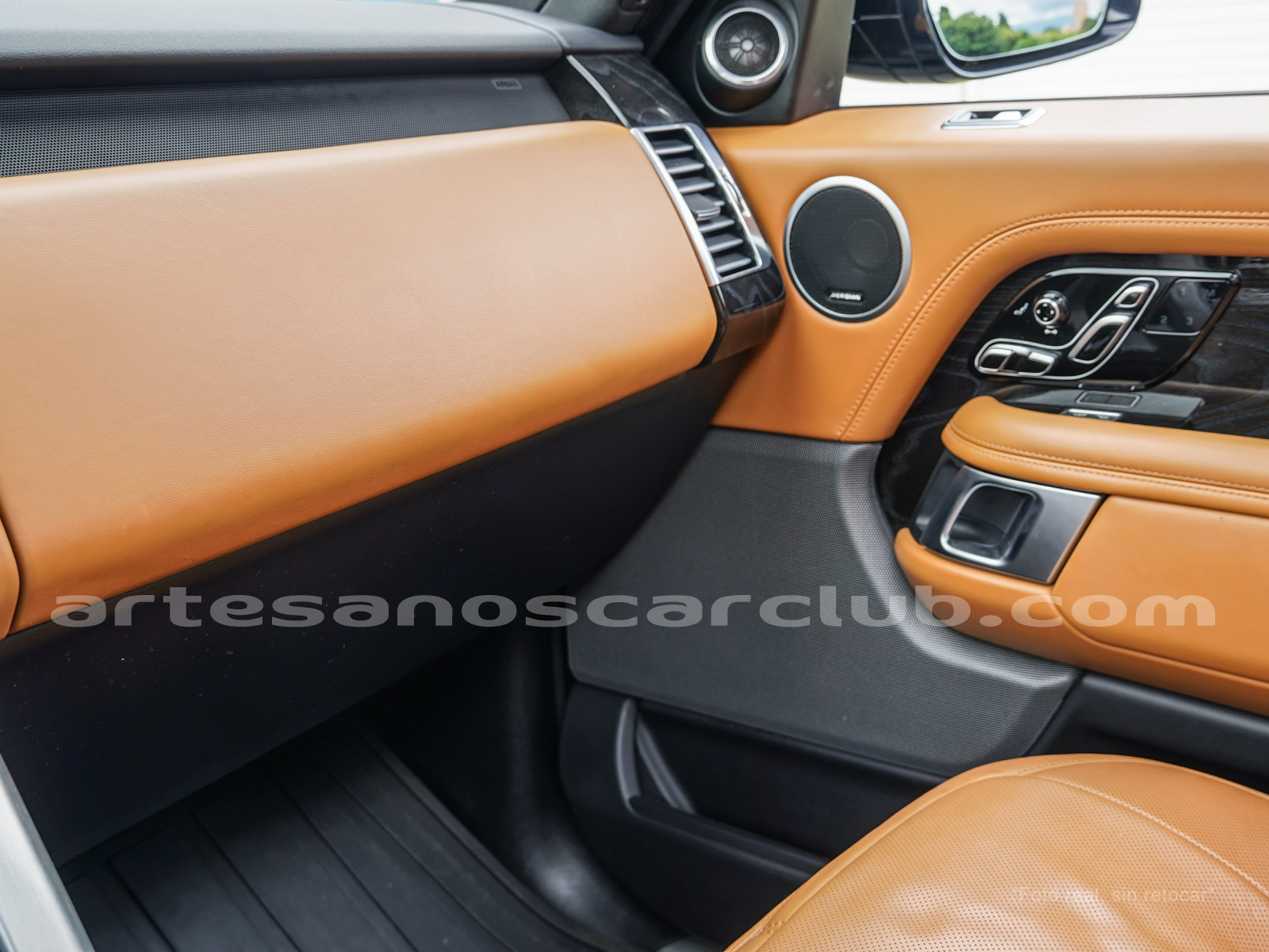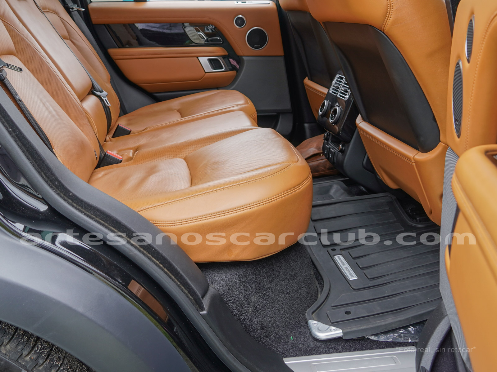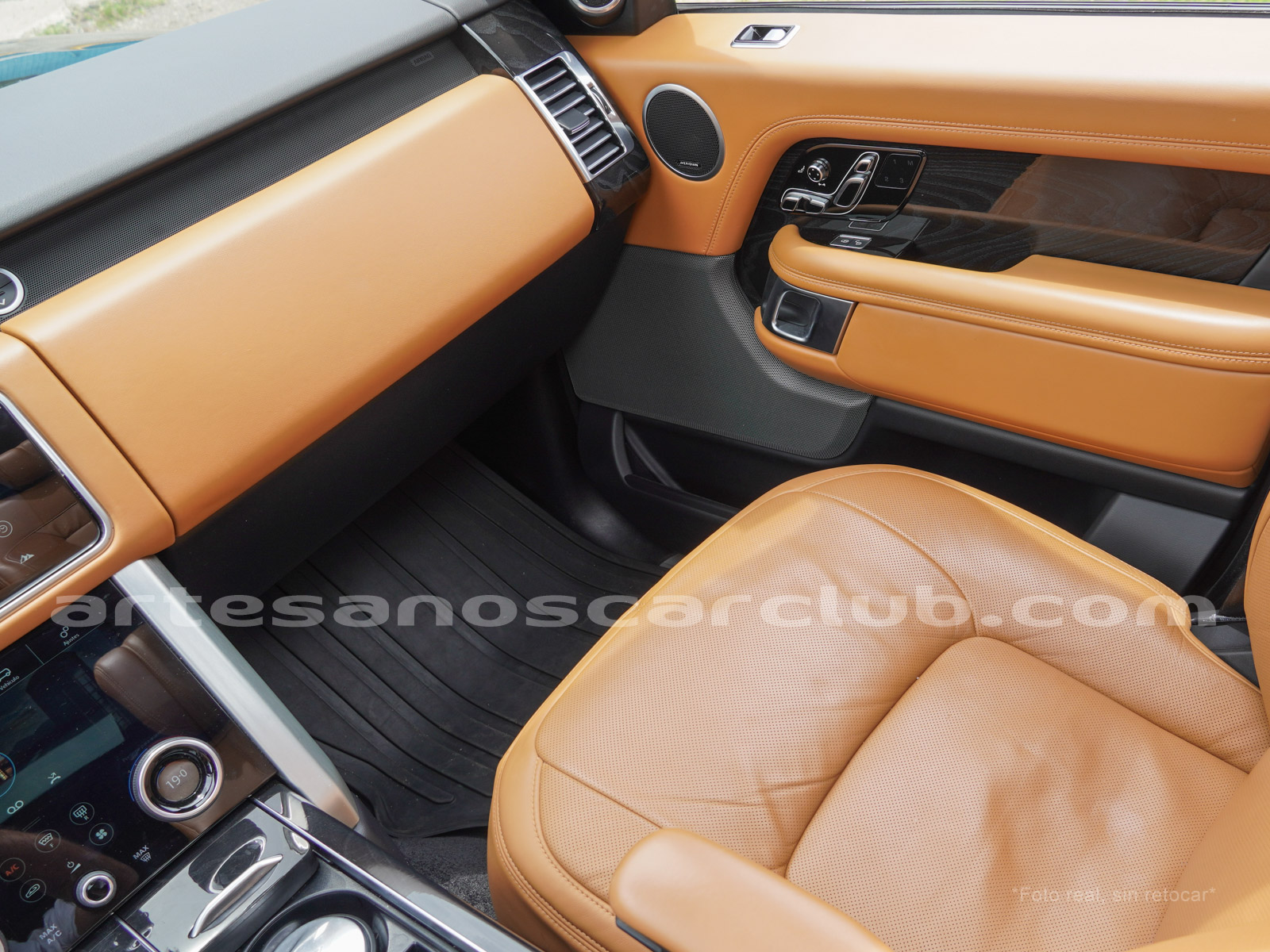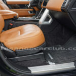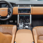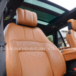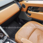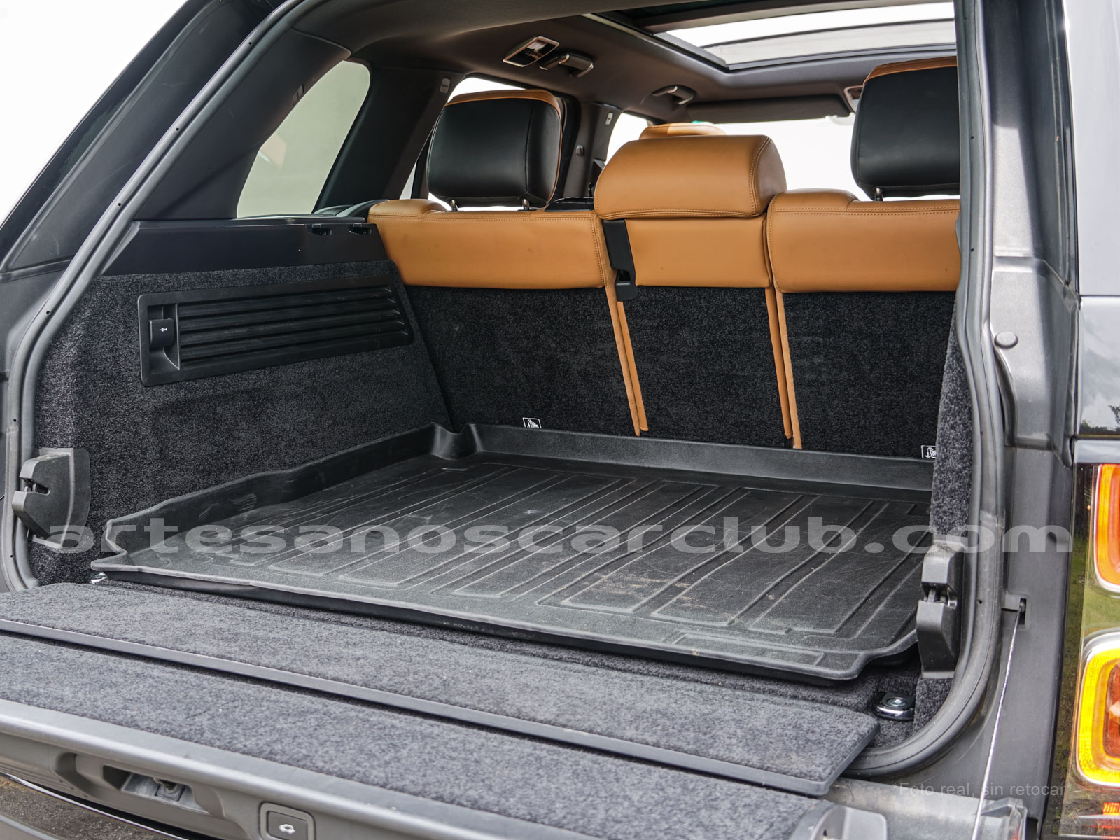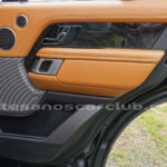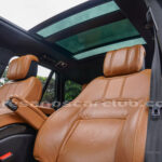 Tapicería en piel micro perforada marrón «Vintage Tang y negro «Ebony» , interior de techo en negro, alfombra principal en negro.