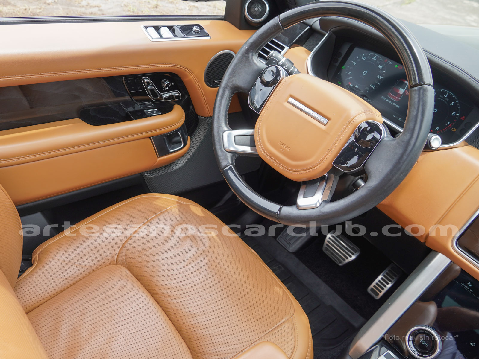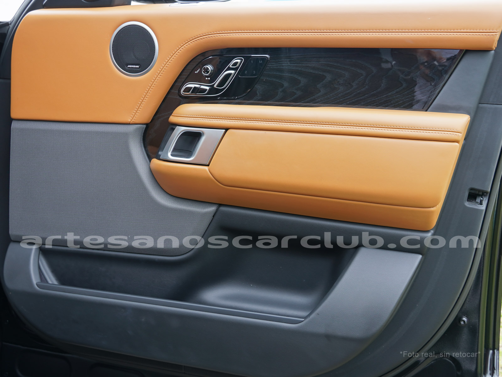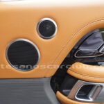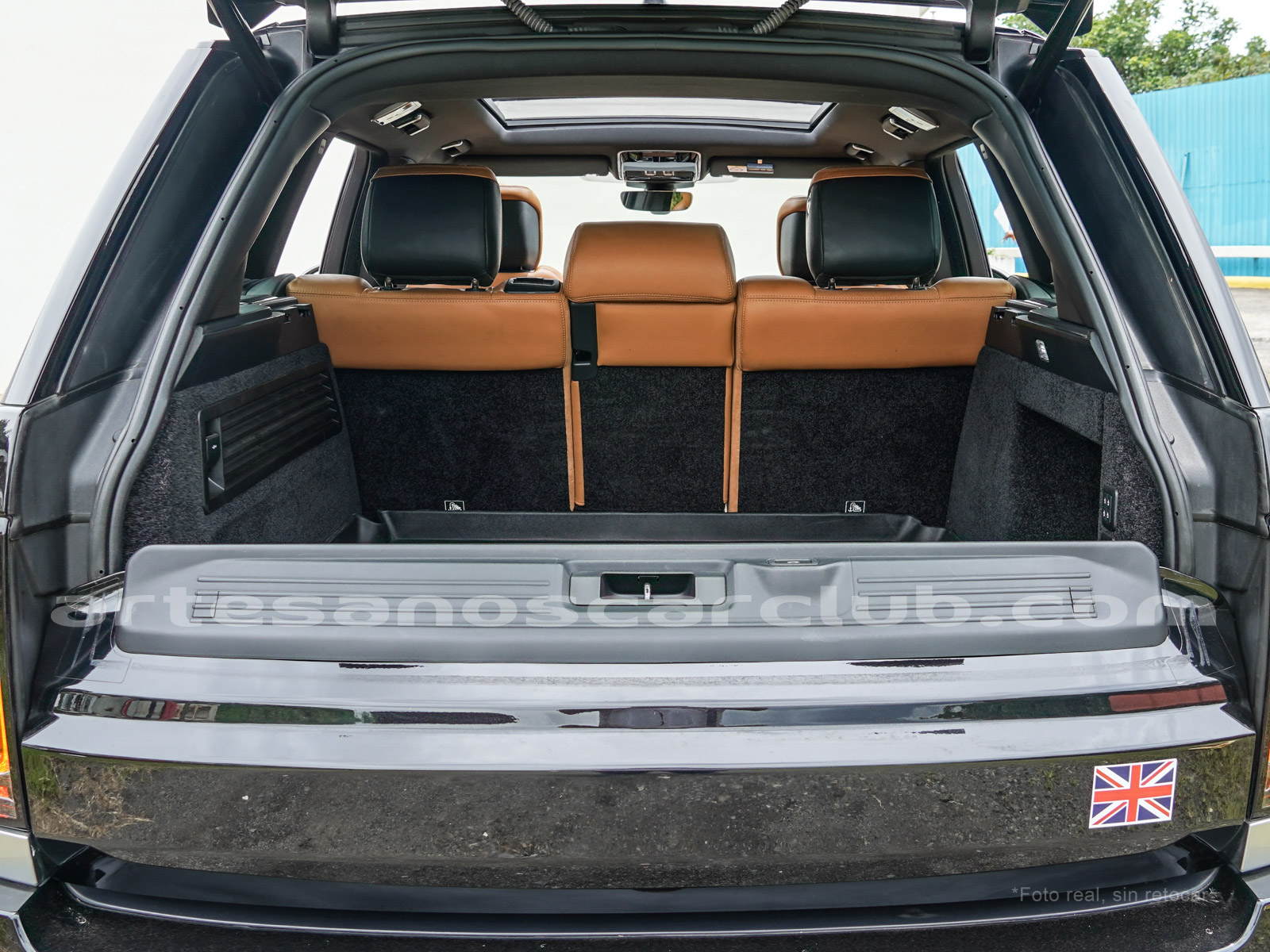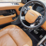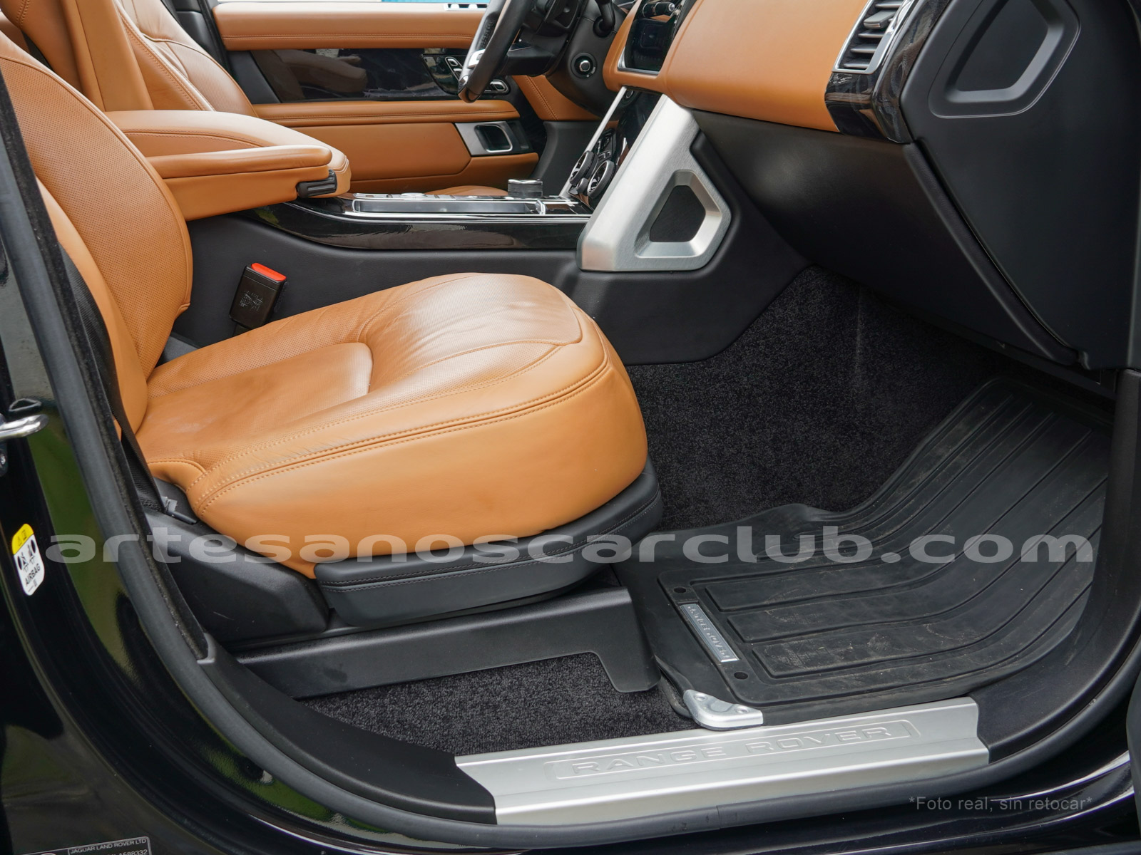 Tapicería en piel micro perforada marrón «Vintage Tang y negro «Ebony» , interior de techo en negro, alfombra principal en negro.