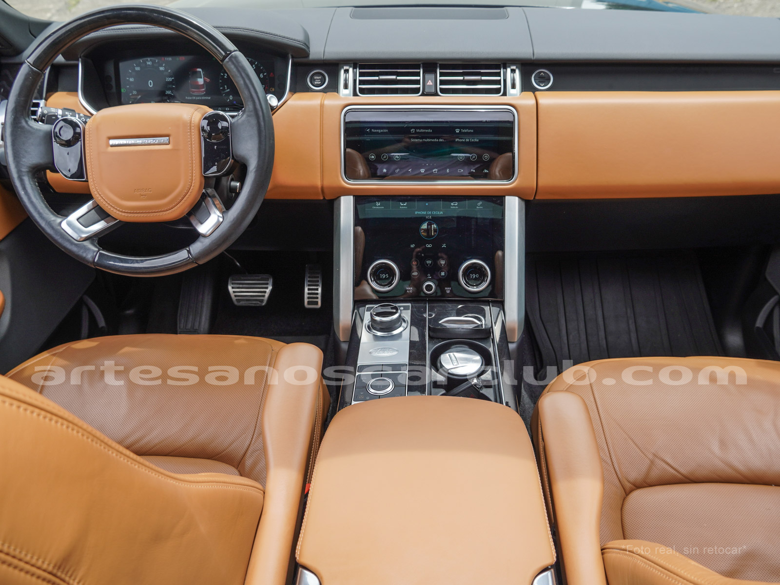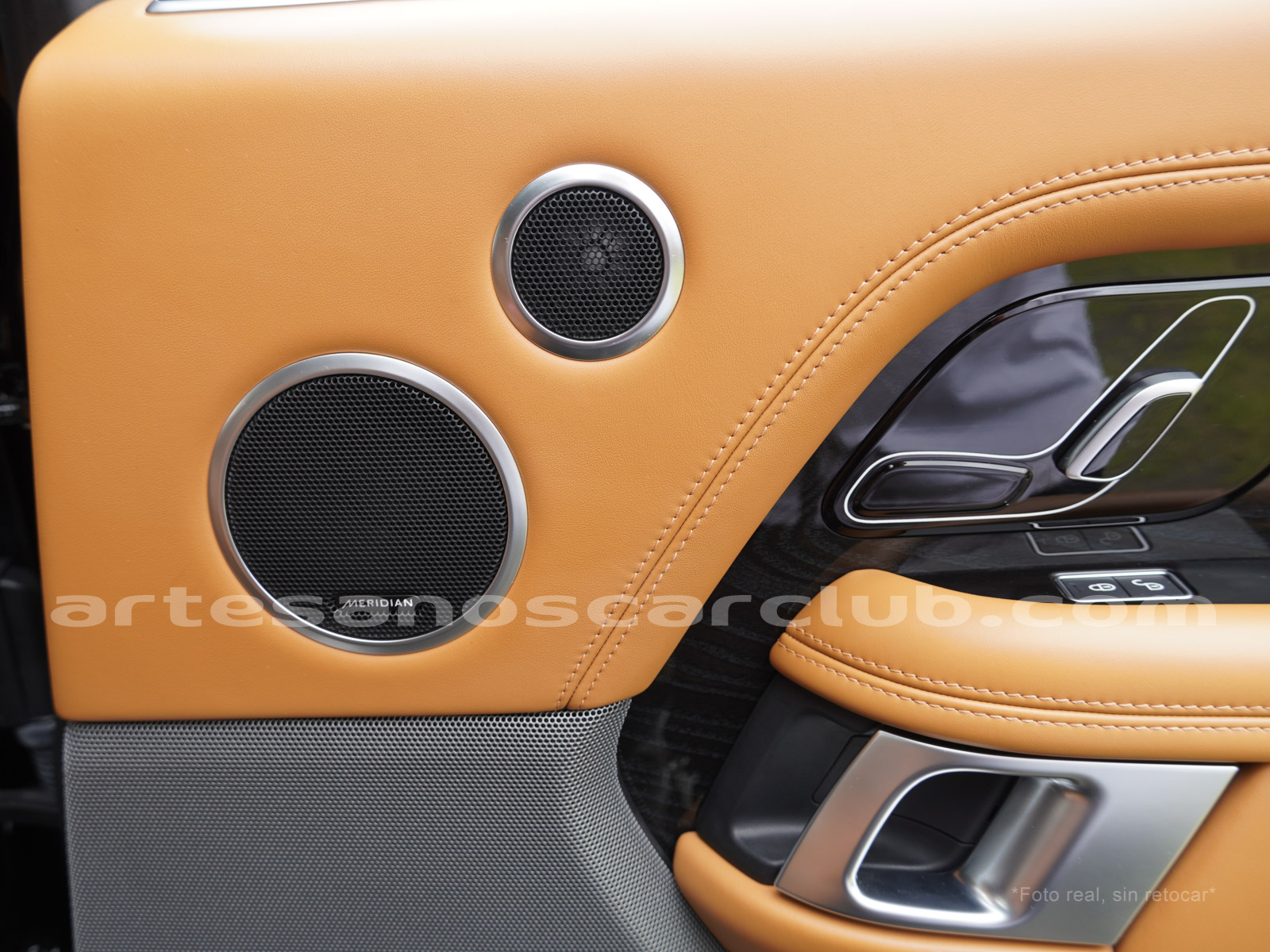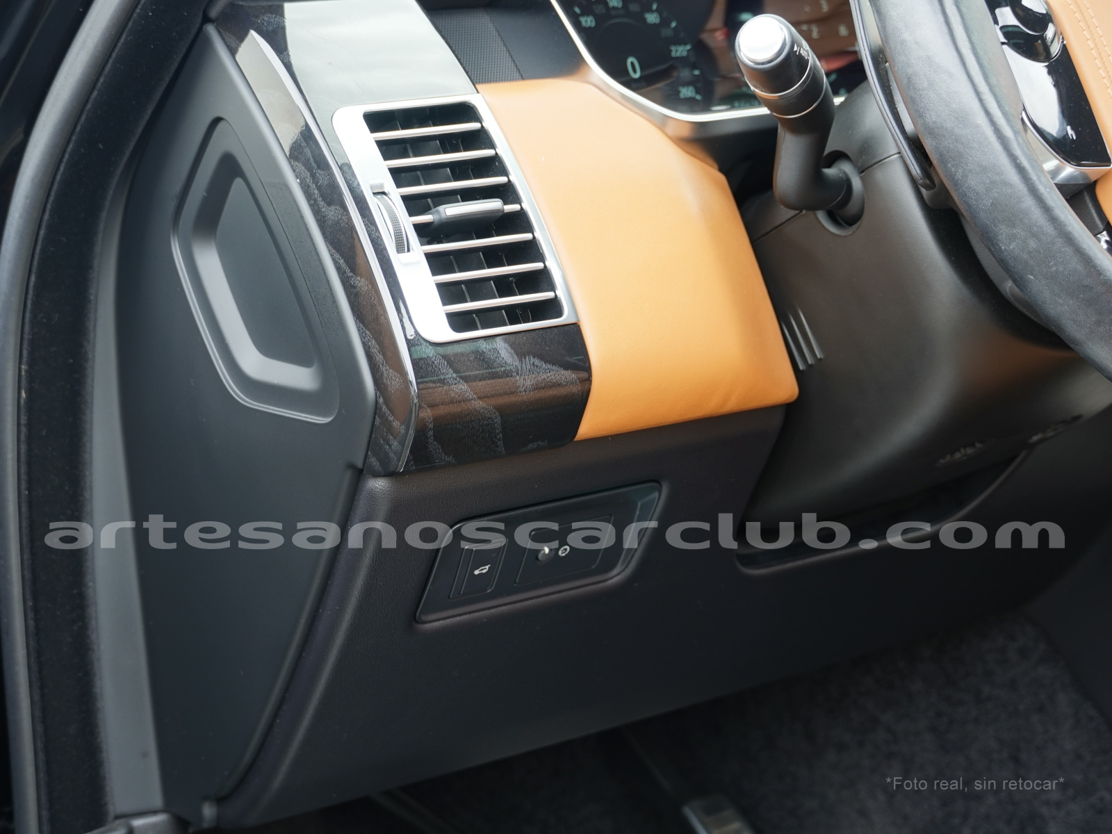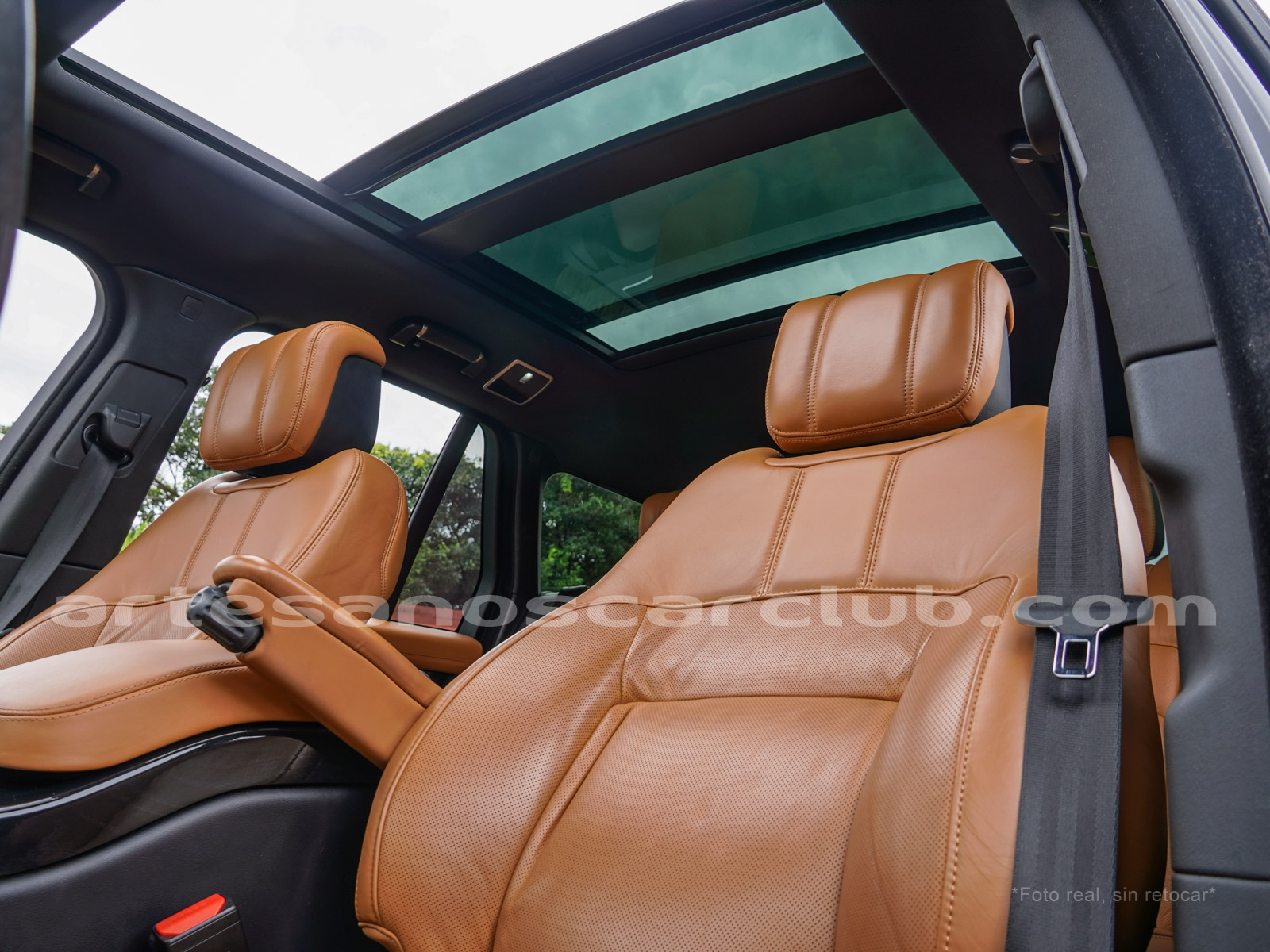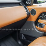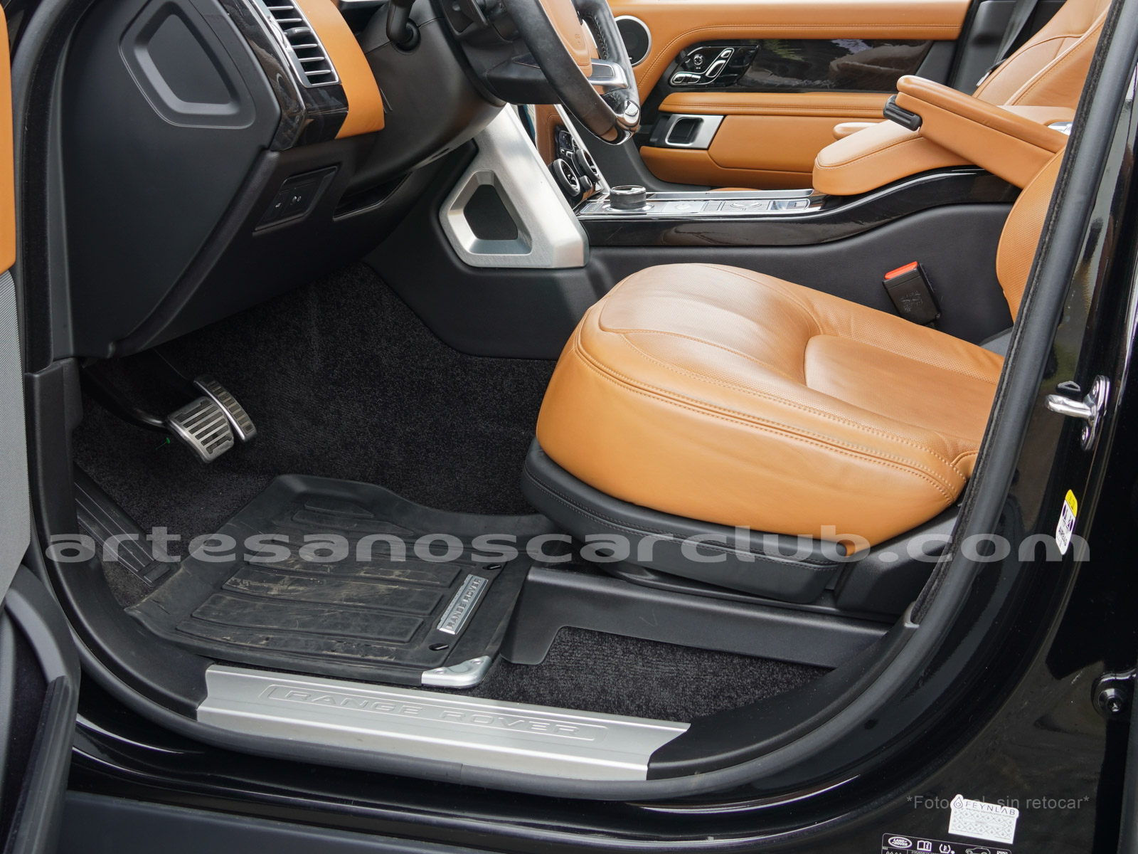 Tapicería en piel micro perforada marrón «Vintage Tang y negro «Ebony» , interior de techo en negro, alfombra principal en negro.