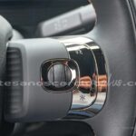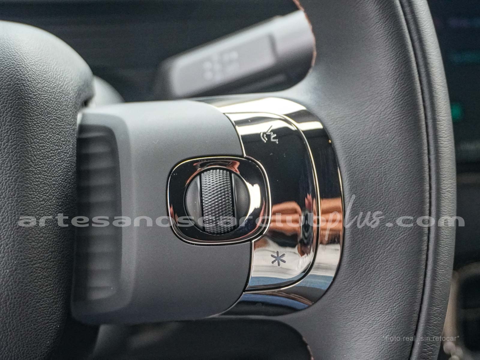 • Volante en símil piel negra con detalle decorativo en aluminio anodizado.