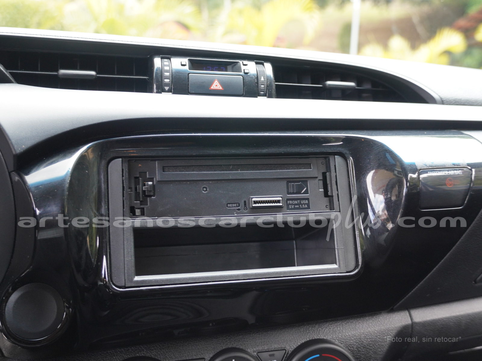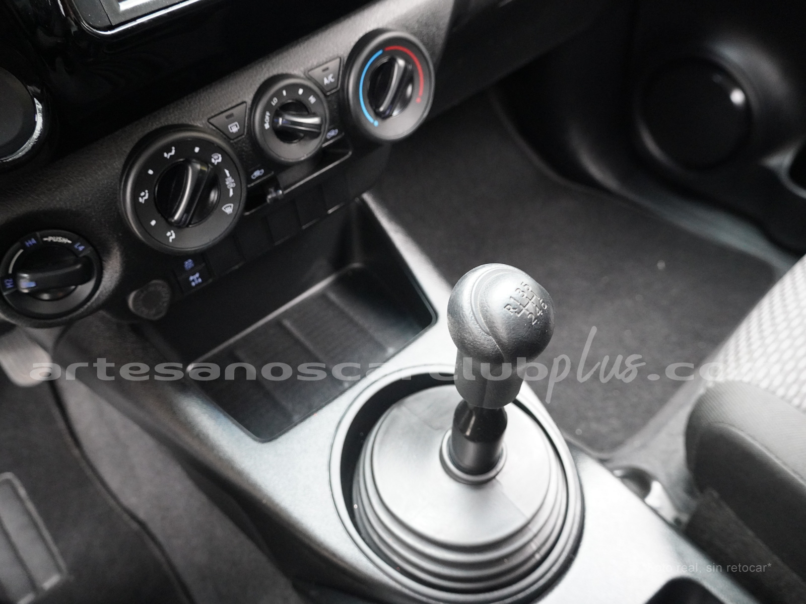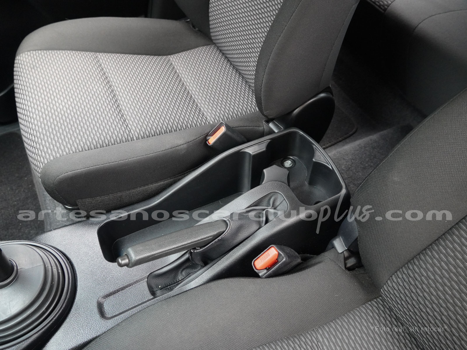 Consola central en plástico negro.