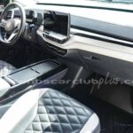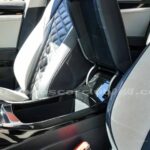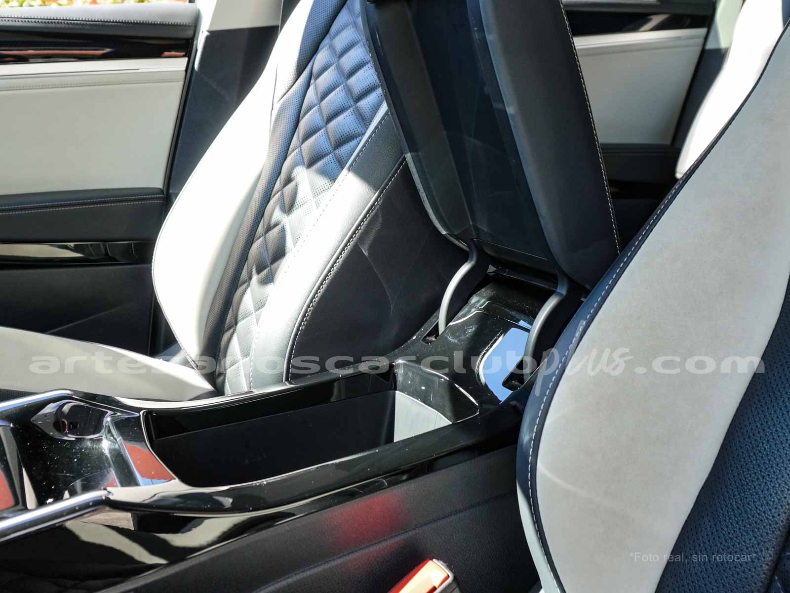 - Decoraciones de cintura media de interior de cabina en piel beige «Arena» y negra y texturizado de microfibra negra, con moldura en piano brillante.