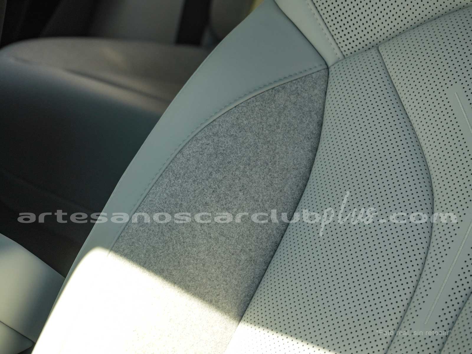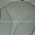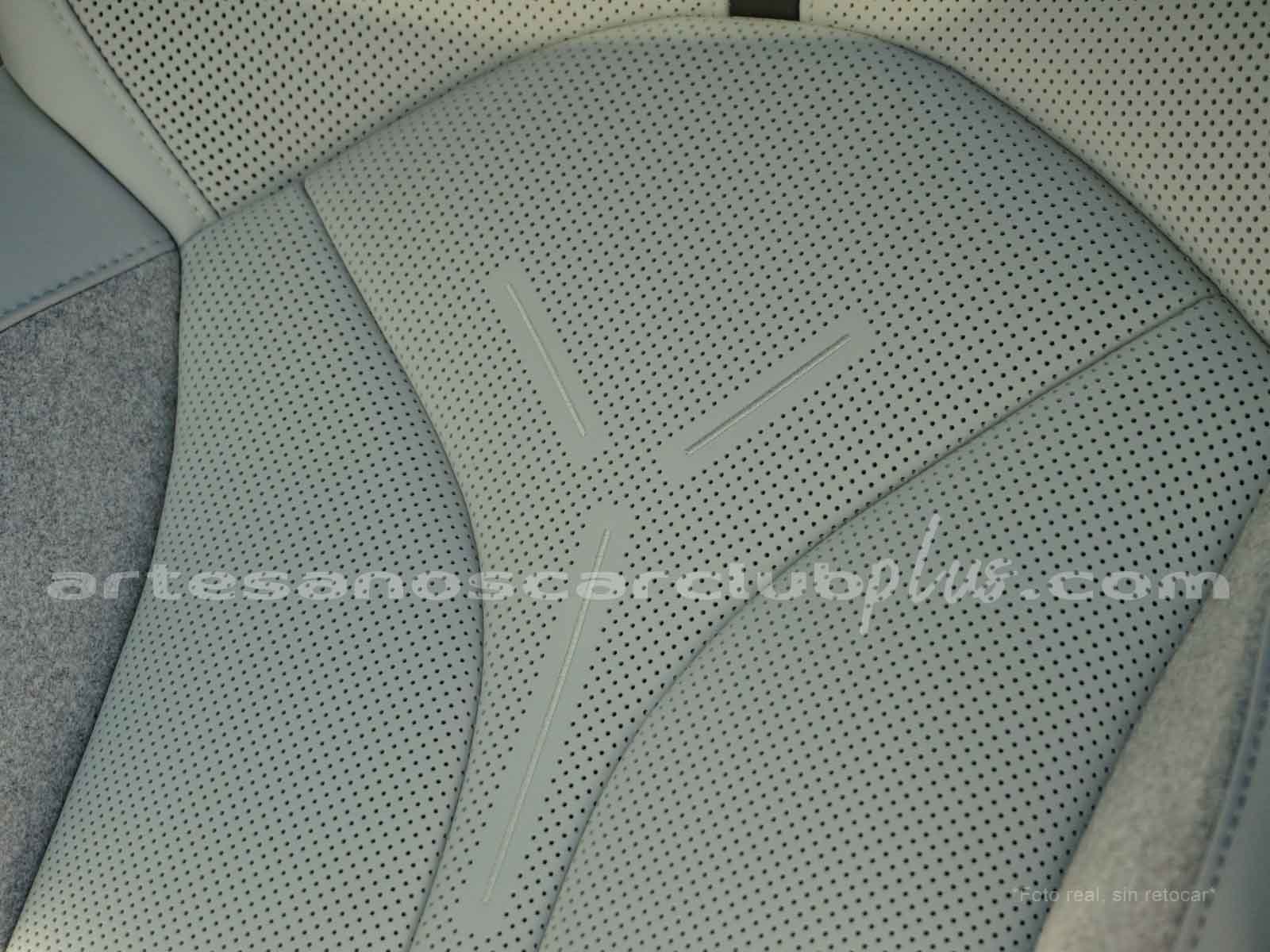 Sillas microperforadas en piel Nappa microperforada color blanco con detalles decorativos en negro y aluminio.