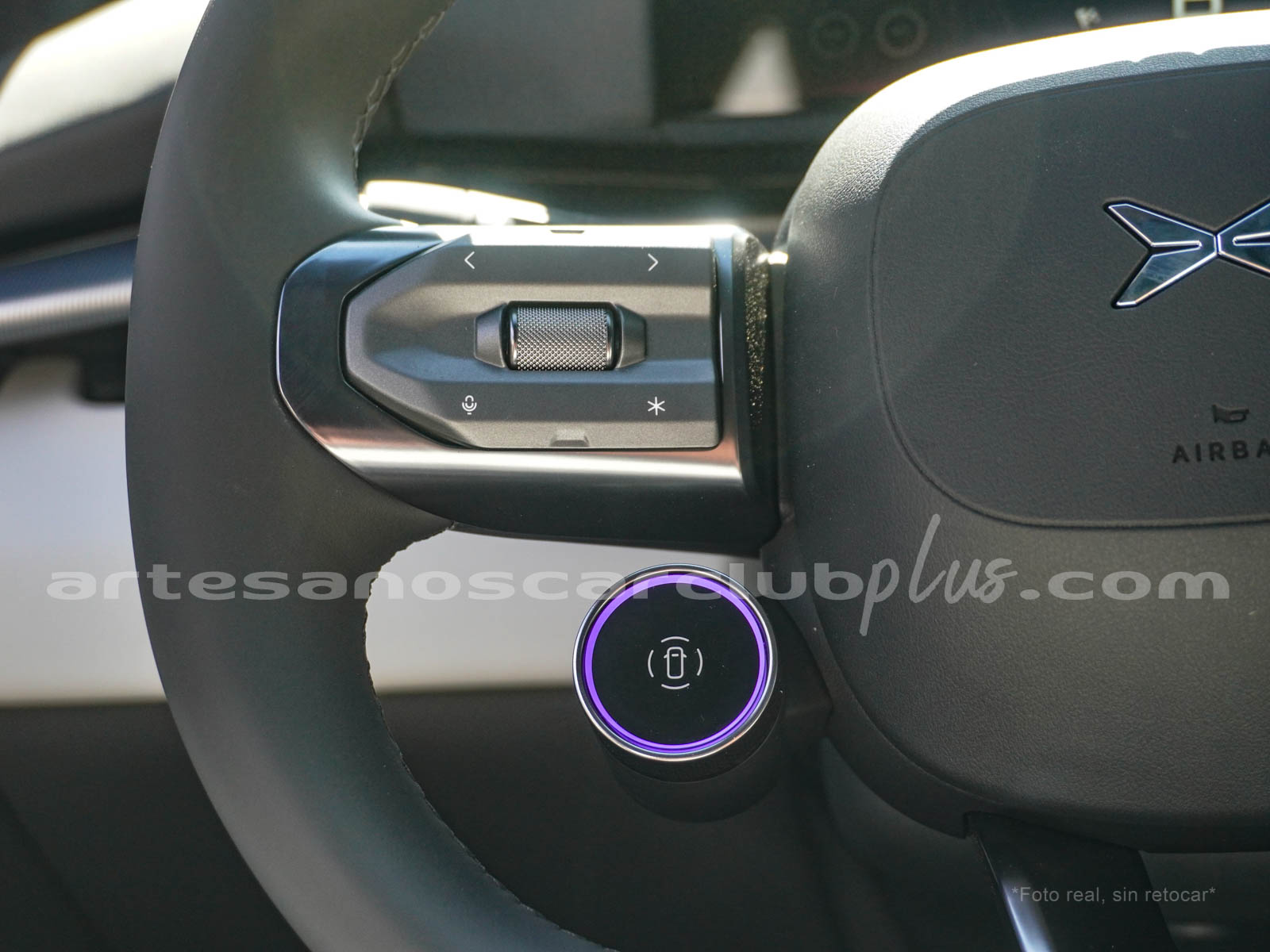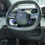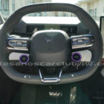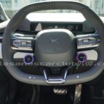 Volante en piel negra con detalle decorativo en aluminio satinado con botones de mando retroiluminados.