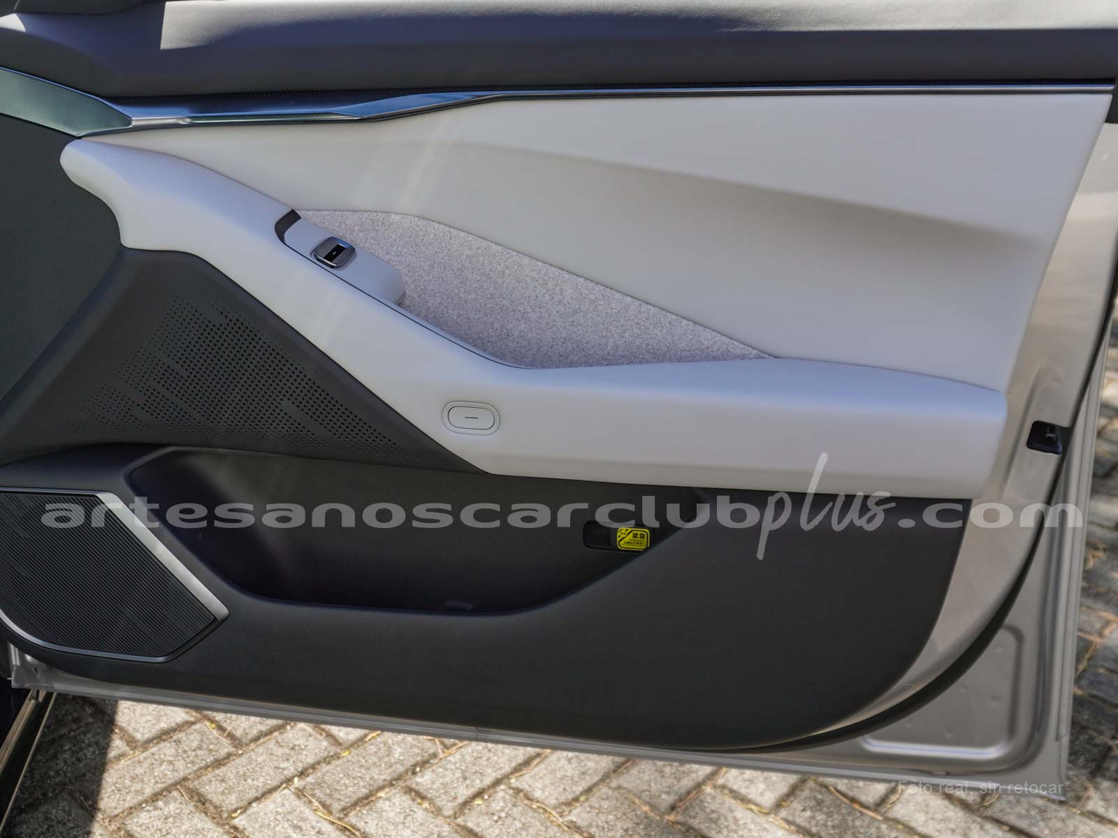 Dash y cintura media en color negro/blanco con áreas decorativas en piano negro brillante, con acabados en piel decorada de alto contraste.